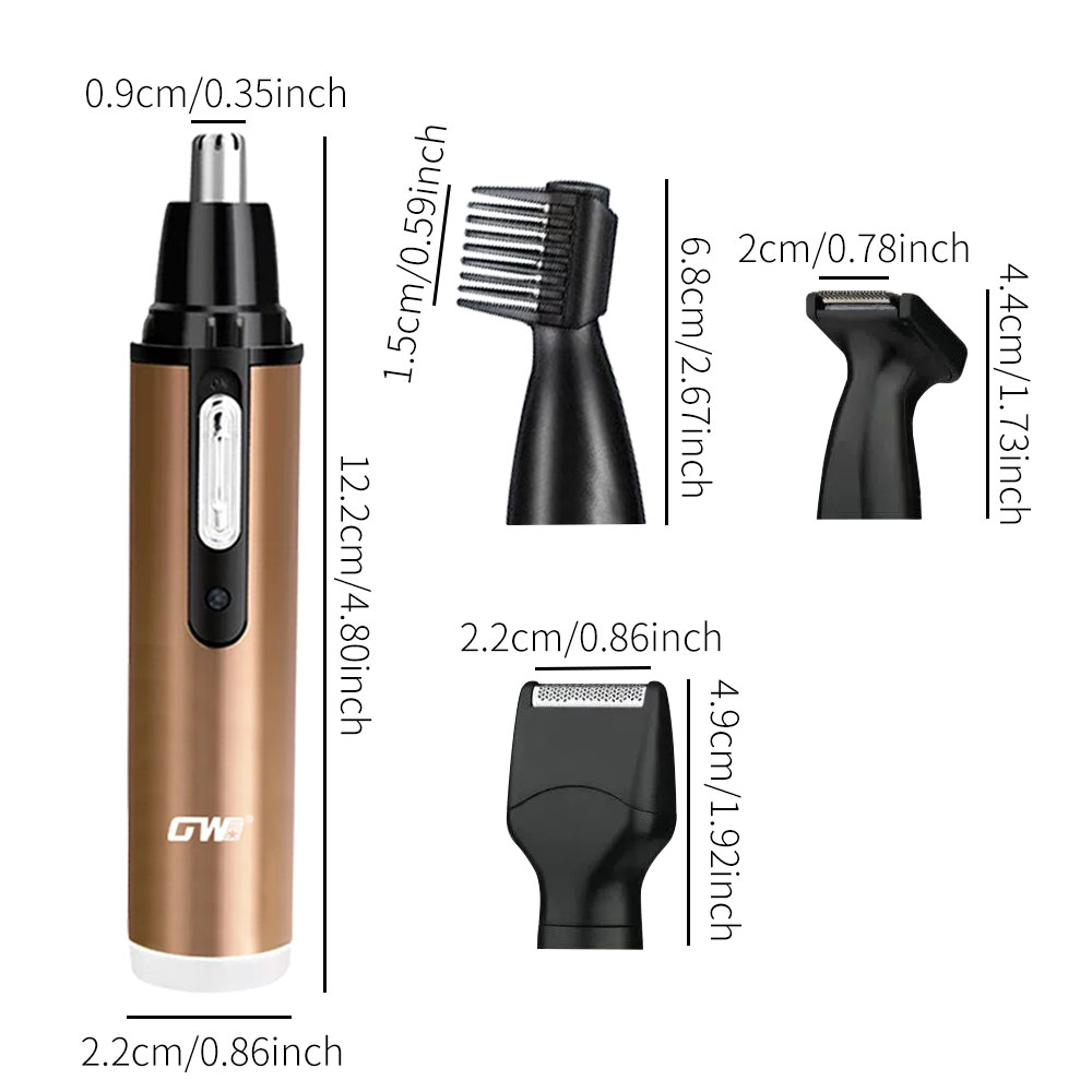 【四合一鼻毛器】专业修剪,安全无忧!采用德国精工刀头,快速剃净鼻毛、耳毛。IPX7级防水,干湿两用,清洁更便捷。超长续航,一次充电使用30天。解决手动修剪不净、易伤皮肤的痛点。USB充电8小时60分钟 频率:50/60hz 功率:3w 电压:110v-220v 盒子尺寸:19.5*13.5*3.5 箱规:69*41*36.5 毛重:21.6 净重:20