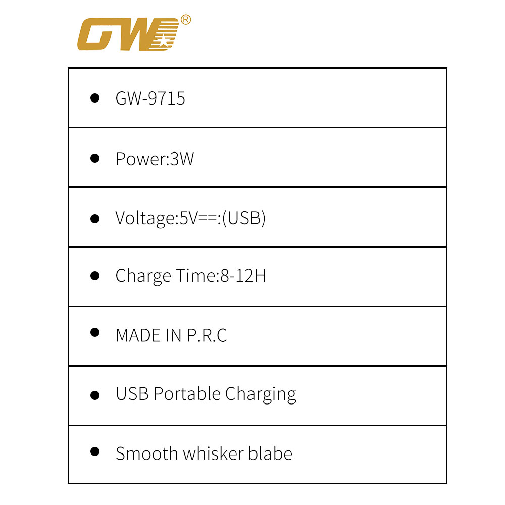 【100%精准剃须】全新升级5层刀片剃须刀,超薄刀网设计,轻松捕捉每一根胡须,剃须更干净。智能防夹须系统,减少皮肤拉扯,敏感肌也适用。IPX7级防水,干湿双剃,洗澡也能用。USB充电 电压:5v 功率:3w 充电时长:8-12小时 盒子尺寸:11*14*2.5 箱规:48*36*27 毛重:14.5 净重:13