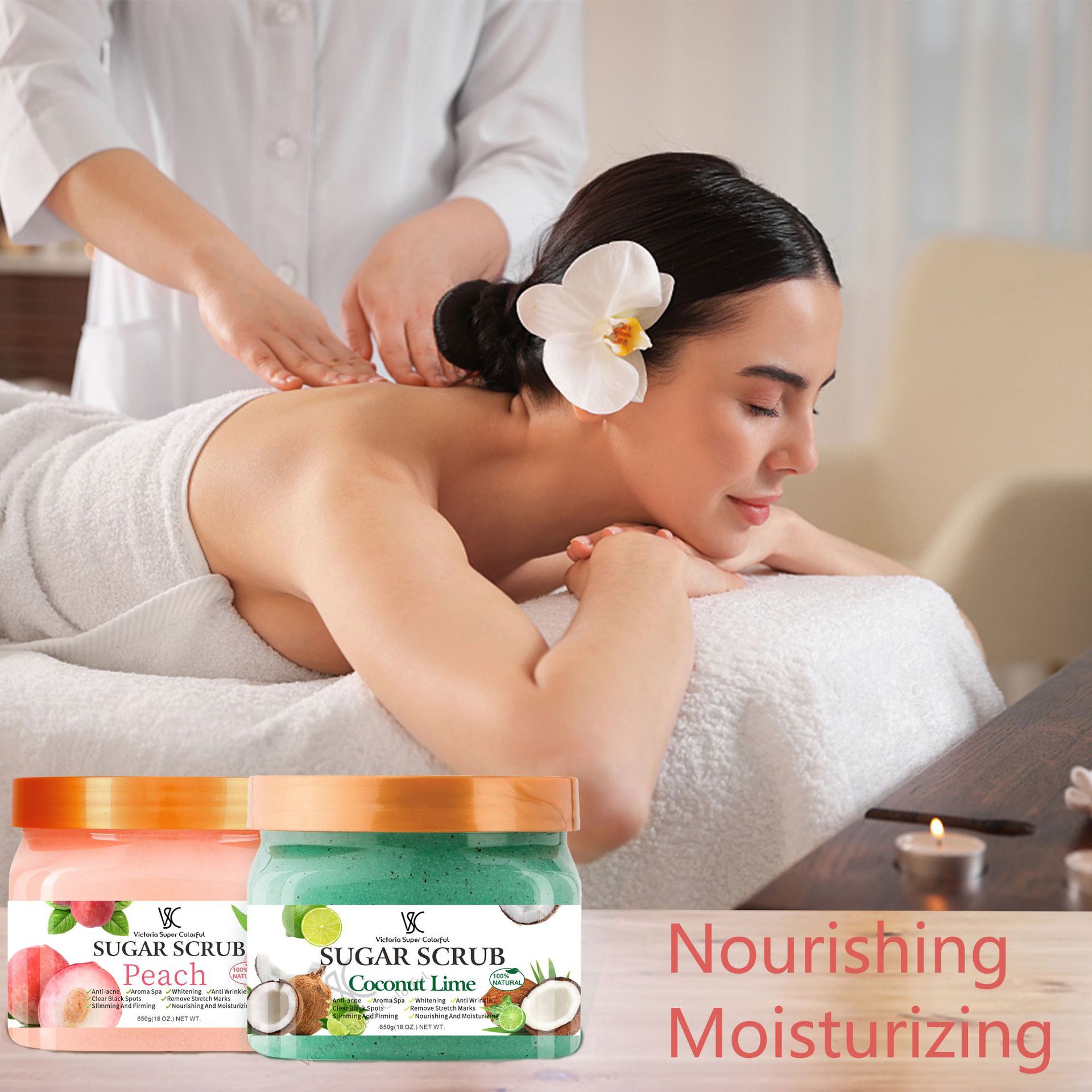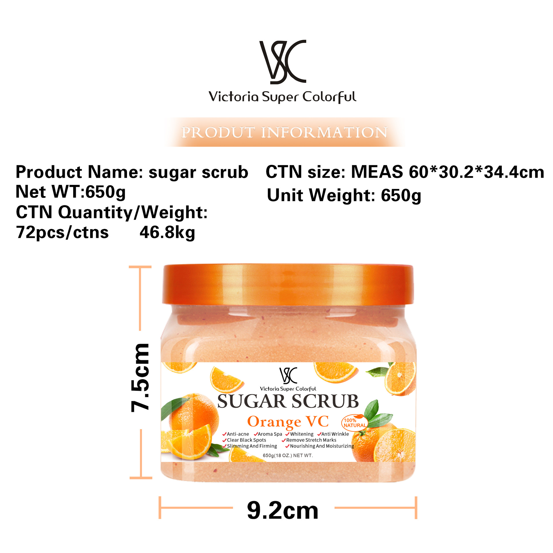 产品名称:650g磨砂糖沐浴盐浴盐 品牌:vsc单品毛重: 650g 净含量:650g装箱规格 :72pcs/ctns 箱重46.8箱单品尺寸 :7.5*9.2cm装箱尺寸 MEAS 60*30.2*34.4cm
