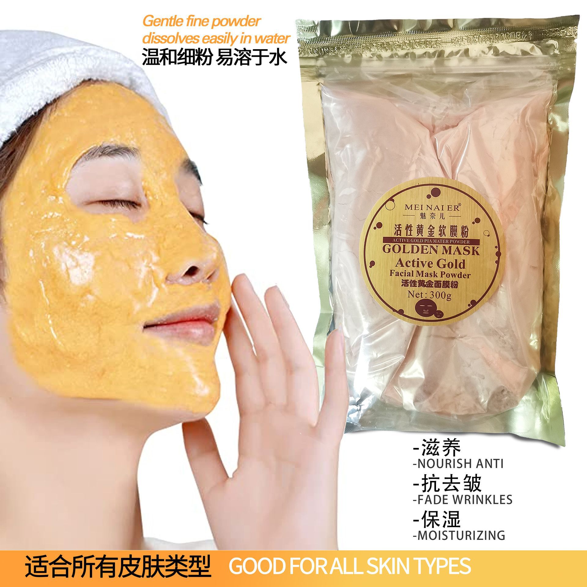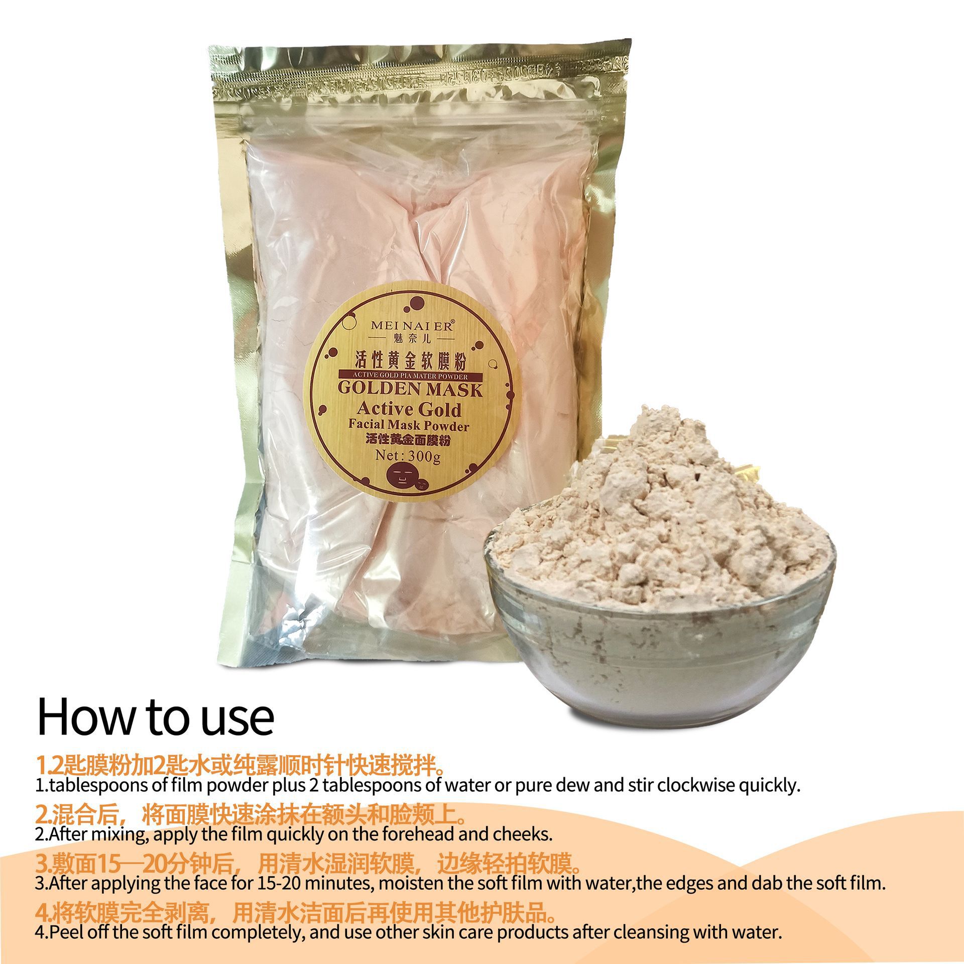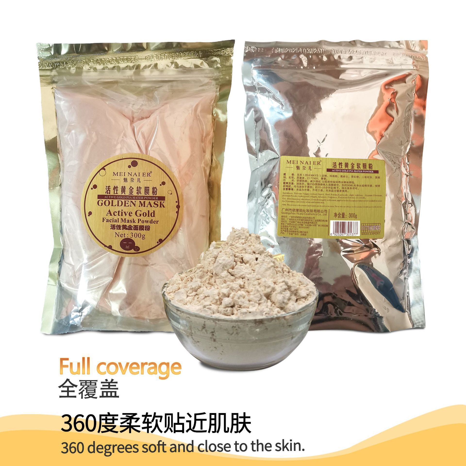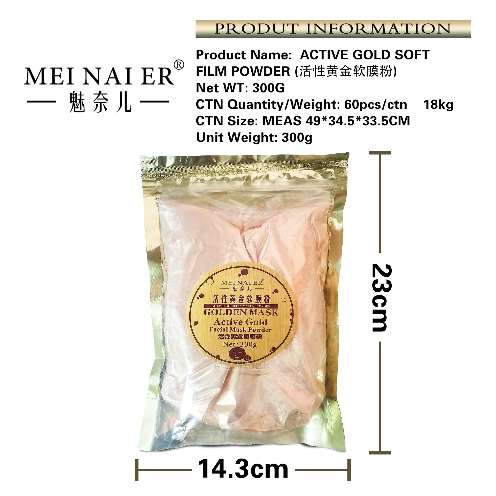 产品名称:300g24K黄金面膜粉 品牌:DRMEINAIER单品毛重 :300g 净含量:300g装箱规格: 60pcs/ctns 箱重18kg/箱单品尺寸:23*14.5 cm装箱尺寸 MEAS49*34.5*33.5cm包装:如图 可按客户需求来订做