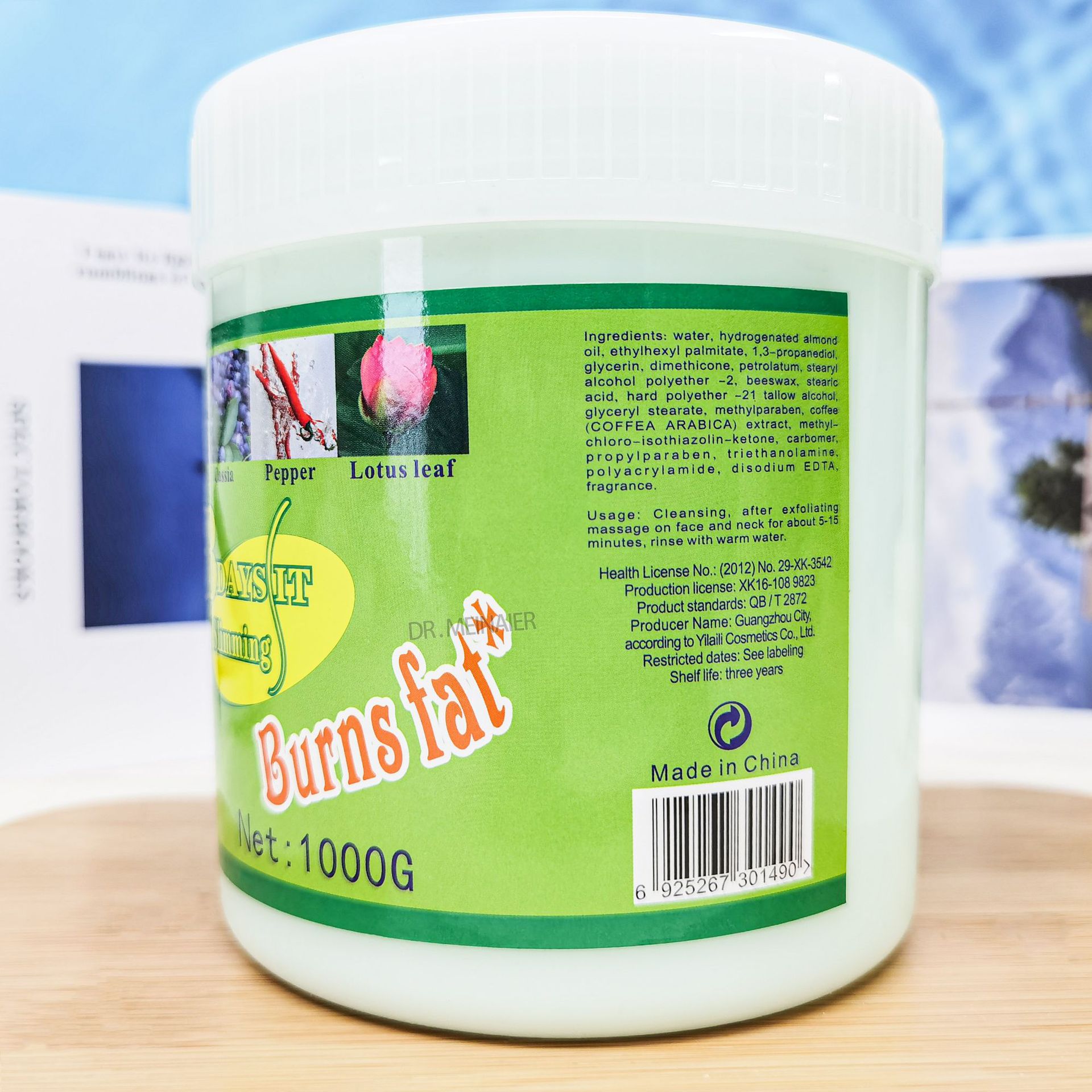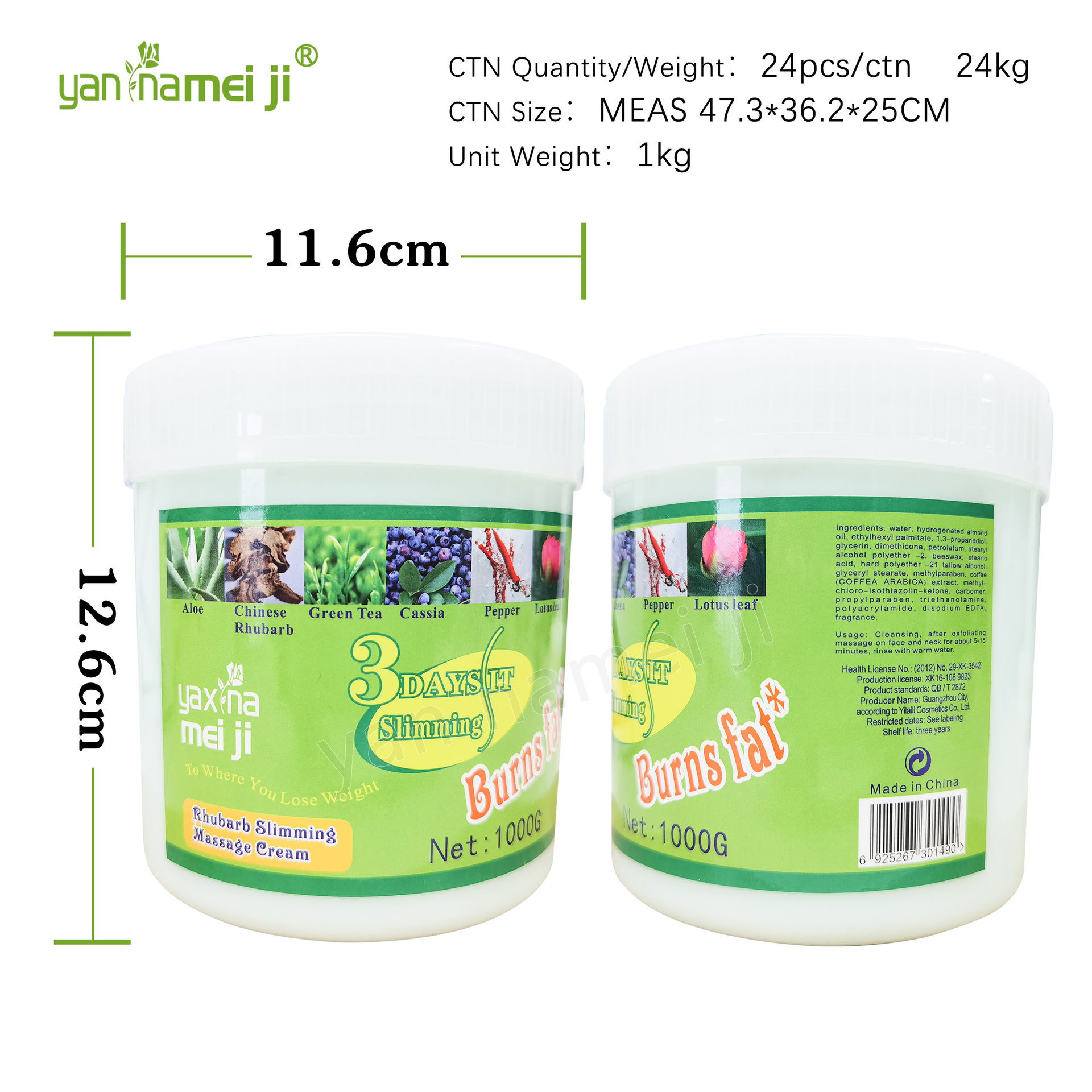 产品名称 1000g大黄按摩膏 品牌:妍娜美肌单品毛重 1000g 净含量1000g装箱规格 24pcs/ctns 箱重24kg箱单品尺寸 11.6*12.6cm装箱尺寸 MEAS48.5*37*27.5 CM包装:如图 可按客户需求来订做