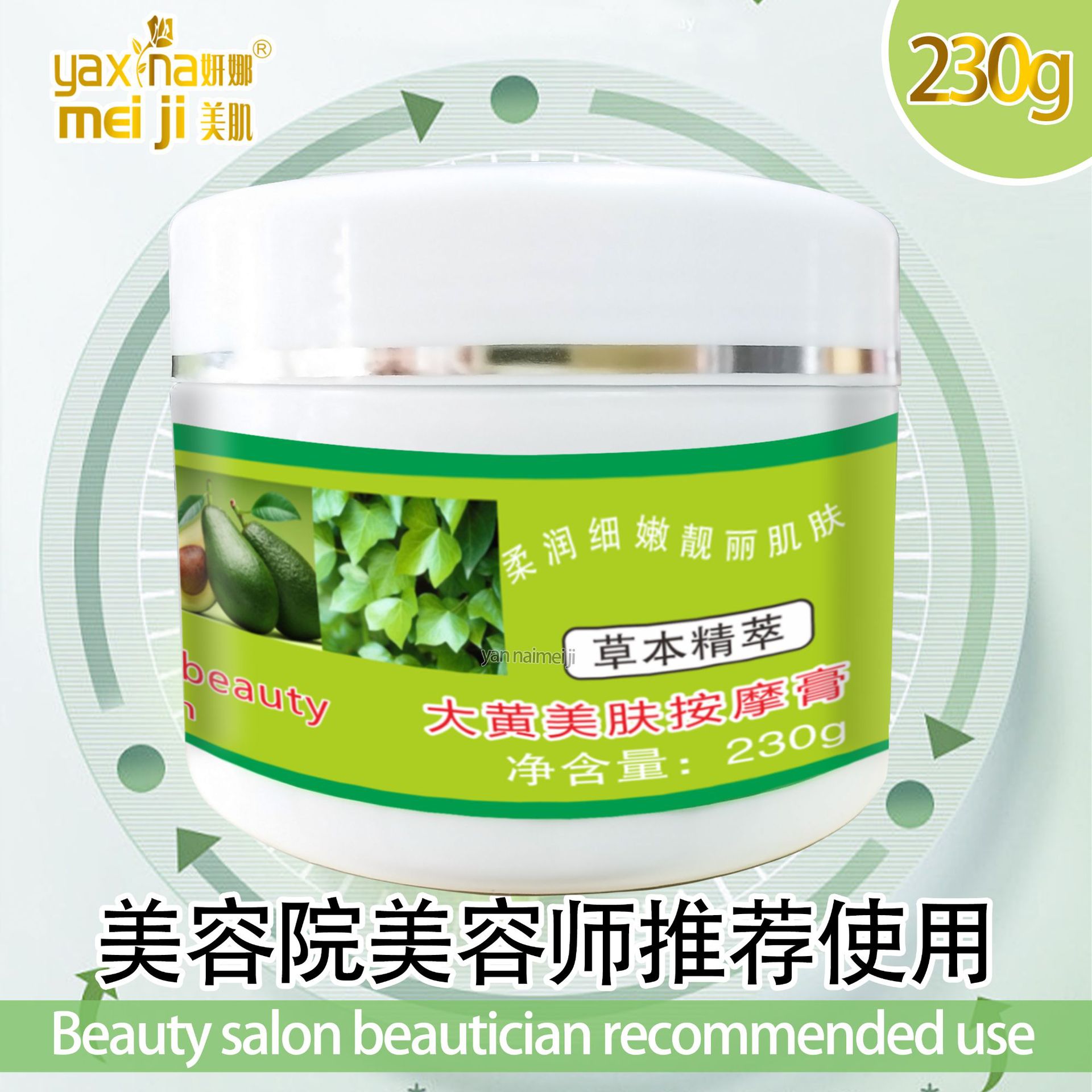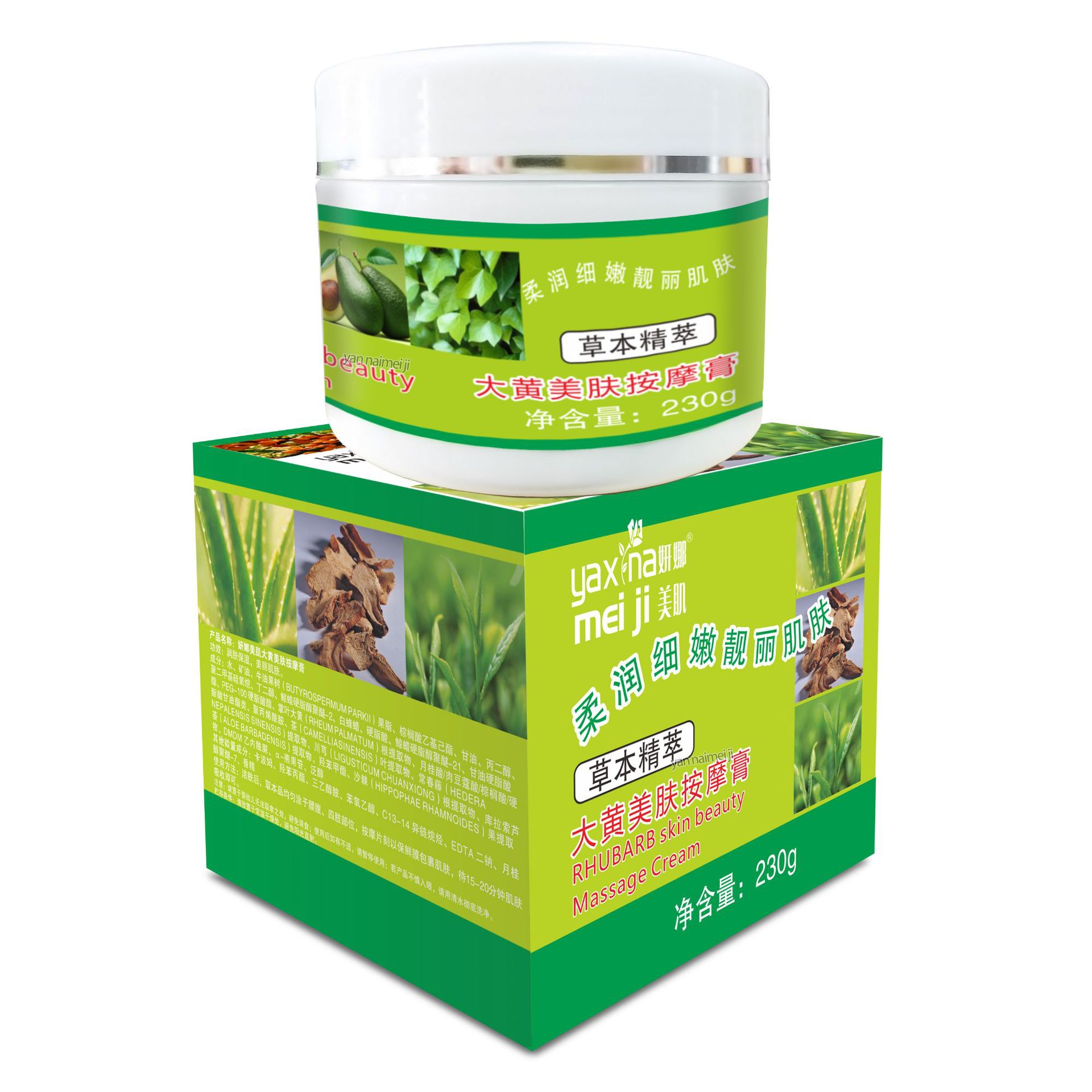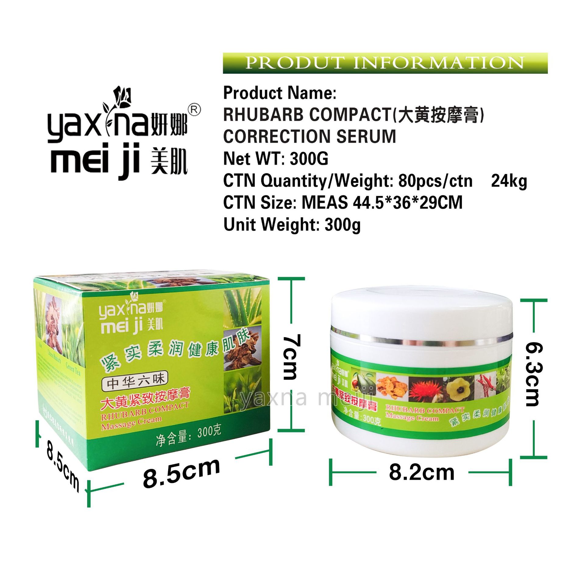 产品名称: 300g大黄按摩膏 品牌:YANNAMEIJI单品毛重 :300g 净含量:300g装箱规格:80pcs/ctns 箱重24kg箱单品尺寸 8.5*8.5*7 8.2*6.3cm装箱尺寸 MEAS 44.5*36*29 cm包装:如图 可按客户需求来订做
