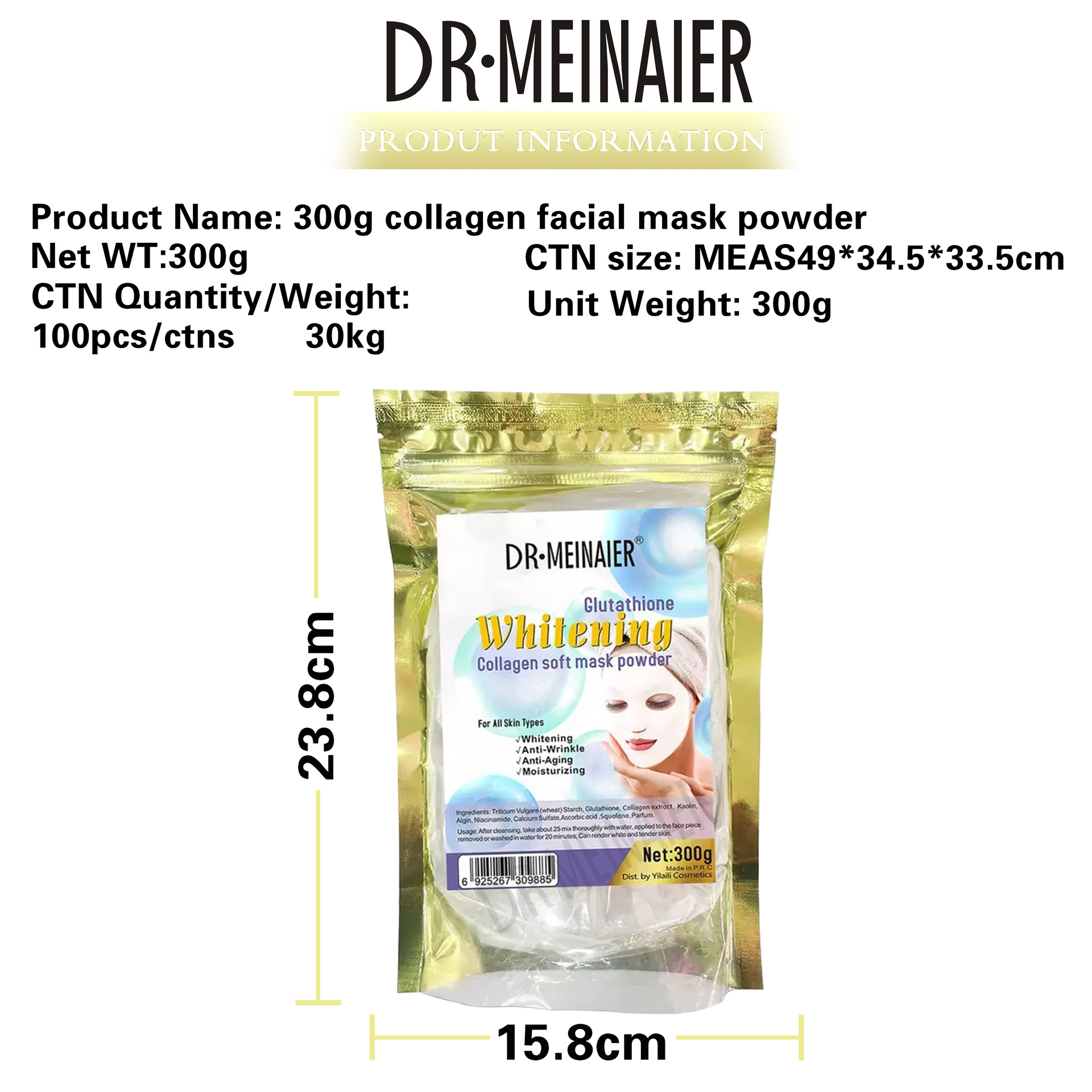 产品名称 :300g胶原蛋白面膜粉 品牌:DRMEINAIER单品毛重 :300g 净含量:300g装箱规格 :100pcs/ctns 箱重30kg箱单品尺寸: 15.8*23.8装箱尺寸 MEAS49*34.5*33.5cm
