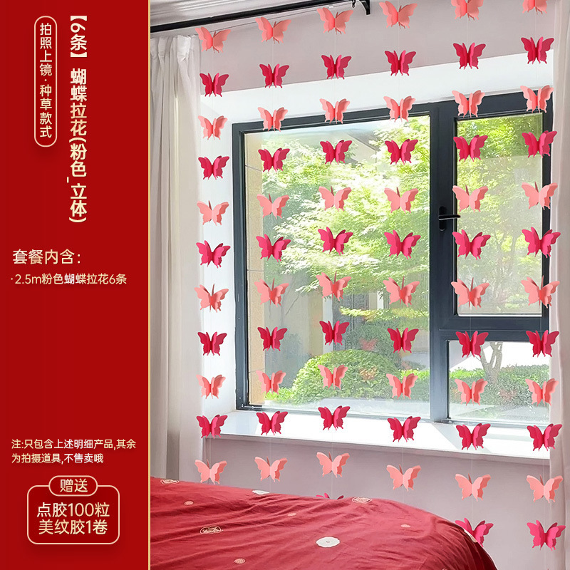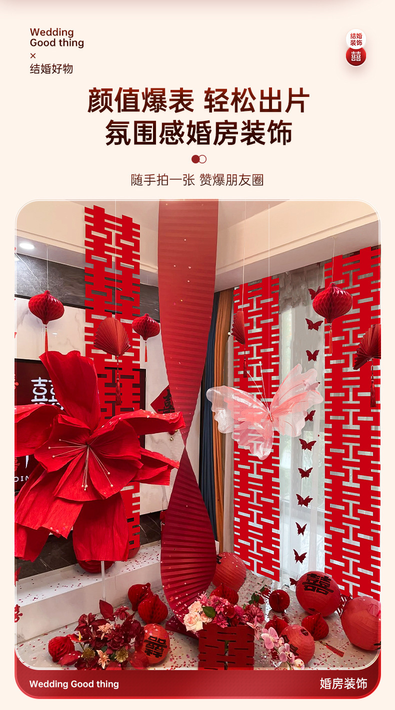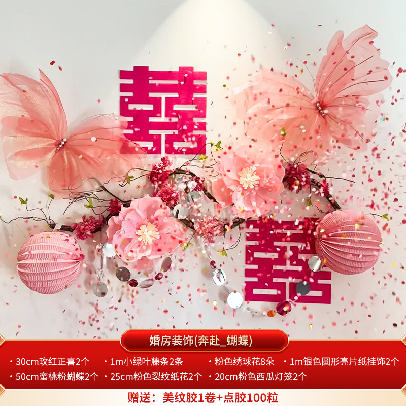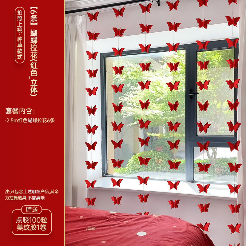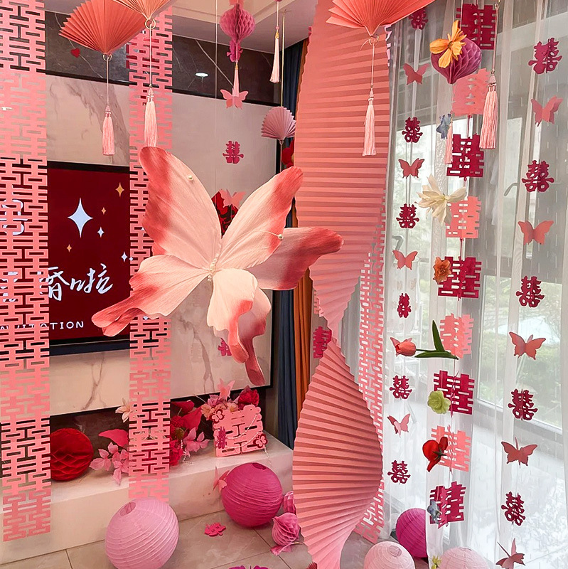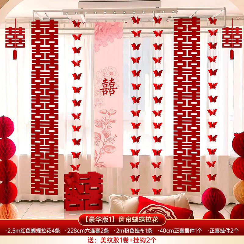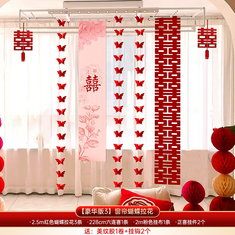 结婚长条喜字拉花婚房布置套装婚礼新房卧室客厅窗帘立体蝴蝶挂件婚房布置套装装饰结婚礼立体蝴蝶窗帘挂件卧室新房拉花长条喜批发