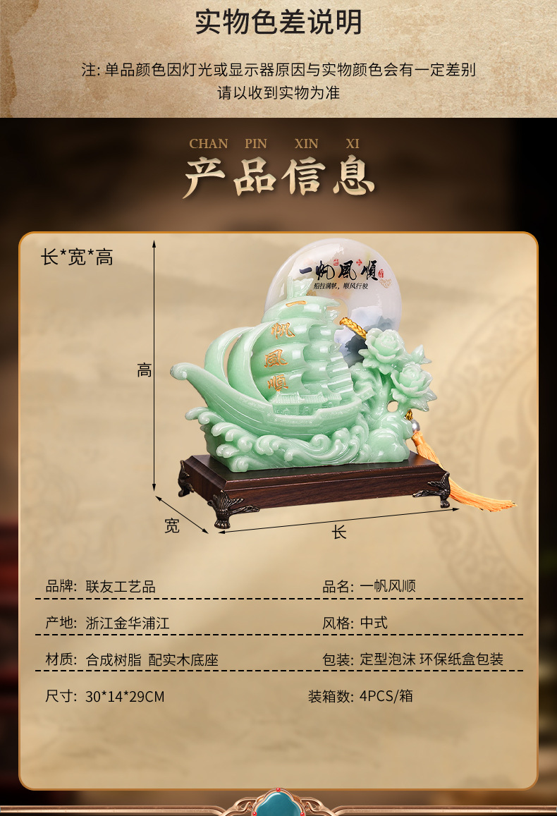 产地: 金华 风格: 中式 货号: WY-1073-7CY 产品编号: WY-1073-7CY 是否进口: 否 工艺品材质: 合成树脂 规格(长*宽*高): 30*14*29 用途: 摆件 是否专利货源: 否 品牌: 联友 工艺: 注塑 造型: 几何形/抽象艺术 可否定制: 可以 规格: 一帆风顺 是否跨境出口专供货源: 否 颜色: 30*14*29cm 是否属于礼品: 否