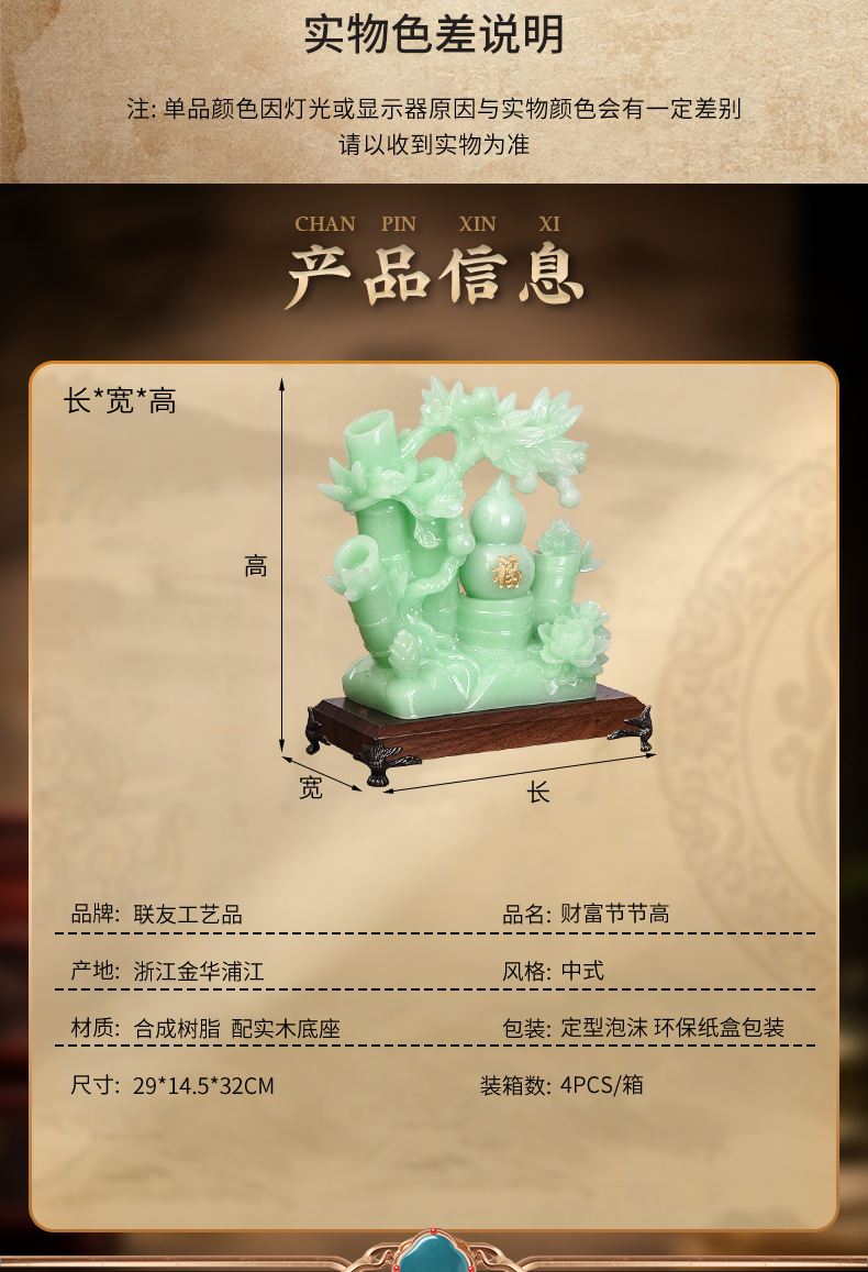 产地: 金华 风格: 中式 货号: WY-1115-7 产品编号: WY-1115-7 是否进口: 否 工艺品材质: 合成树脂 规格(长*宽*高): 35*14*32 用途: 摆件 是否专利货源: 否 品牌: 联友 工艺: 注塑 造型: 植物 可否定制: 可以 规格: 财富节节高 是否跨境出口专供货源: 否 颜色: 29*14.5*32cm 4PCS/箱 是否属于礼品: 否