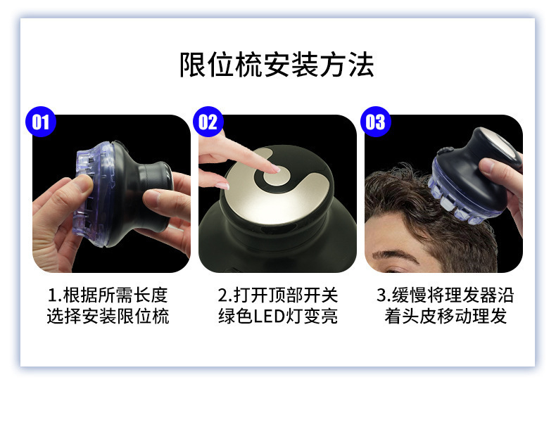 产品配件:彩盒包装+说明书(中英文)+限位梳*2(1号3/6/9.5mm,2号12mm) +USB充电线+润滑油+清洁刷