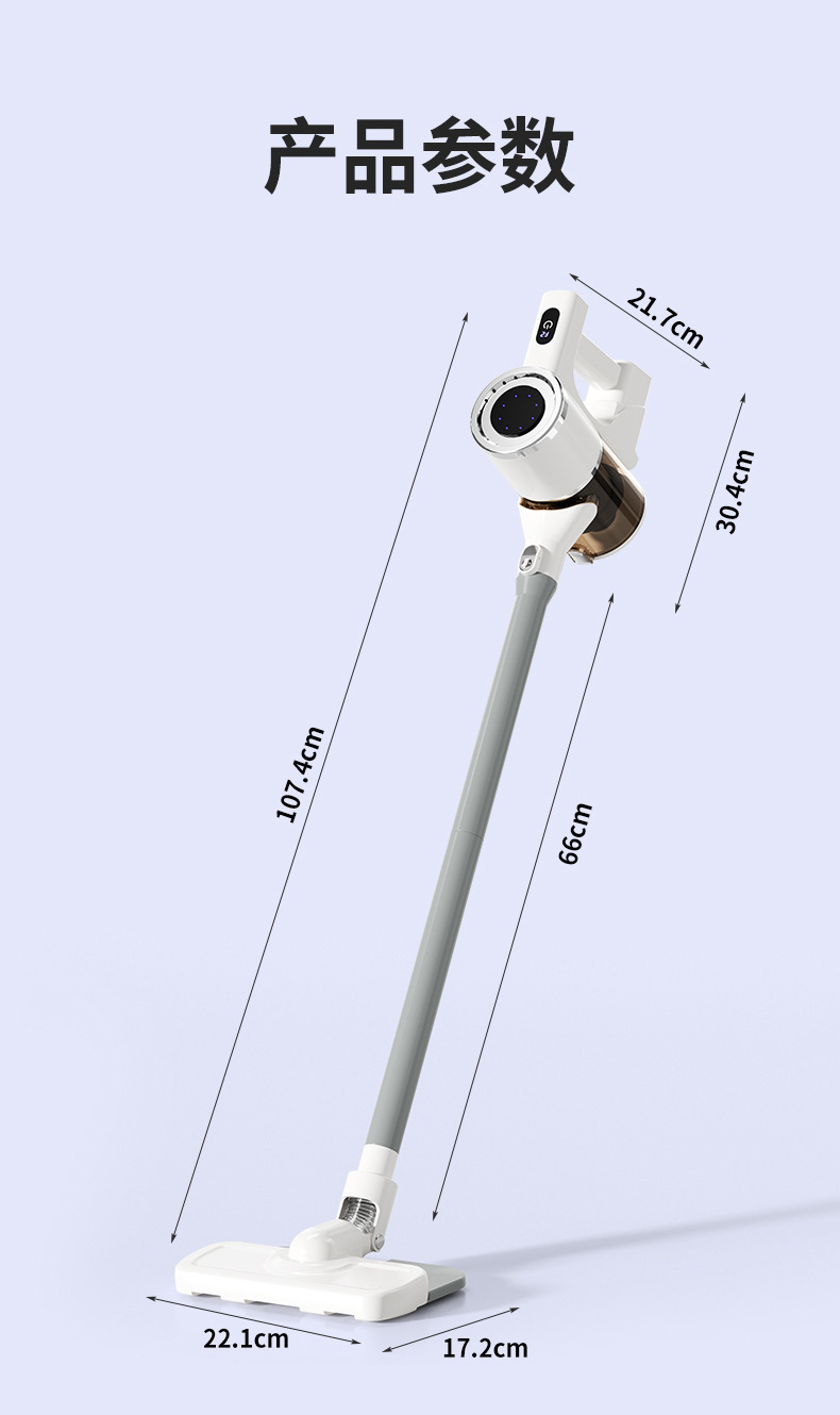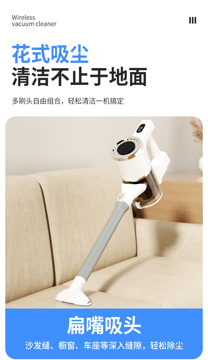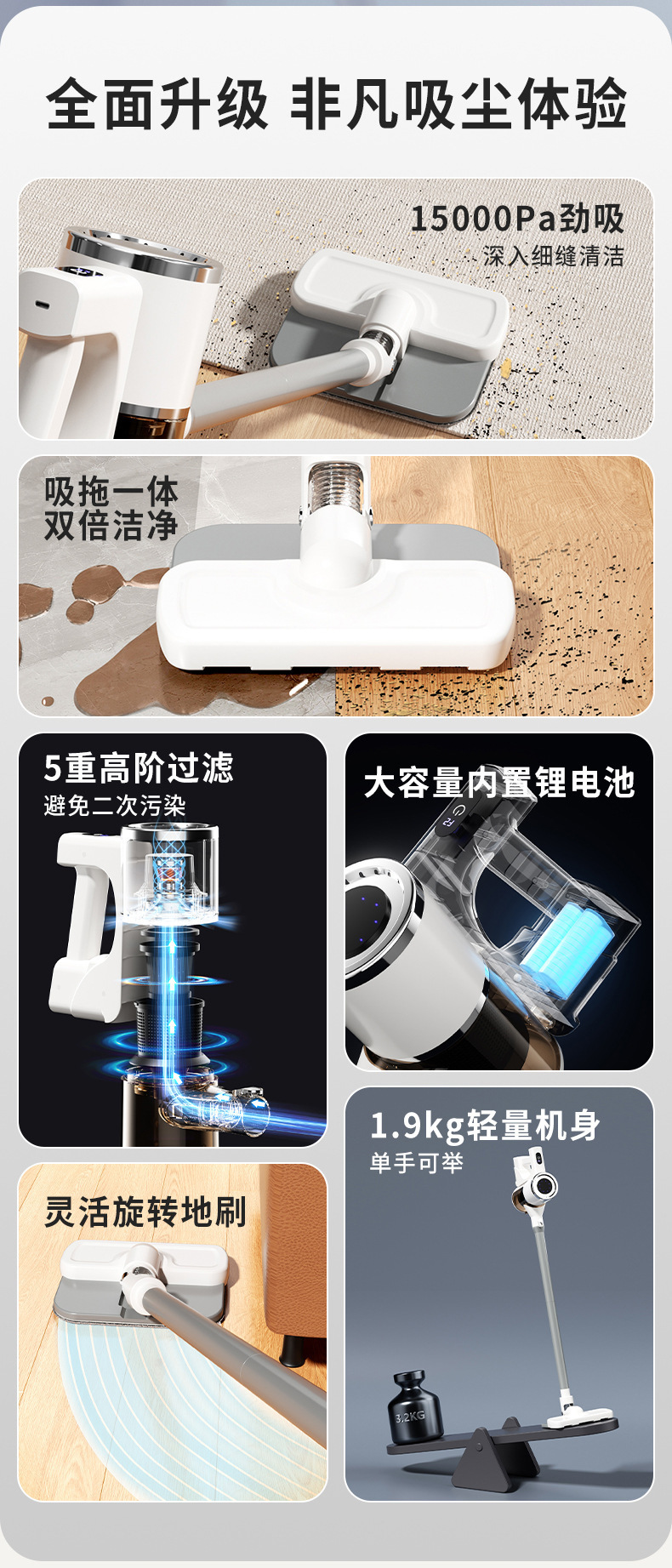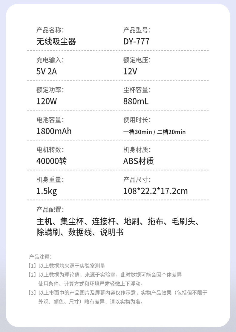 产品配置:主机,集尘杯,连接杆,地刷,拖布,毛头刷,除螨刷,数据线,说明书
