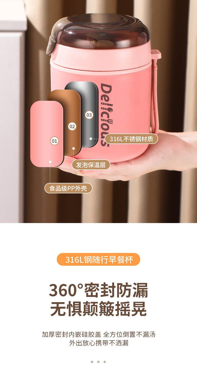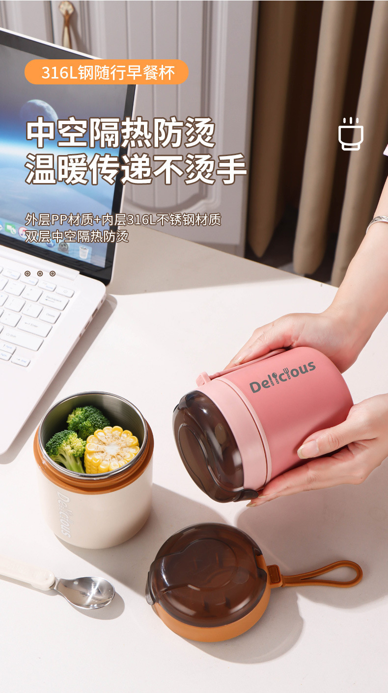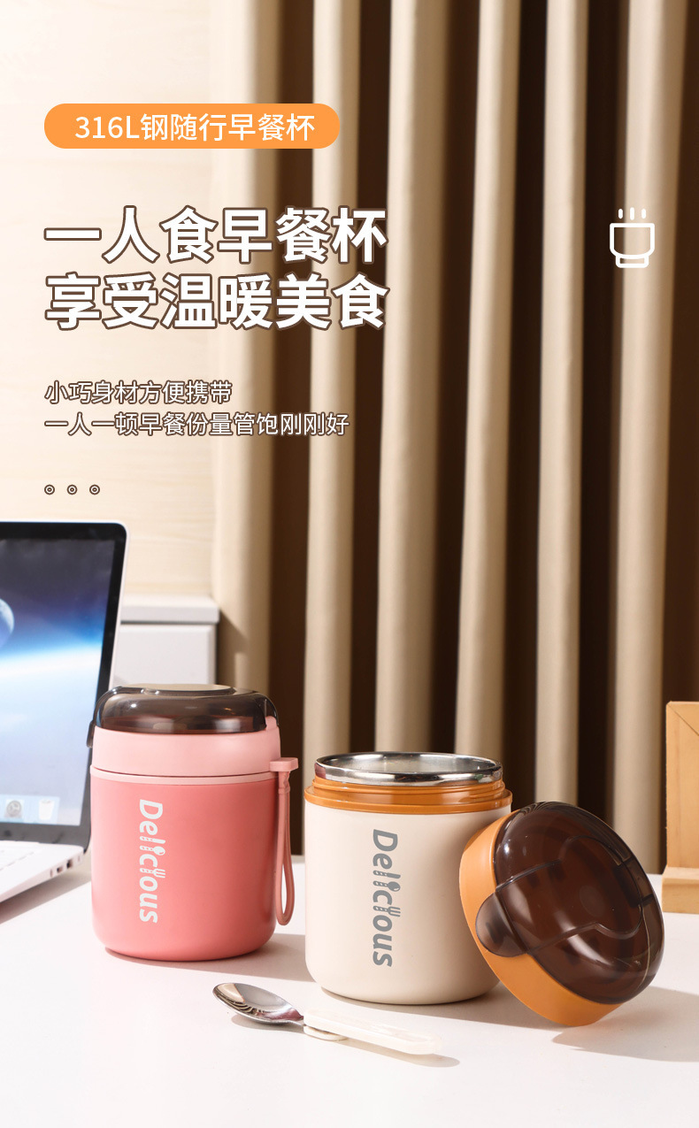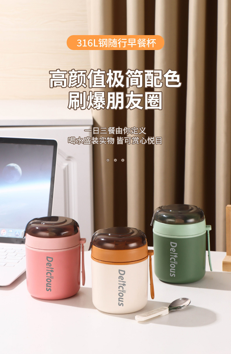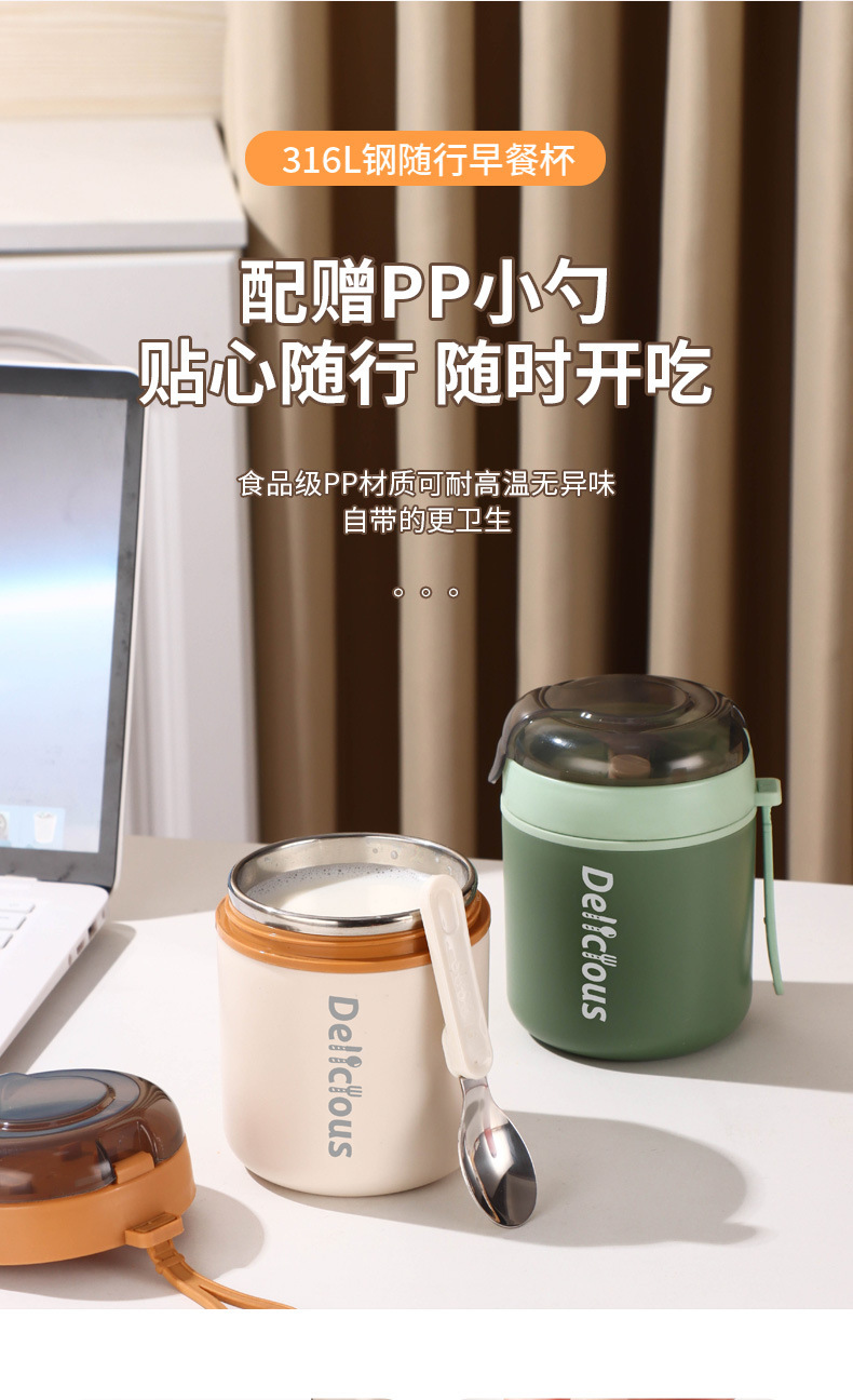 316不锈钢早餐杯+盖+勺保温上班族粥杯便携汤杯小型保温饭盒代发