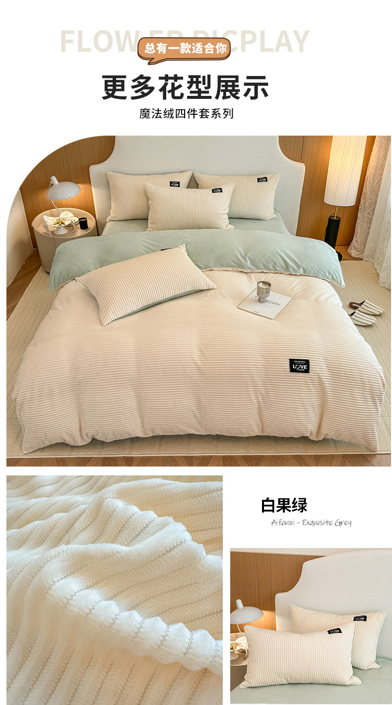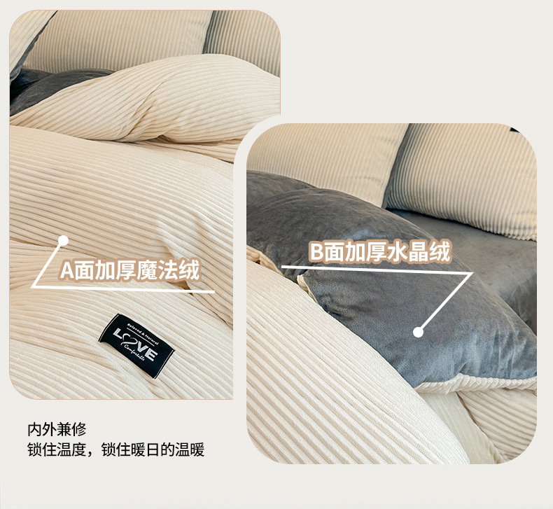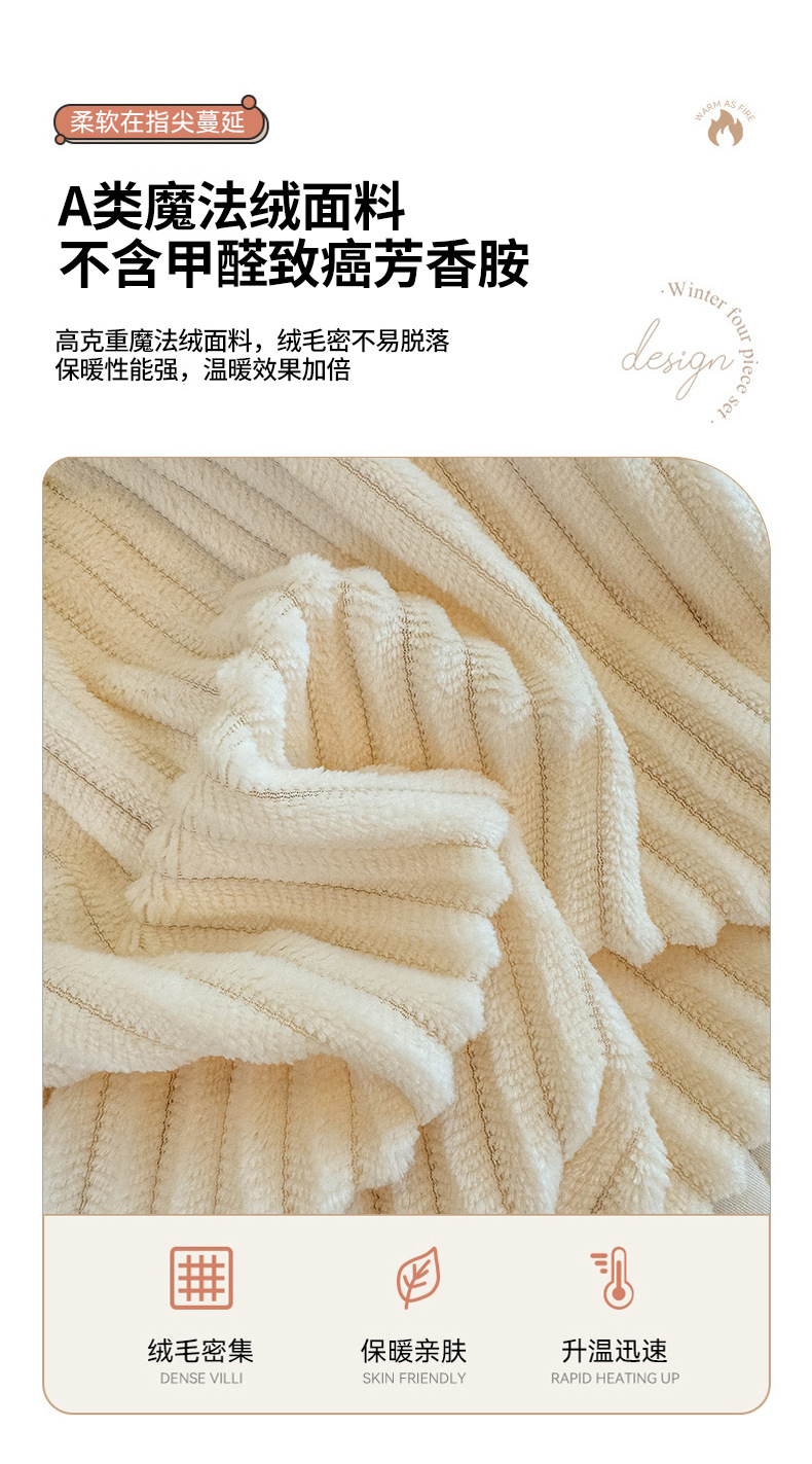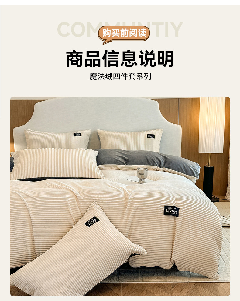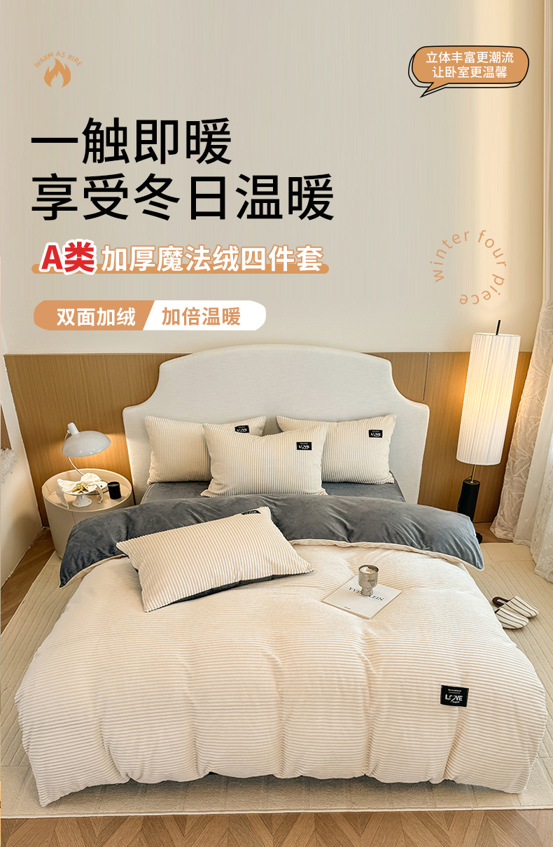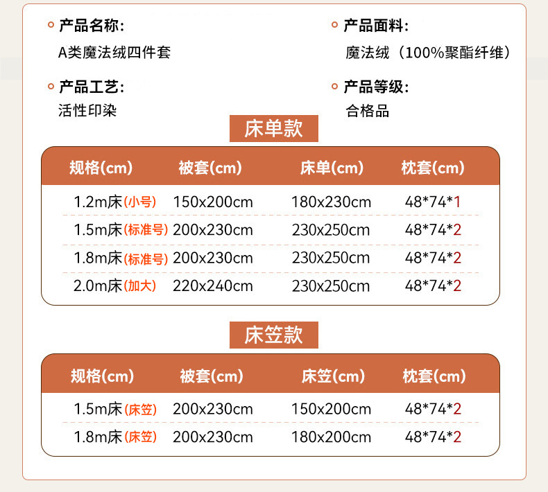 本产品为A类魔法绒四件套,200*230cm被套的标准号在2.2kg左右,面料A版魔法绒160克重 B版水晶绒120克重,产品薄厚适中,大多数人都可以适用,不是特别厚的款式,介意者慎拍