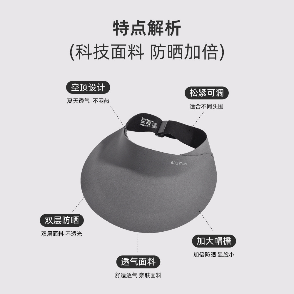 产品类别: 遮阳帽 功能: 防晒,速干,透气,防护,遮阳 面料名称: 腈纶 主面料成分: 腈纶 处理工艺: 印花 品牌: 西米优品 风格: 无 适合季节: 夏季 产地: 金华 帽顶款式: 无顶 帽檐款式: 超大檐 颜色: 黑色,白色,灰色,定制色 尺码: 可调节 是否跨境出口专供货源: 是 主要下游平台: wish,快手,SHEIN,速卖通,天猫 上市年份/季节: 2024年春季 主面料成分含量: 71%(含)-80%(含) 风格分类: 无明显风格 流行元素分类: 生活用品 重量: 0.05 kg/顶
