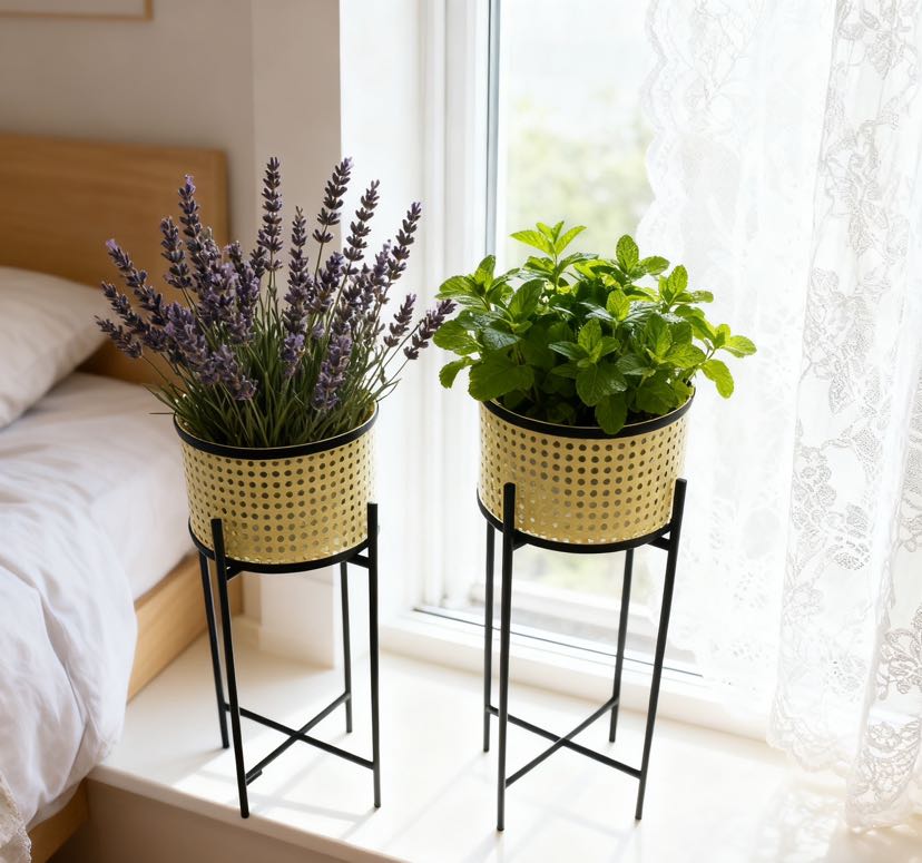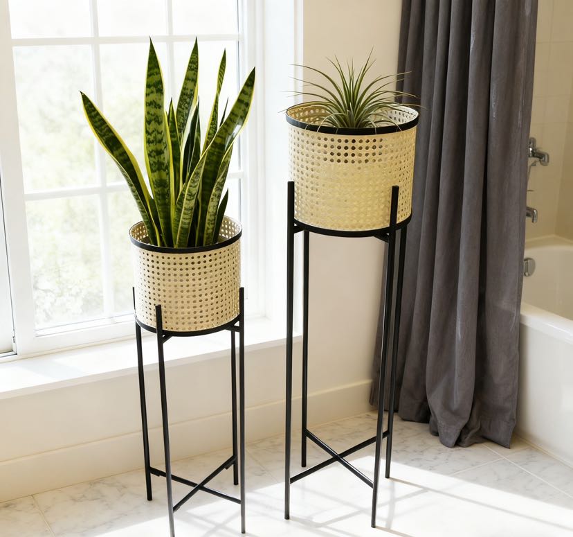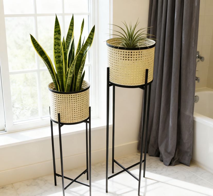 一大一小高低款搭配,摆放在同一区域不拥挤,还能自然拉出视觉层次感,避免单款花架的单调感,适配多盆绿植组合摆放。