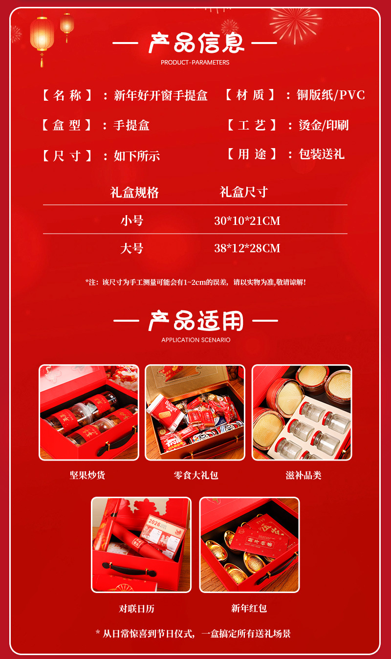 品牌: 慧楚 主要下游平台: 亚马逊,拼多多,独立站,速卖通,小红书 主要销售地区: 中国 是否跨境出口专供货源: 否 误差: 1-2CM 货号: 新年好开窗盒 原产国/地区: 中国 有可授权的自有品牌: 是 颜色: 红色 风格: 新年礼盒 材质: 硬纸板 产地: 浙江义乌 工艺: 烫金 承重: 3kg 盒型: 开窗盒 重量: 0.324 kg/个
