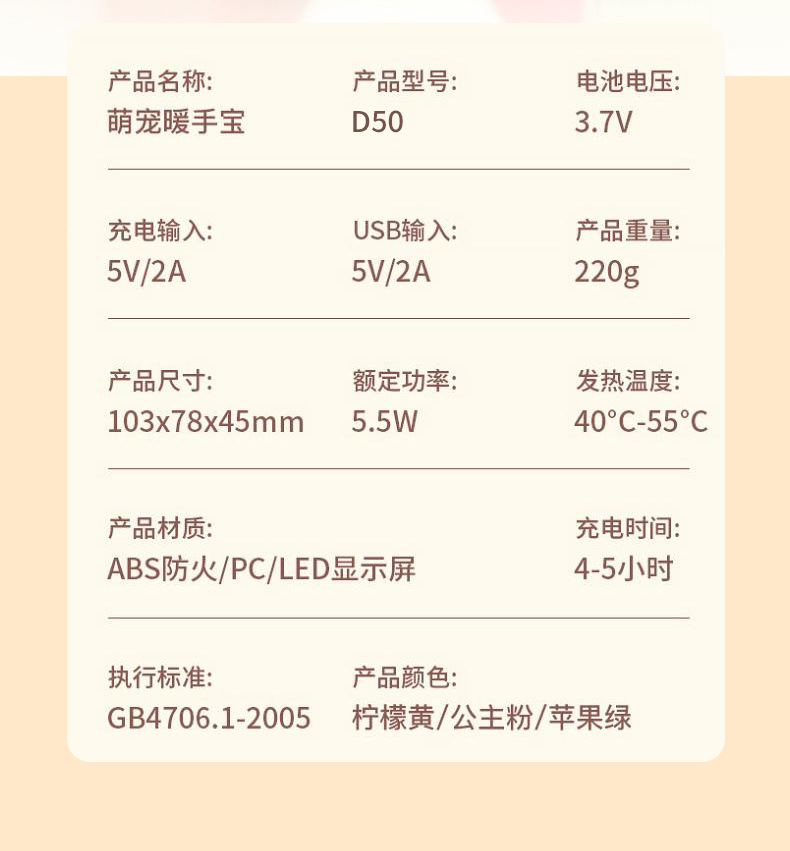 暖手宝种类: 暖手宝 加热方式: 电膜式 电源方式: USB 额定电压: 5 额定功率: 5 品牌: 其他 型号: D50 包装体积: 11.5*8.8*5cm 是否跨境出口专供货源: 否 是否内置电池: 内置电池 内置蓄电池容量: 1200mAh-2000mAh(含) 产品净重: 120g 是否专利货源: 否 续航时长: 3-6h(含) 重量: 0.5 kg/台