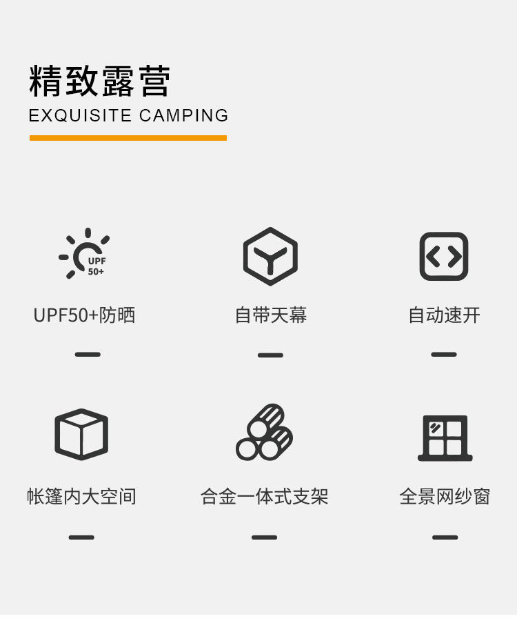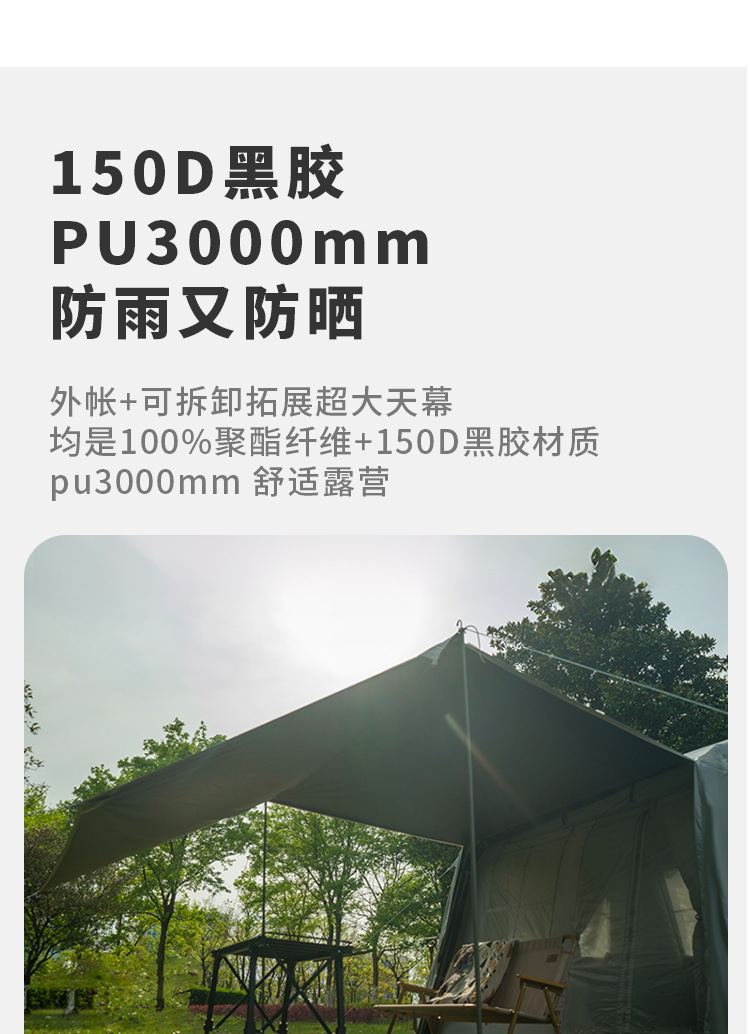 材质:外帐:100%聚酯纤维(PU3000mm黑胶150D)内帐:100%聚酯纤维(190T涤纶PA450mm)网纱:100%聚酯纤维帐底:100%聚酯纤维(PU4000mm150D)支架:铝支架+铁支架