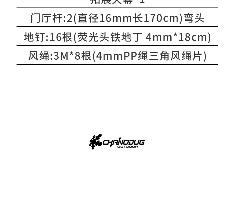 门厅杆:2(直径16mm长170cm)自动帐杆:16管1.8厚,20管1.2厚