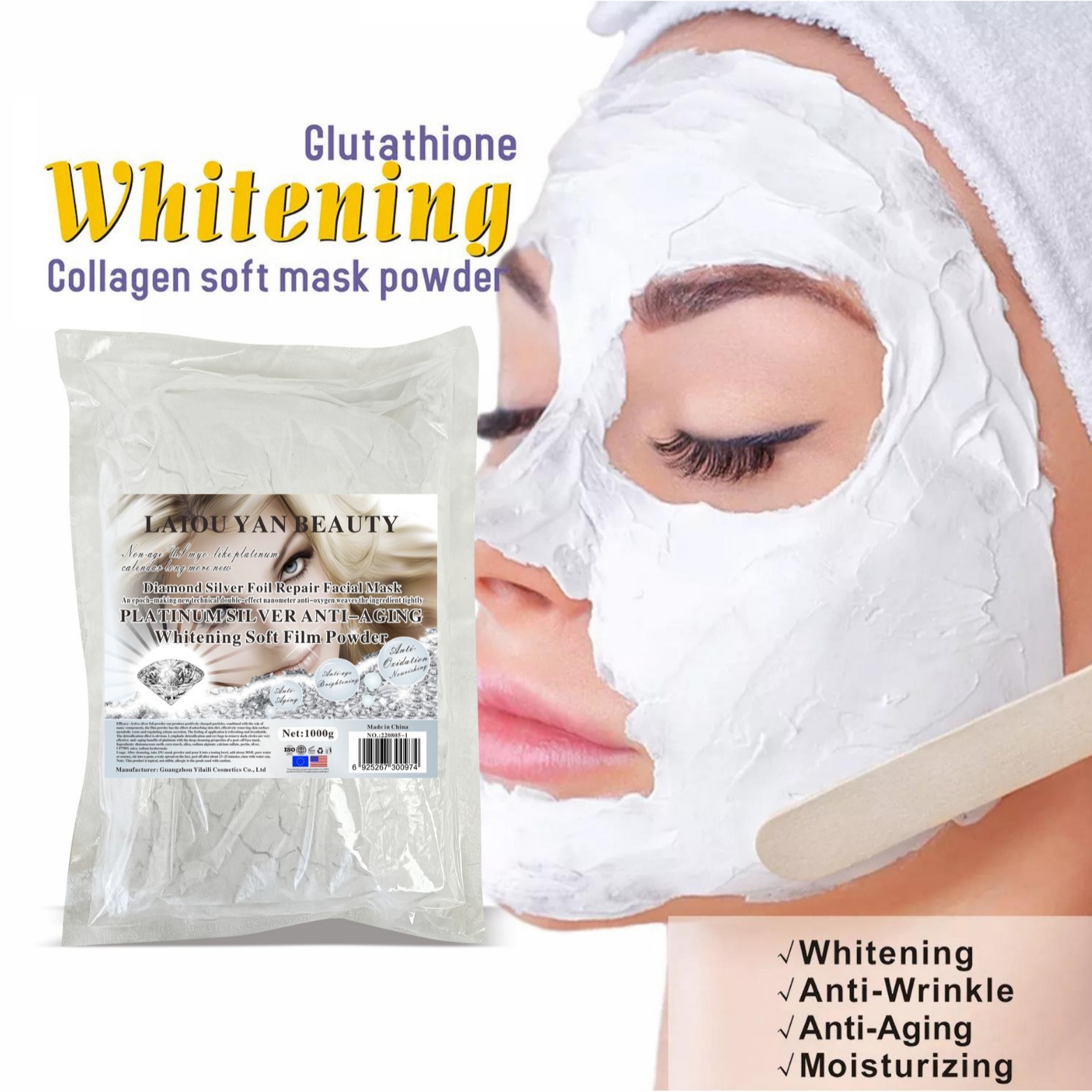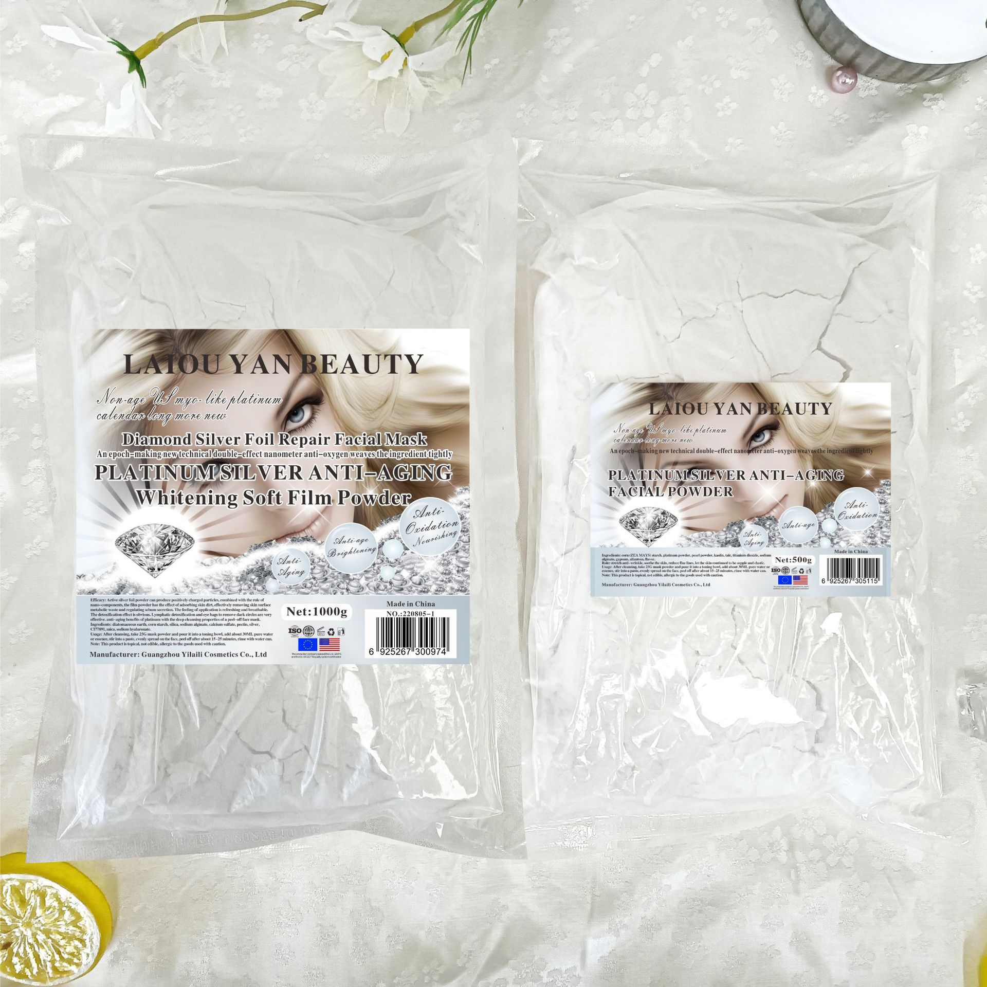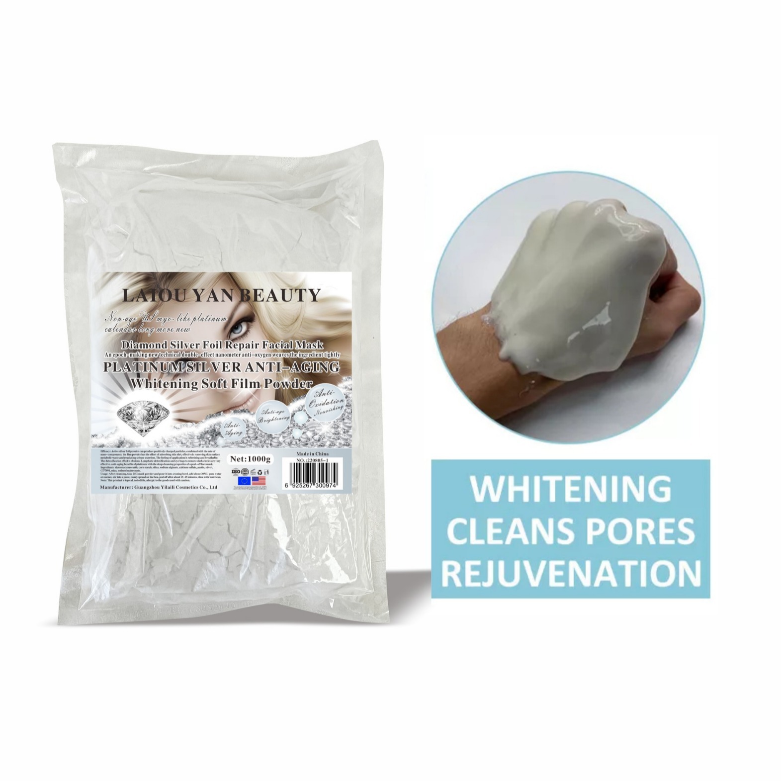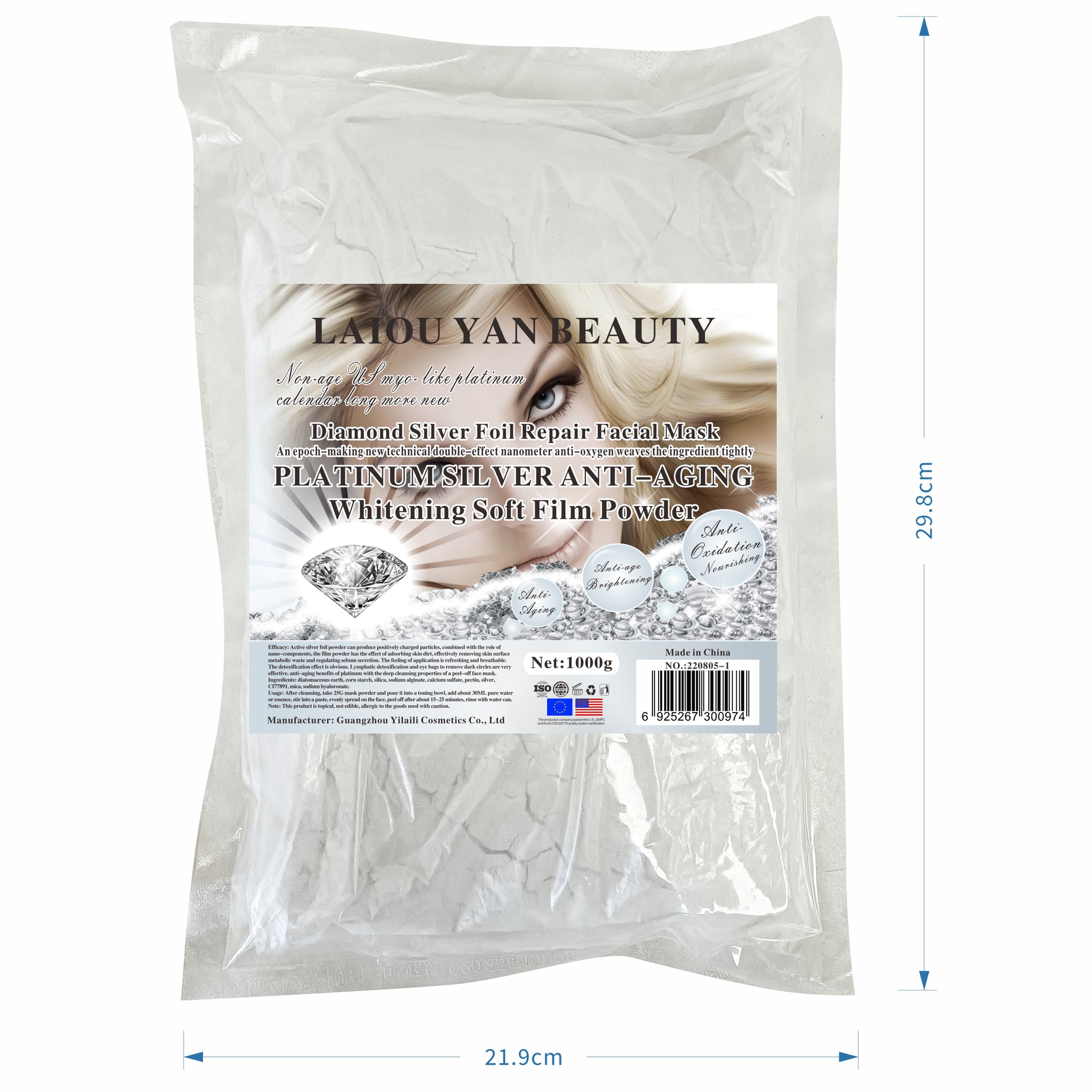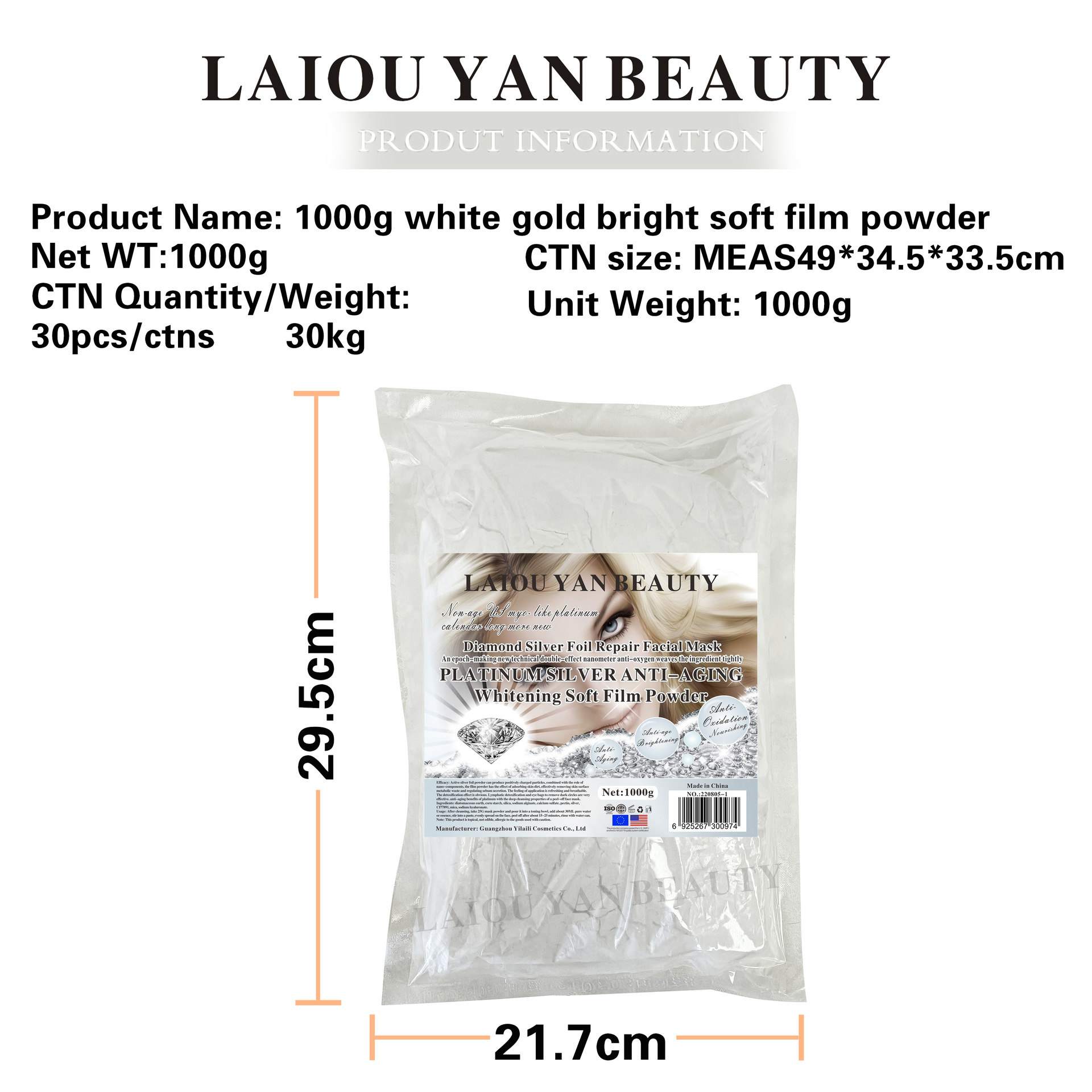 产品名称 :1000g白金璀璨软膜粉 品牌:LAIOUYANBEAUTY单品毛重 :1000g 净含量:1000g装箱规格 :30pcs/ctns 箱重30kg箱单品尺寸: 29.7*21.7装箱尺寸 MEAS49*34.5*33.5cm