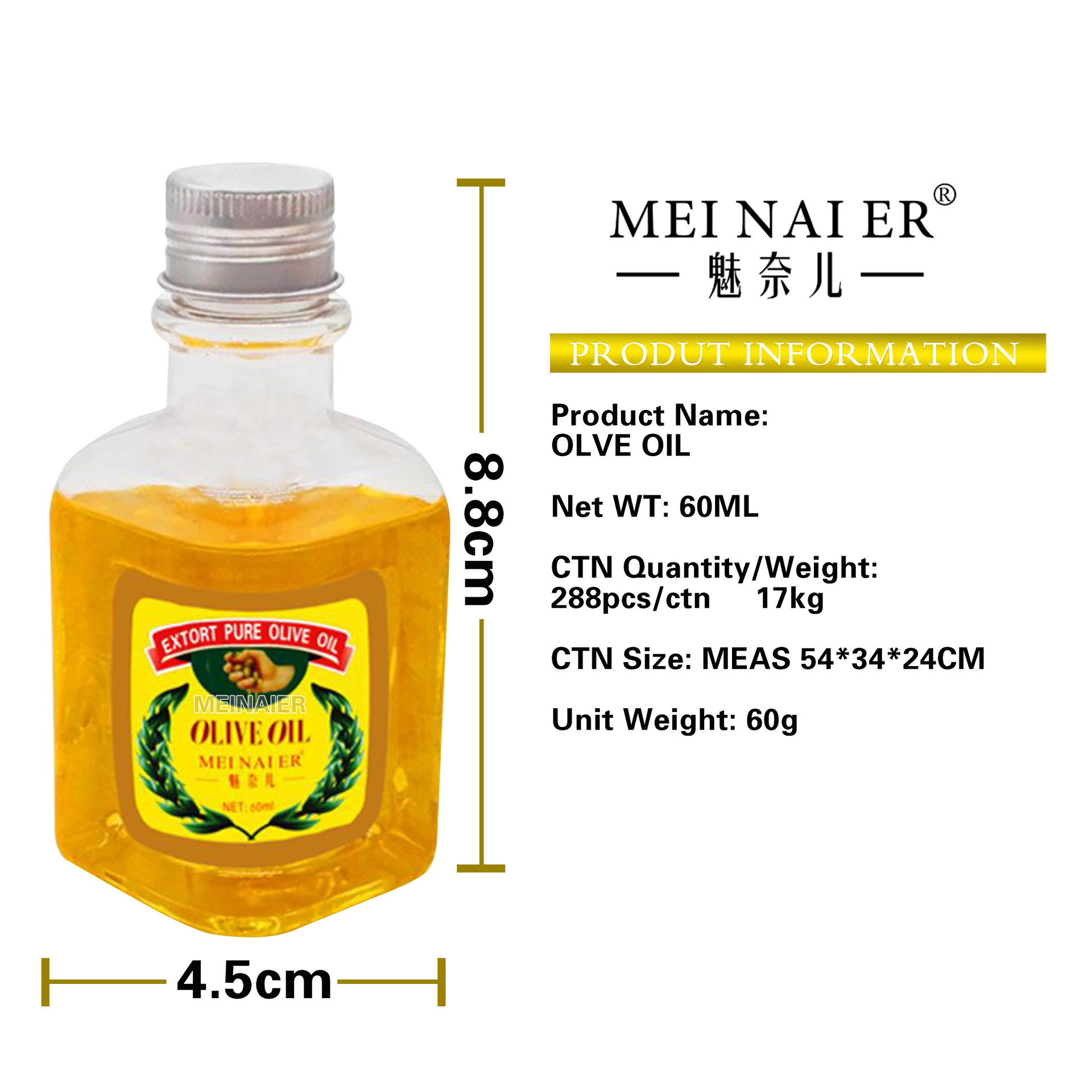 产品名称 60ml橄榄油 品牌:魅奈儿单品毛重 60g 净含量60ml装箱规格 288pcs/ctns 箱重17kg箱单品尺寸 8.8*4.5cm装箱尺寸 MEAS54*34*24cm包装:如图 可按客户需求来订做