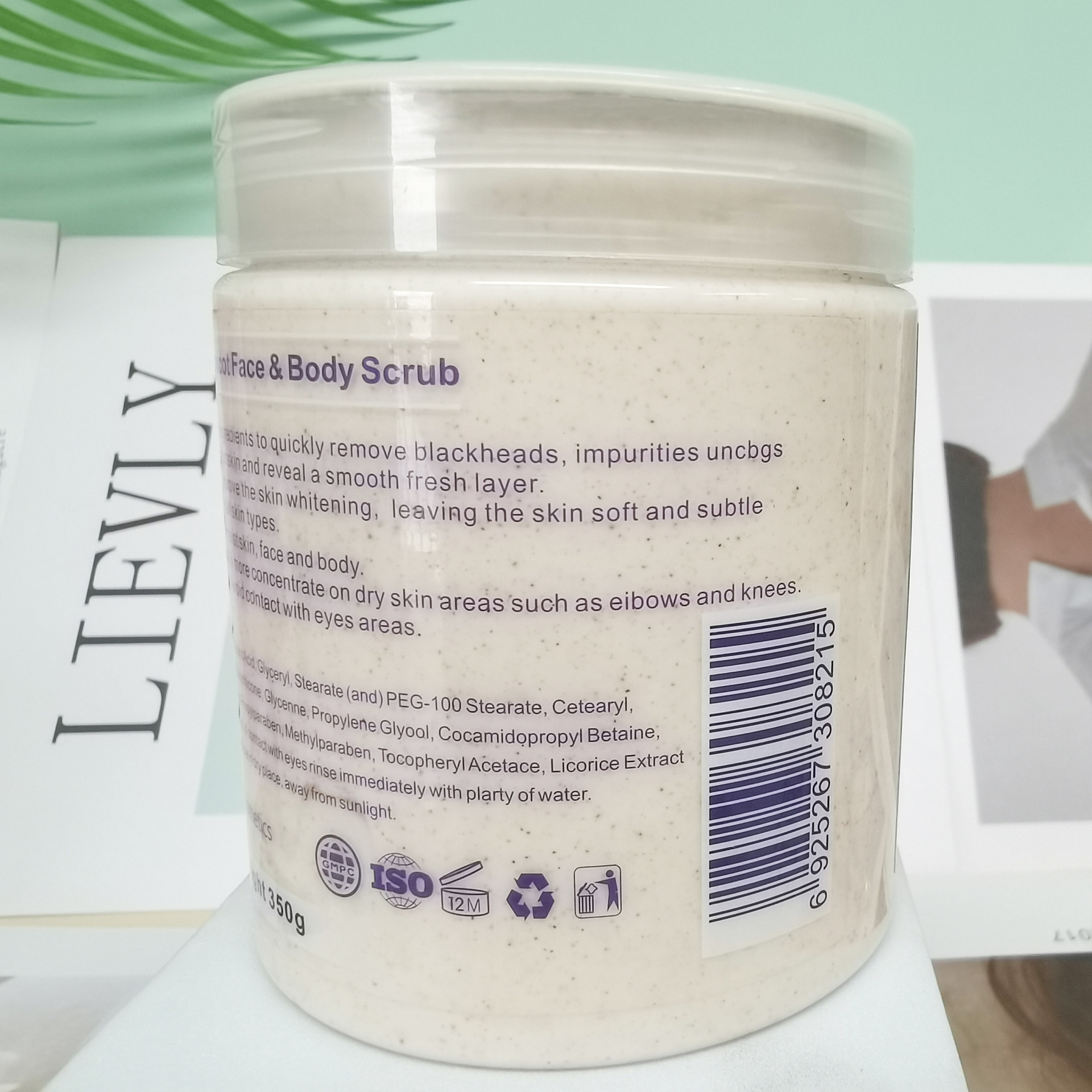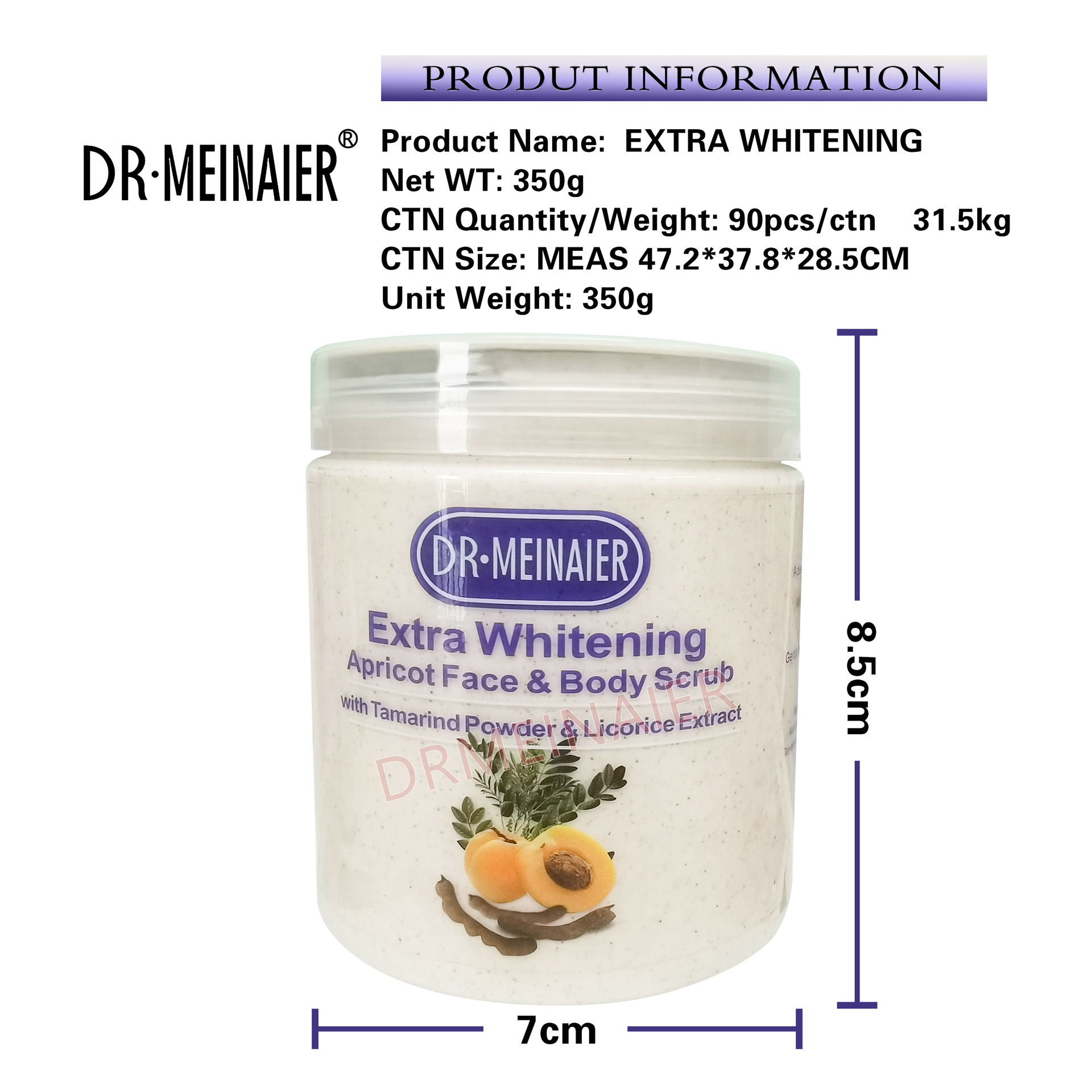 产品名称:350g杏仁身体磨砂膏 品牌:DRMEINAIER单品毛重 350g 净含量:350g装箱规格 90pcs/ctns 箱重31.5kg箱单品尺寸 8.3*7cm装箱尺寸 MEAS 47.2*37.8*28.5cm