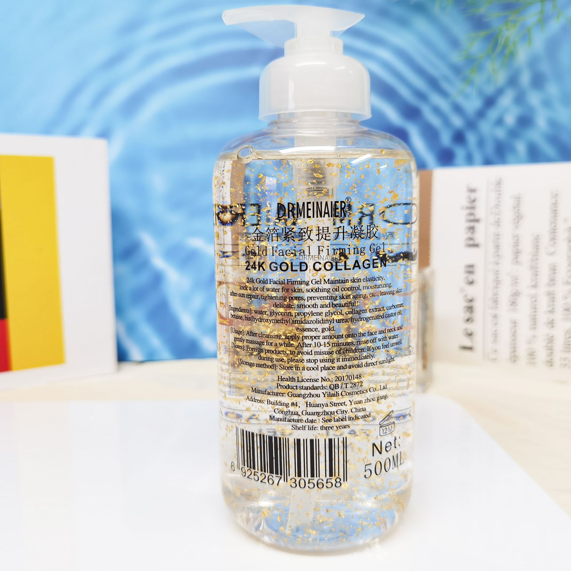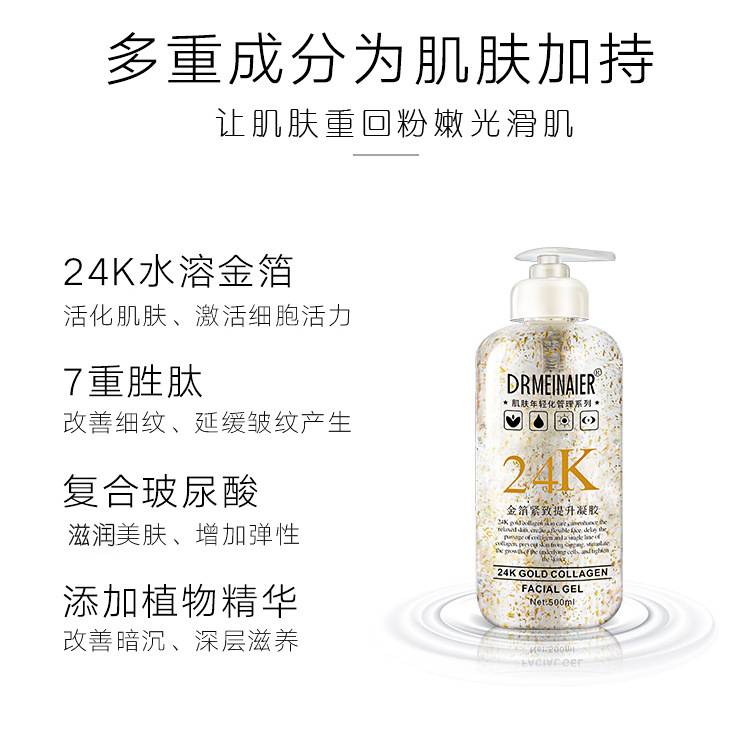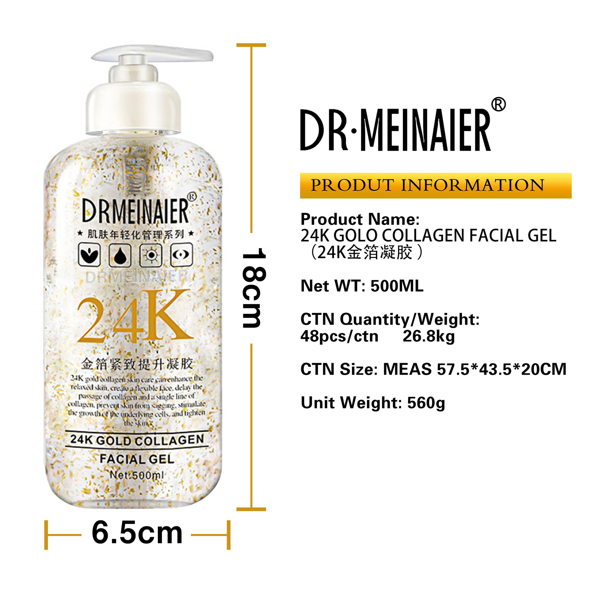 产品名称 500ml24K金箔凝胶 品牌:DRMEINAIER单品毛重 560g 净含量:500ml装箱规格 48pcs/ctns 箱重26.8kg/箱单品尺寸 18*6.5cm装箱尺寸 MEAS 57.5*43.5*20 cm包装:如图 可按客户需求来订做