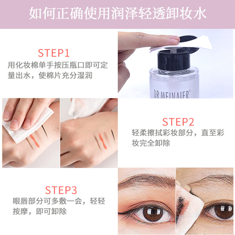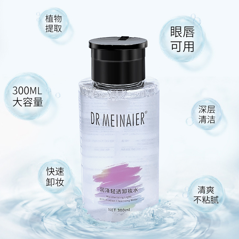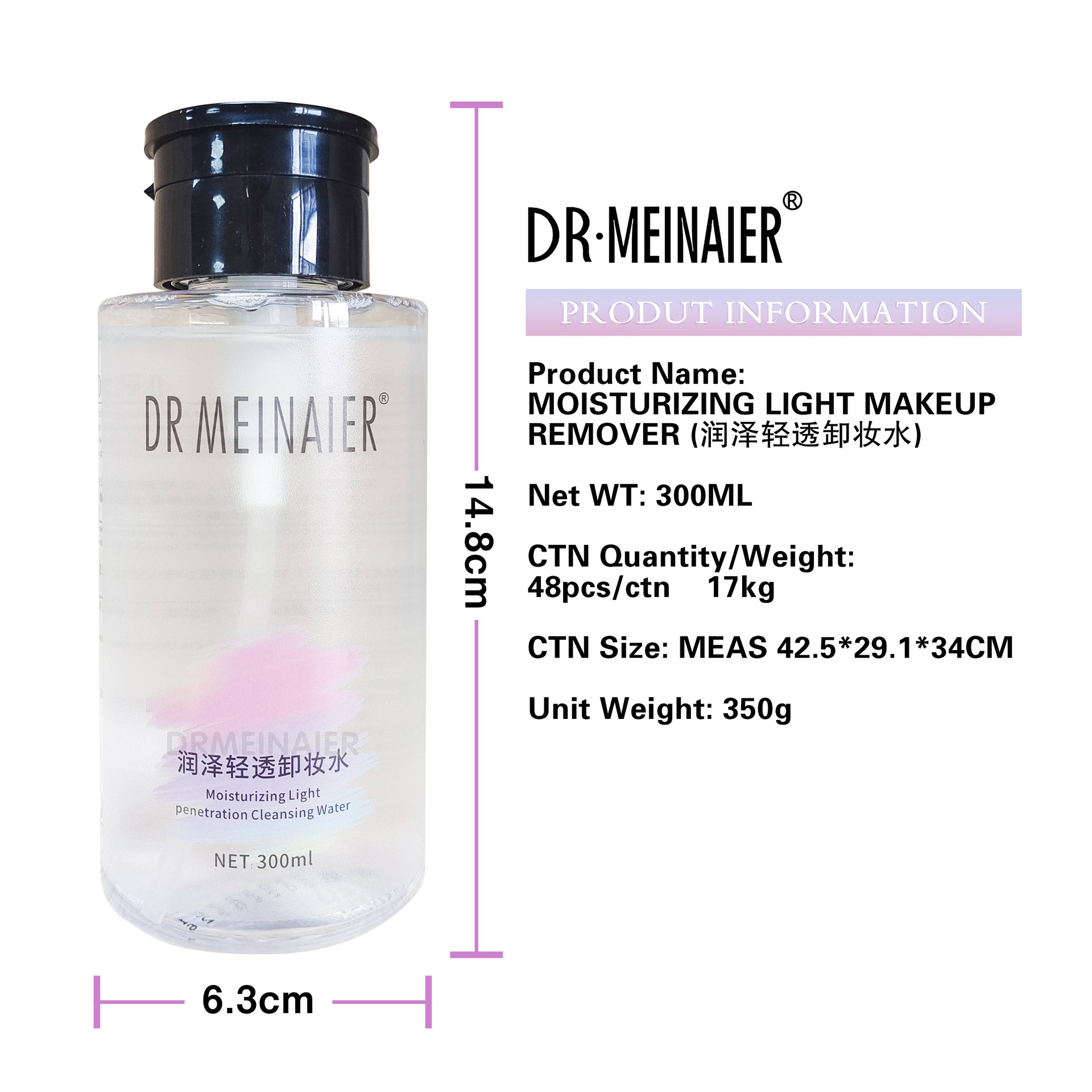 产品名称 :300ml润泽轻透卸妆水 品牌:DRMEINAIER单品毛重 :350g 净含量:300ml装箱规格 :48pcs/ctns 箱重17kg/箱单品尺寸:14.8*6.3装箱尺寸 ME42.5*29.1*34cm包装:如图 可按客户需求来订做