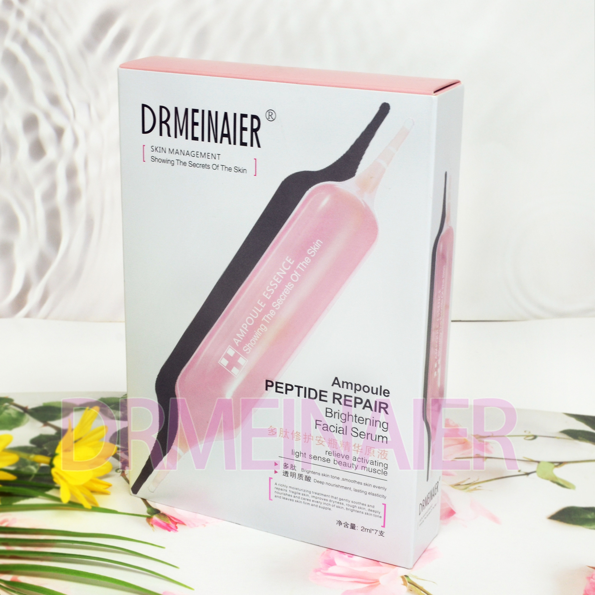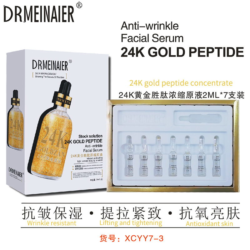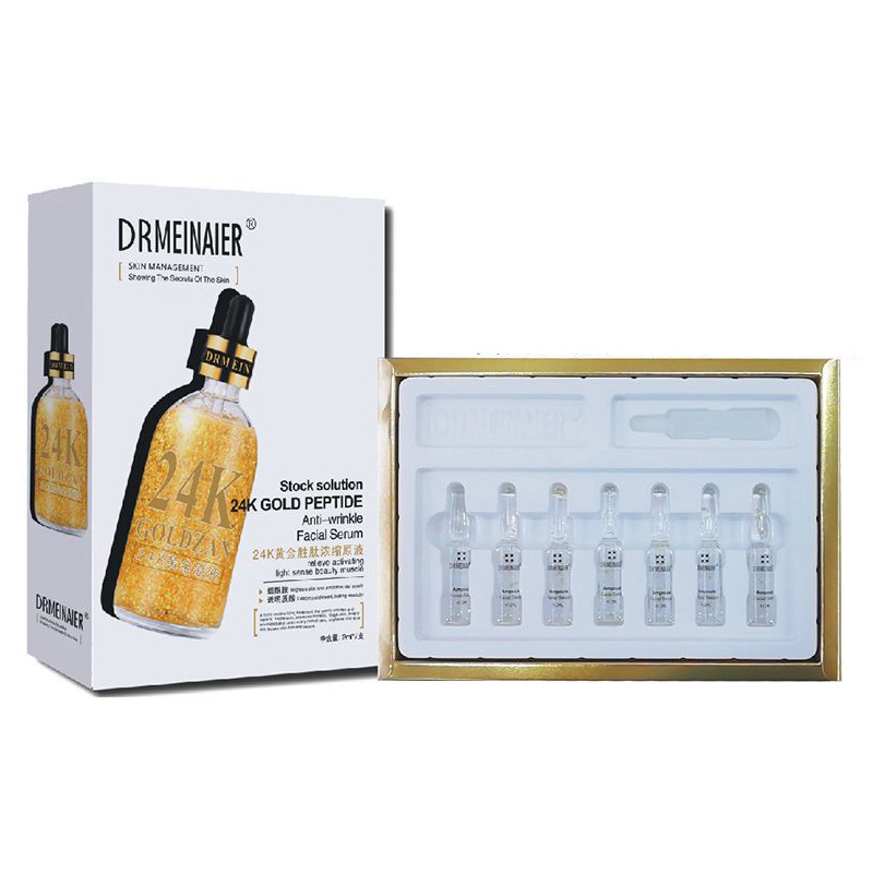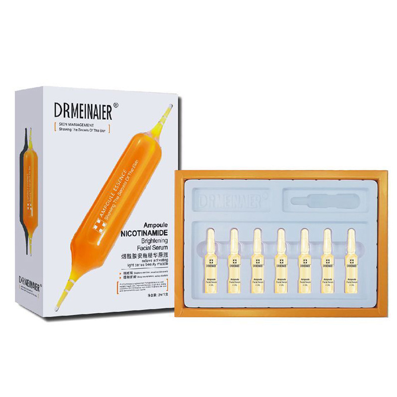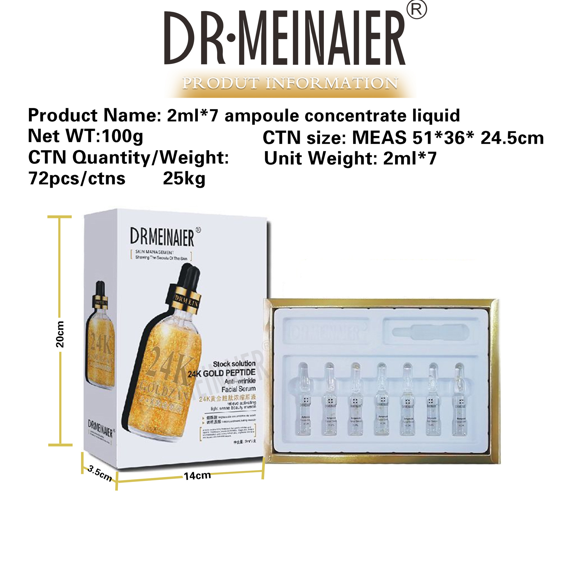 产品名称 2ml*7支安瓶精浓缩原液 品牌:DRMEINAIER单品毛重 100g 净含量2ml*7装箱规格 72pcs/ctns 箱重25kg箱单品尺寸 20*14*3.5装箱尺寸 MEAS 57.9*44.6*42cm包装:如图 可按客户需求来订做