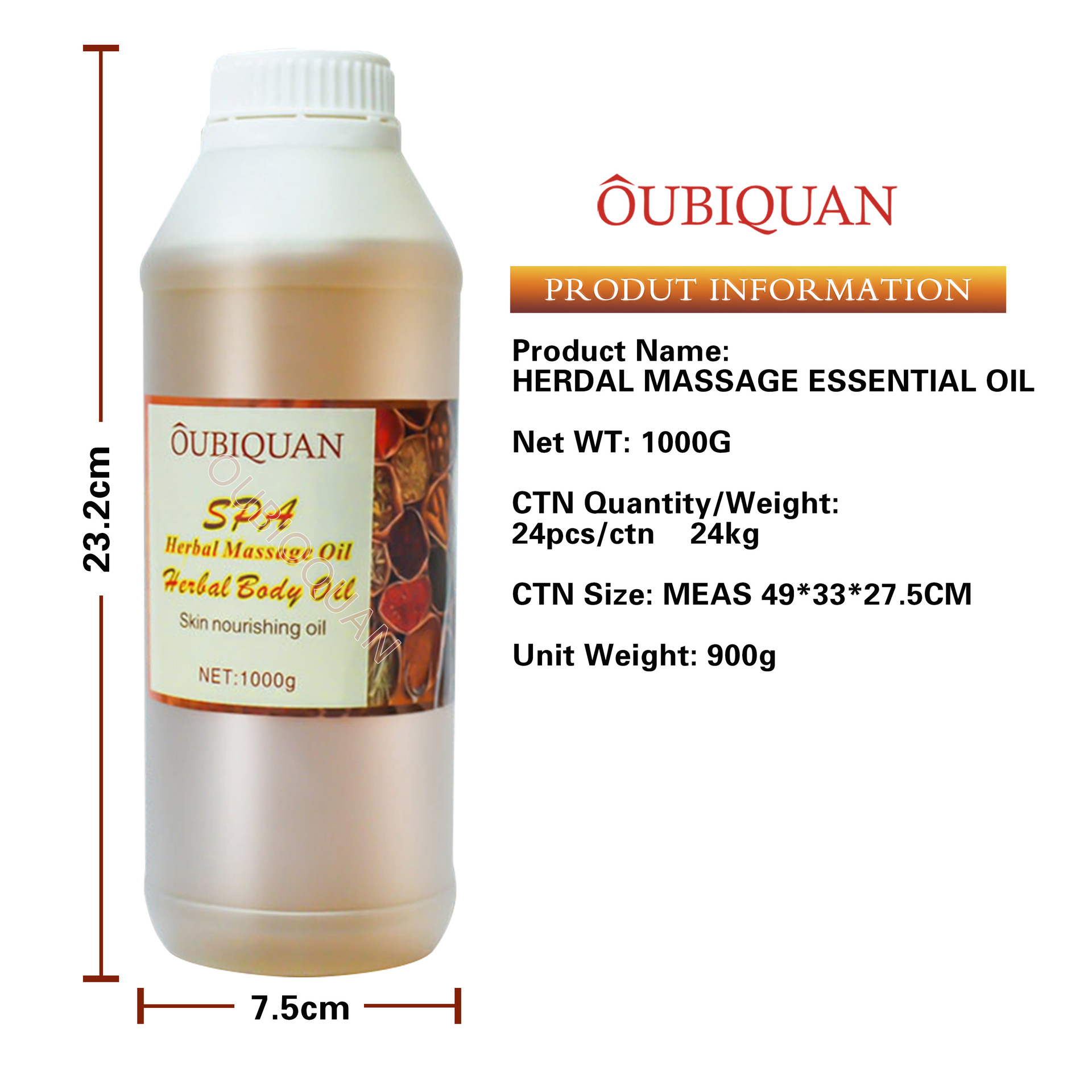 产品名称:1000ml草本润肤按摩精油 品牌:OUBIQUAN