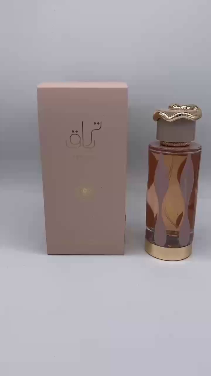 瓶身是匠人吹制的琥珀晶玻,半透的暖调裹着淡粉雾面肌理,像把落日熔成的蜜蜡揉进了琉璃里;鎏金蛇形瓶扣是神来之笔:蛇鳞复刻中东传统錾金工艺,蜷在灰调瓶盖的弧度里,一触就是香氛倾泻的开关,拿在手里像攥着一件“可穿戴的珠宝”。