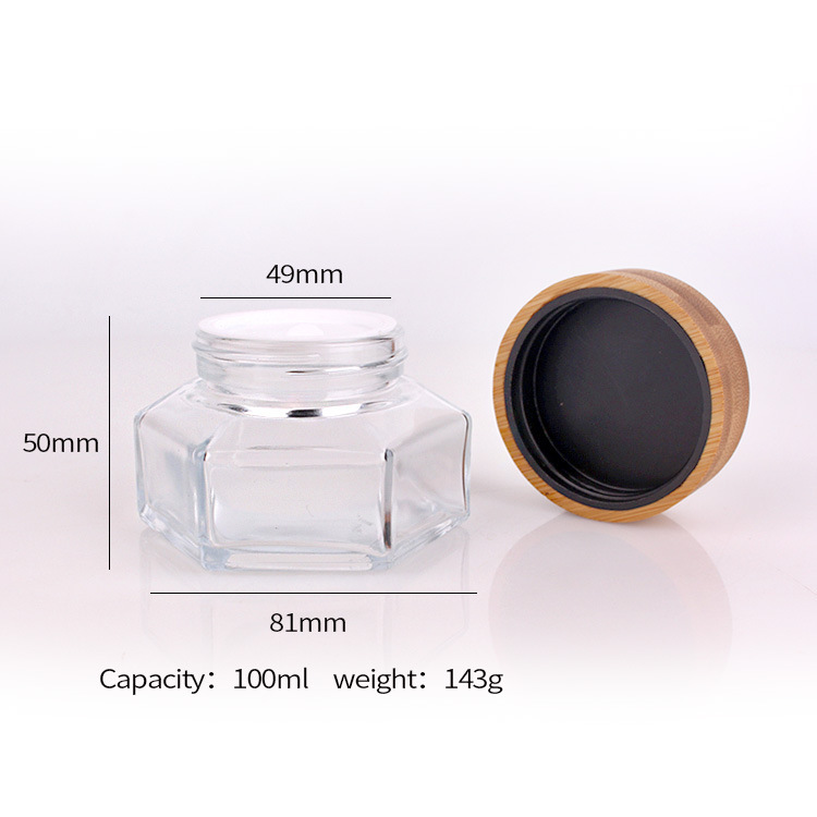 现货批发竹木盖六棱膏霜瓶 30g50g100g六角竹木盖透明玻璃 面霜瓶 English | 投诉