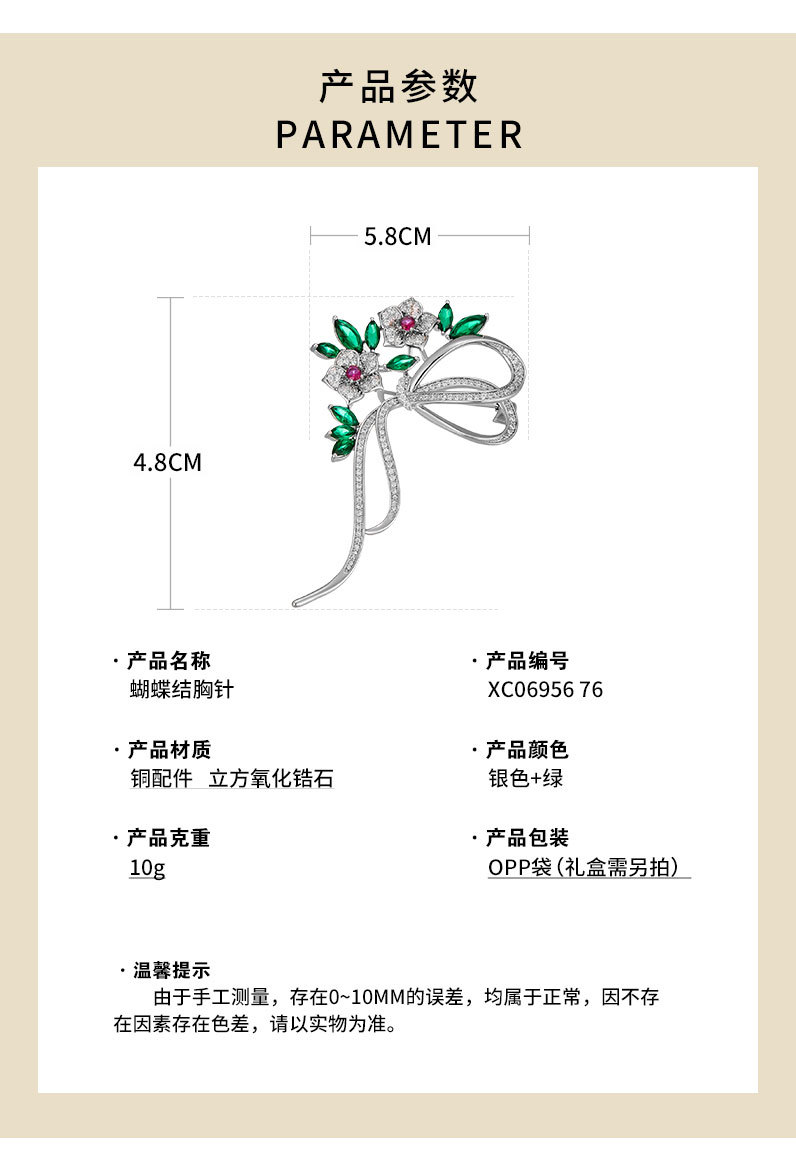 材质: 铜 功能: 纪念,装饰,送礼 处理工艺: 微镶 流行元素: 花朵 风格: 优雅 样式: 花朵 造型: 花卉,蝴蝶结 产地: 义乌 货号: XC06956 主要下游平台: 淘宝,ebay,亚马逊,wish,快手, 颜色: XC06956D200 有可授权的自有品牌: 否 是否跨境出口专供货源: 是 上市年份/季节: 2024年秋季 别针: 节日礼物高级感别针 风格分类: 时尚通勤 主要销售地区: 非洲,欧洲,南美,东南亚,北美,东北亚, 适用人群: 女式 胸针: my沐禹时尚优雅花朵蝴蝶结胸针 胸花: 秋冬新品西装配饰胸花 重量: 0.01 kg/个