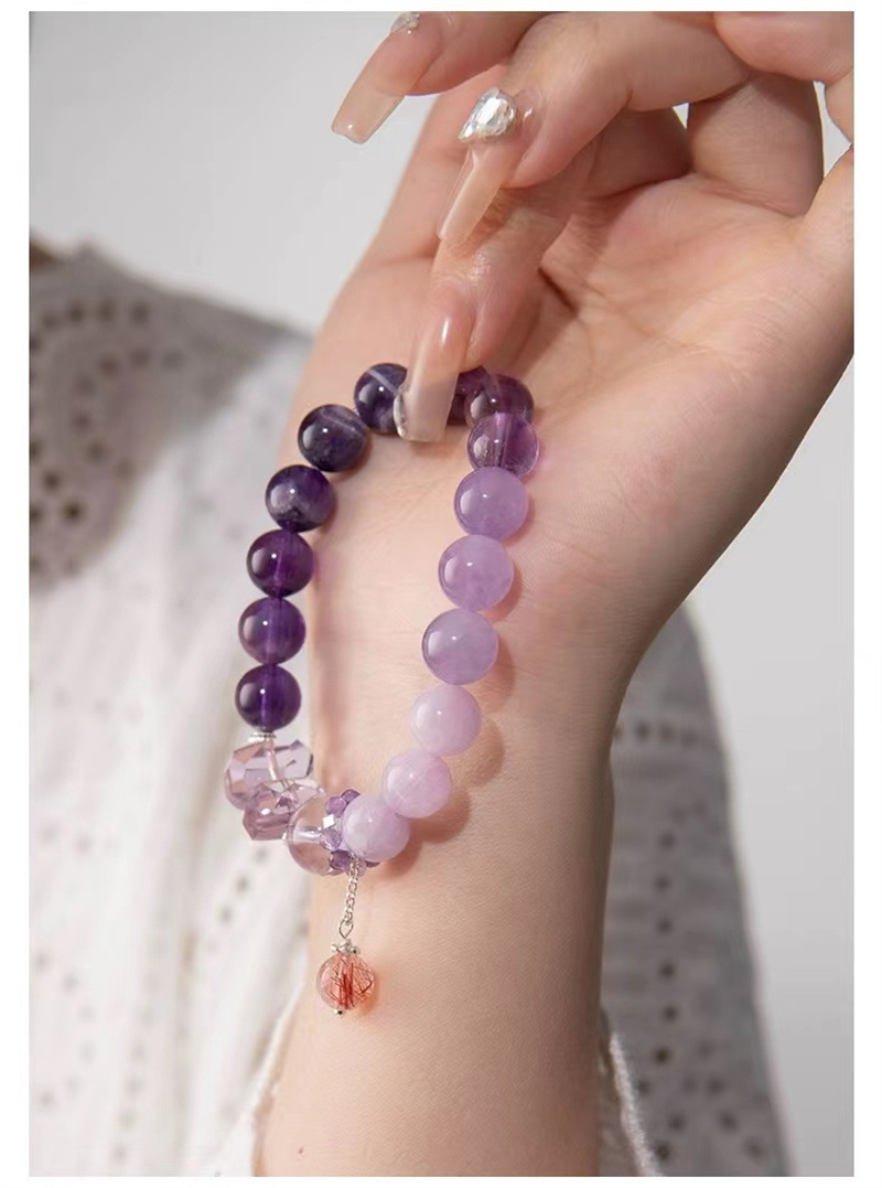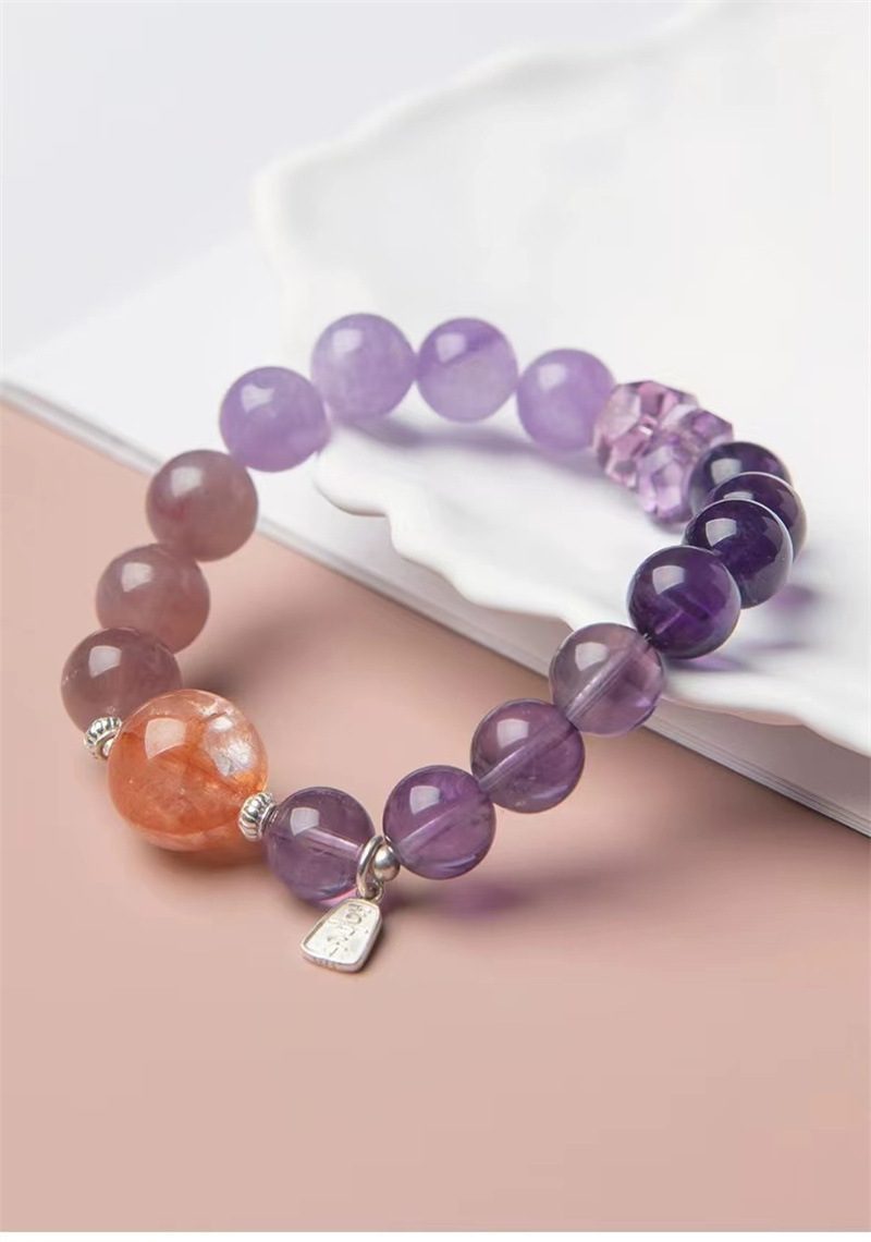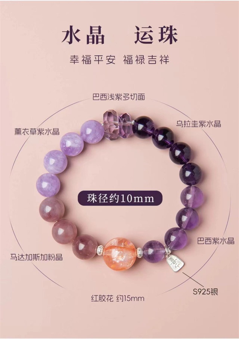 材质: 水晶 品牌: DU 处理工艺: 打磨 水晶种类: 紫水晶 风格: 国潮 适用人群: 女式 样式: 女式 造型: 几何型 适用送礼场合: 员工福利 货号: AL781267276074 产地: 连云港 主要下游平台: 淘宝,京东,天猫 颜色: 紫水晶-九紫离火手串,紫水晶-水晶运珠手 有可授权的自有品牌: 是 是否跨境出口专供货源: 否 流行元素: 如意 上市年份/季节: 2024年春季 风格分类: 文艺复古 流行元素分类: 民族/国风 重量: 0.012 kg/条
