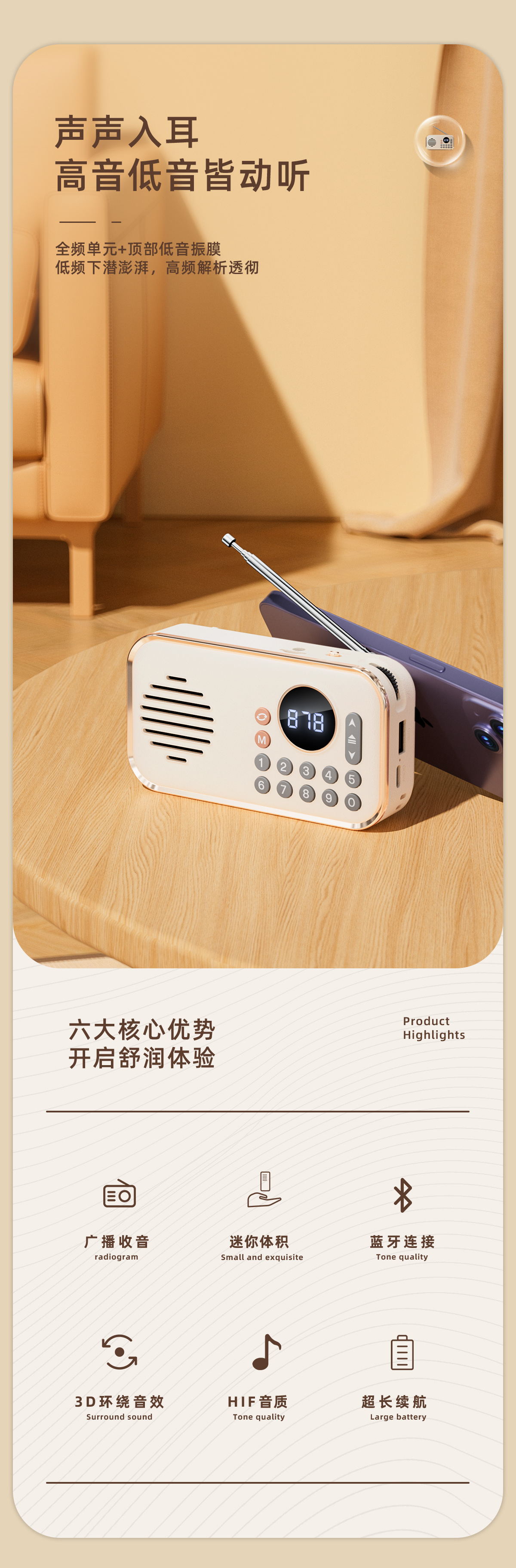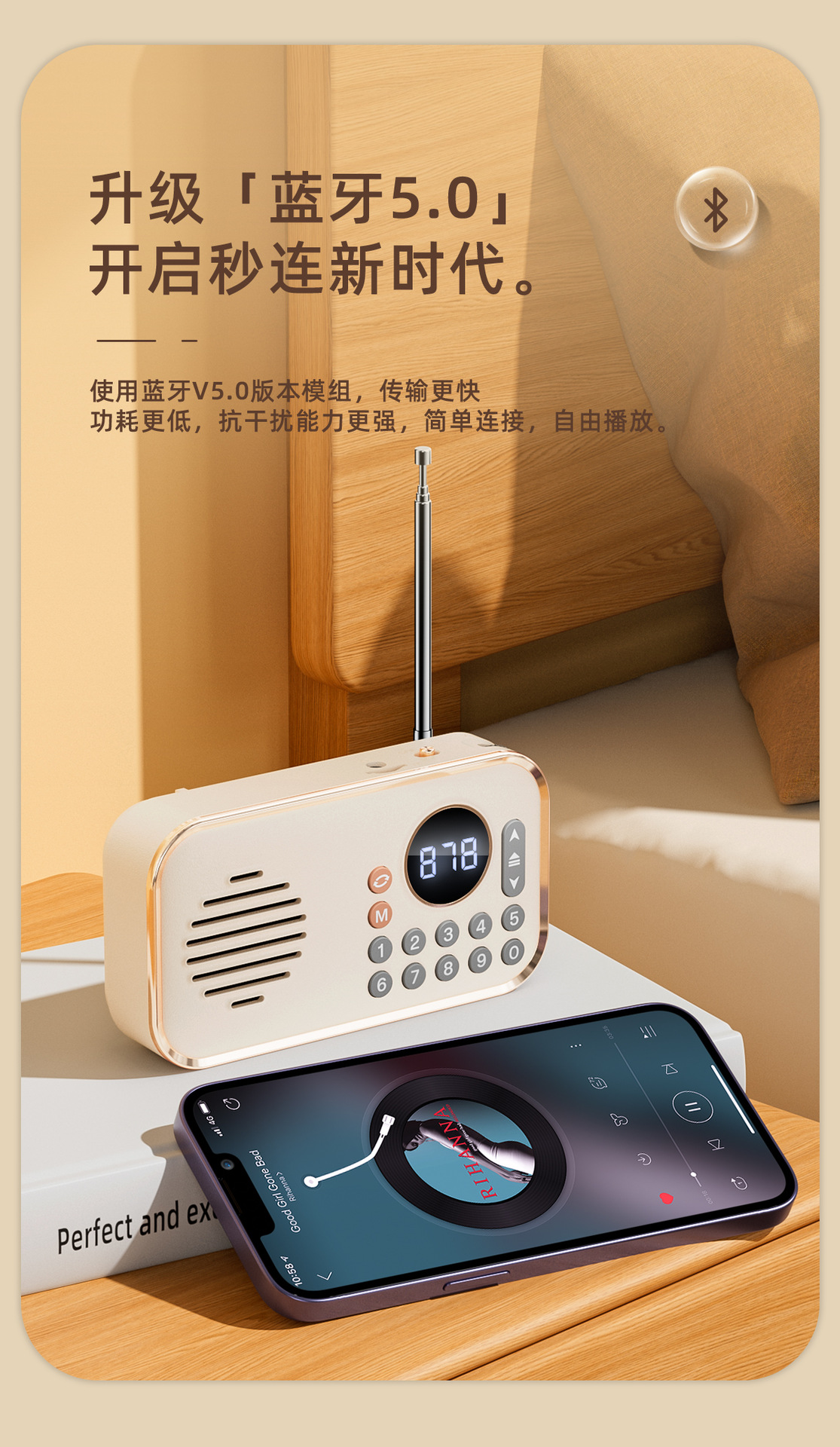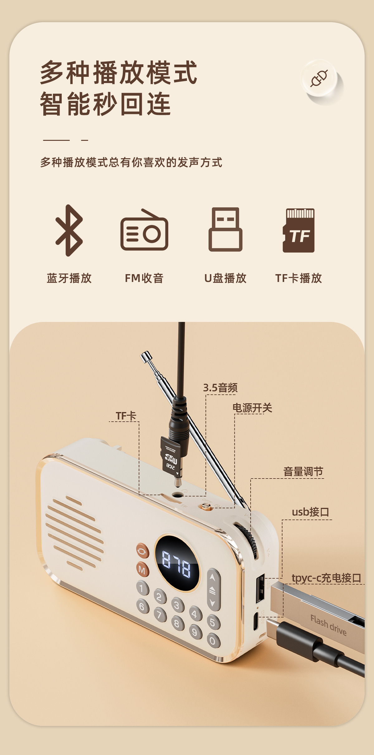 功能:收音机 蓝牙连接播放,,TF卡播放 优盘 AuX