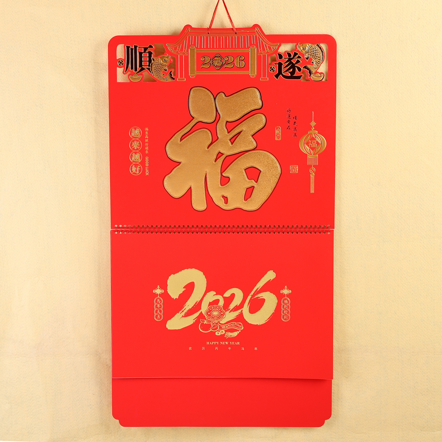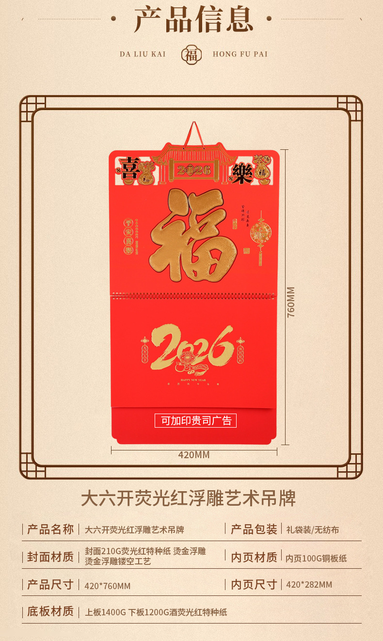 2026马年挂历定制新款福字日历来图定做大六开荧光红浮雕艺术吊牌 English | 投诉