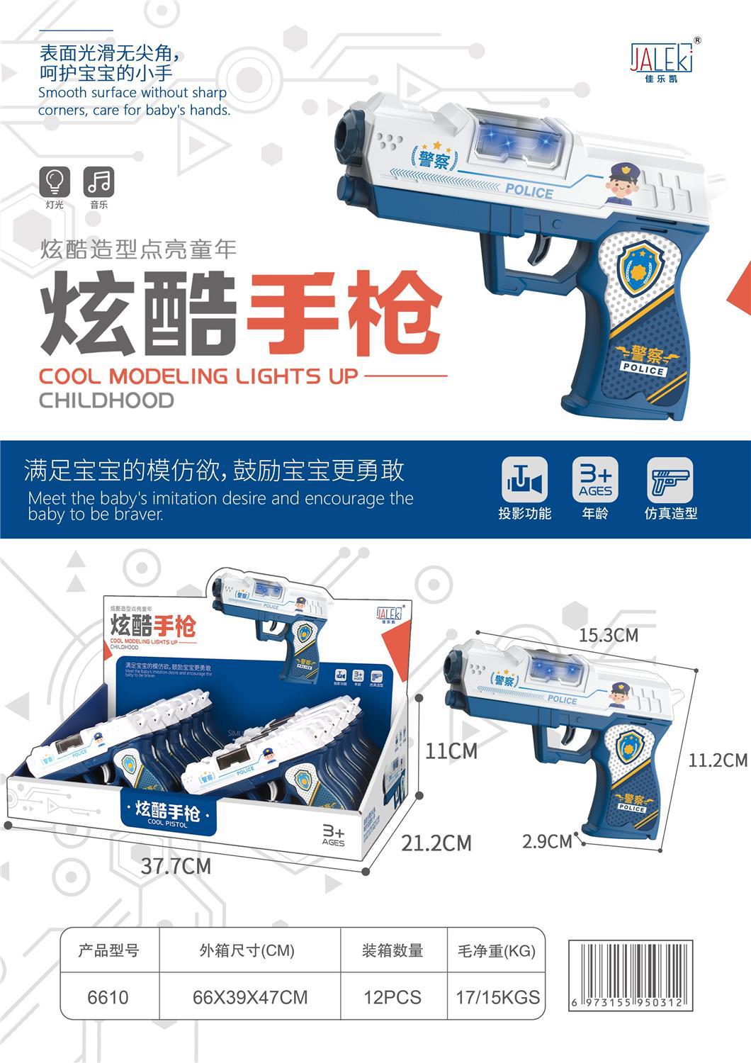 玩具材质: 塑料 品牌: 佳乐凯 遥控方式: 手柄 特色功能: 发光 发声 适用人群: 不限 适用年龄: 儿童(4-6岁) 原产地: 澄海 是否进口: 国产 包装: 彩盒 是否有动漫形象: 否 货号: 6610 专利及著作权申请时间: 2021 是否有导购视频: 是 是否专供外贸: 否 3C配置类别: 14岁以下其它玩具 颜色: 6610投影枪/144只 是否跨境出口专供货源: 否 重量: 0.5 kg/个