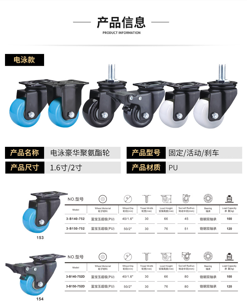 | 1. 6寸丝杆活动蓝宝玉PU轮 | ¥819 | 9998个可售 |