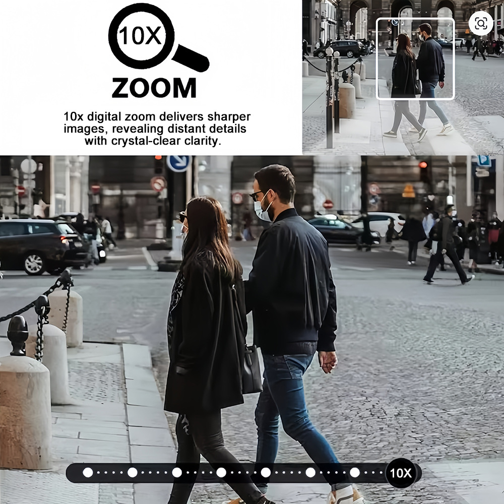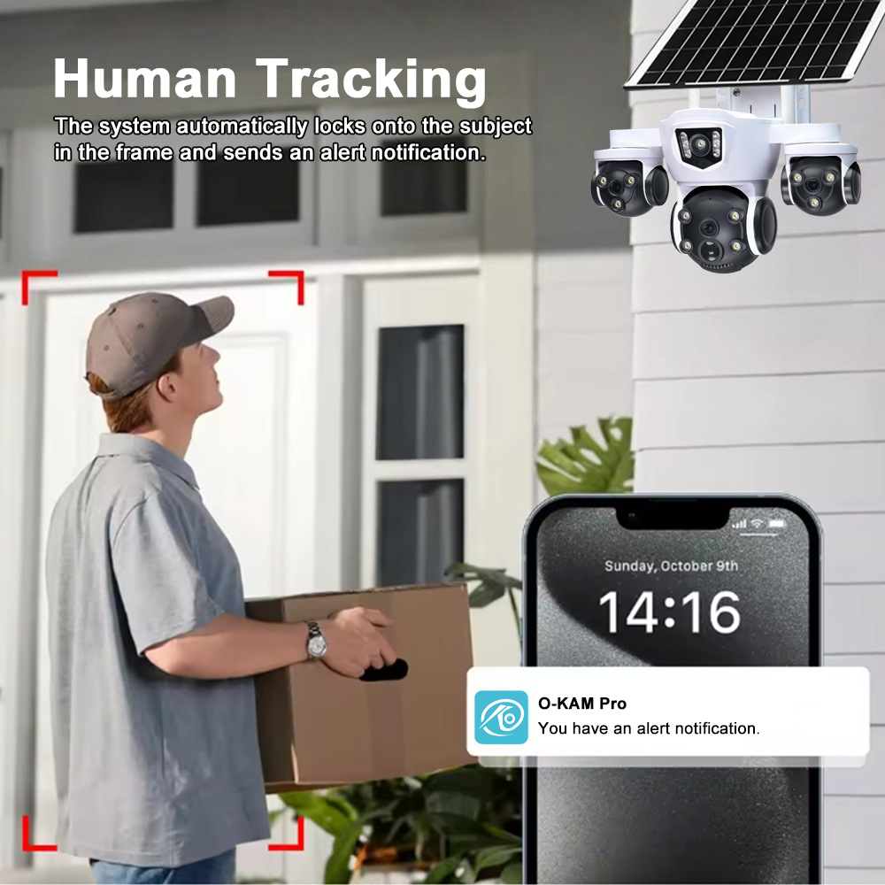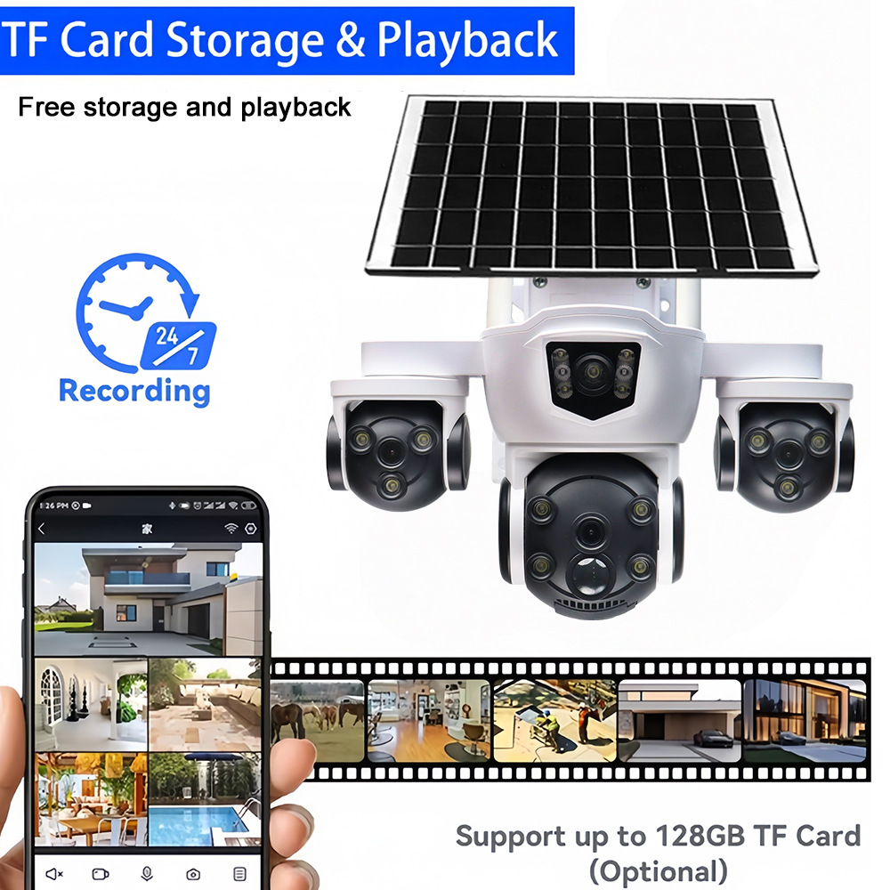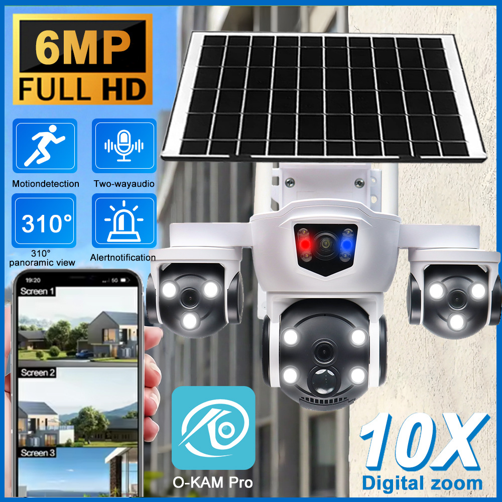 户外太阳能监控摄像头 三镜头 10 倍变焦 6MP 高清 彩色夜视安防