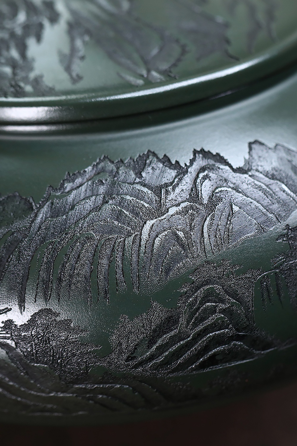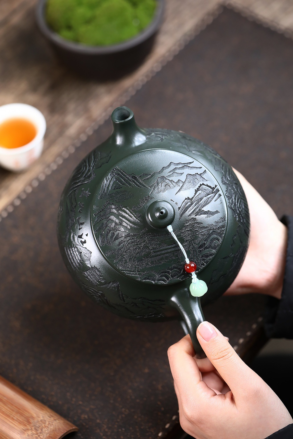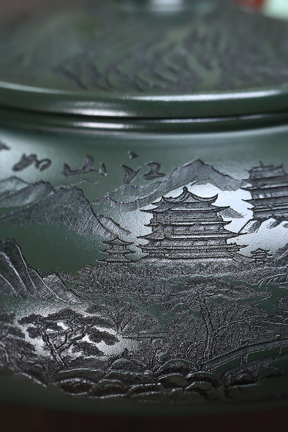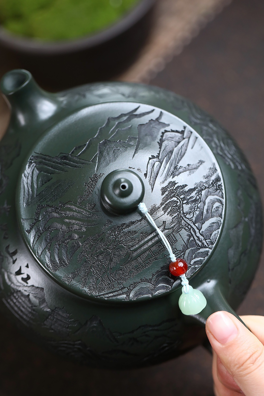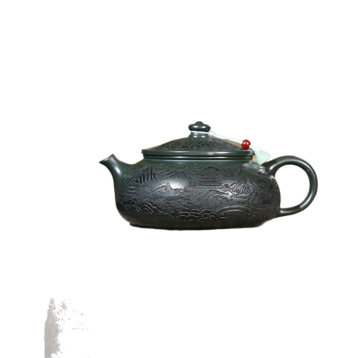 爆款分销代发大容量580C宜兴紫砂壶手工制作原矿翡翠绿泥满刻寒江