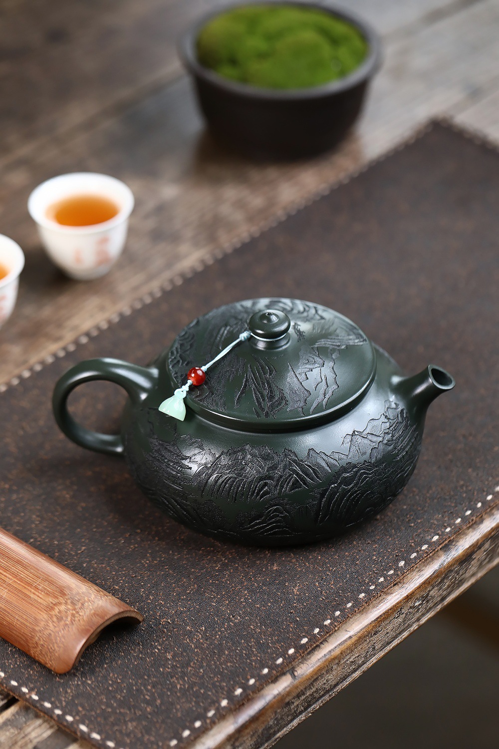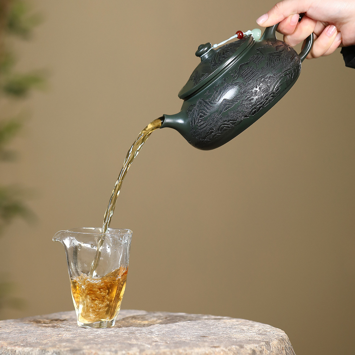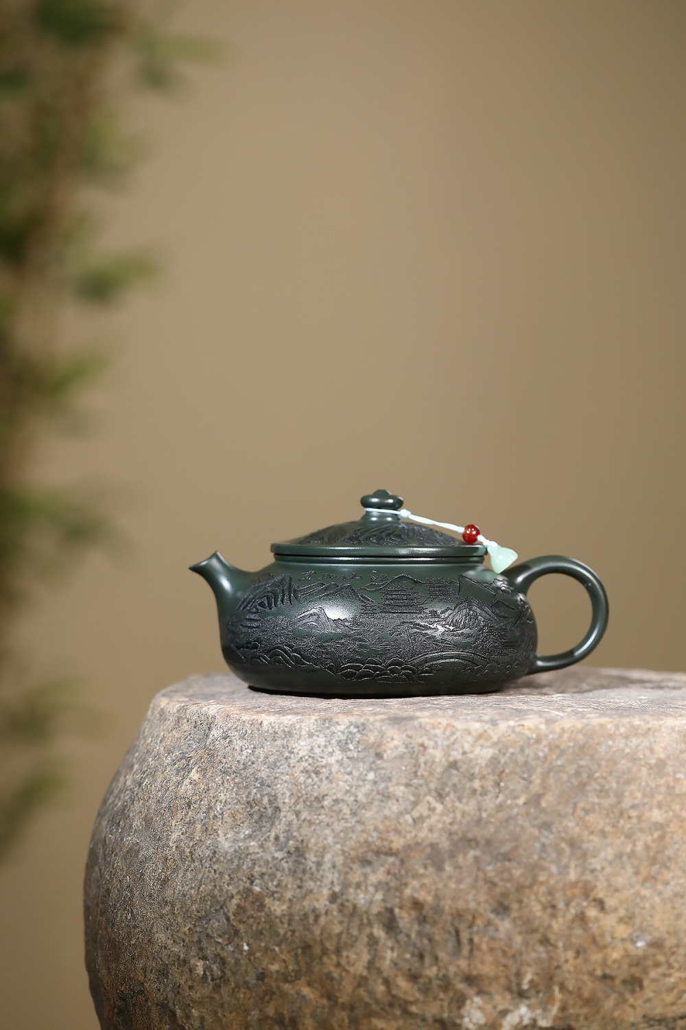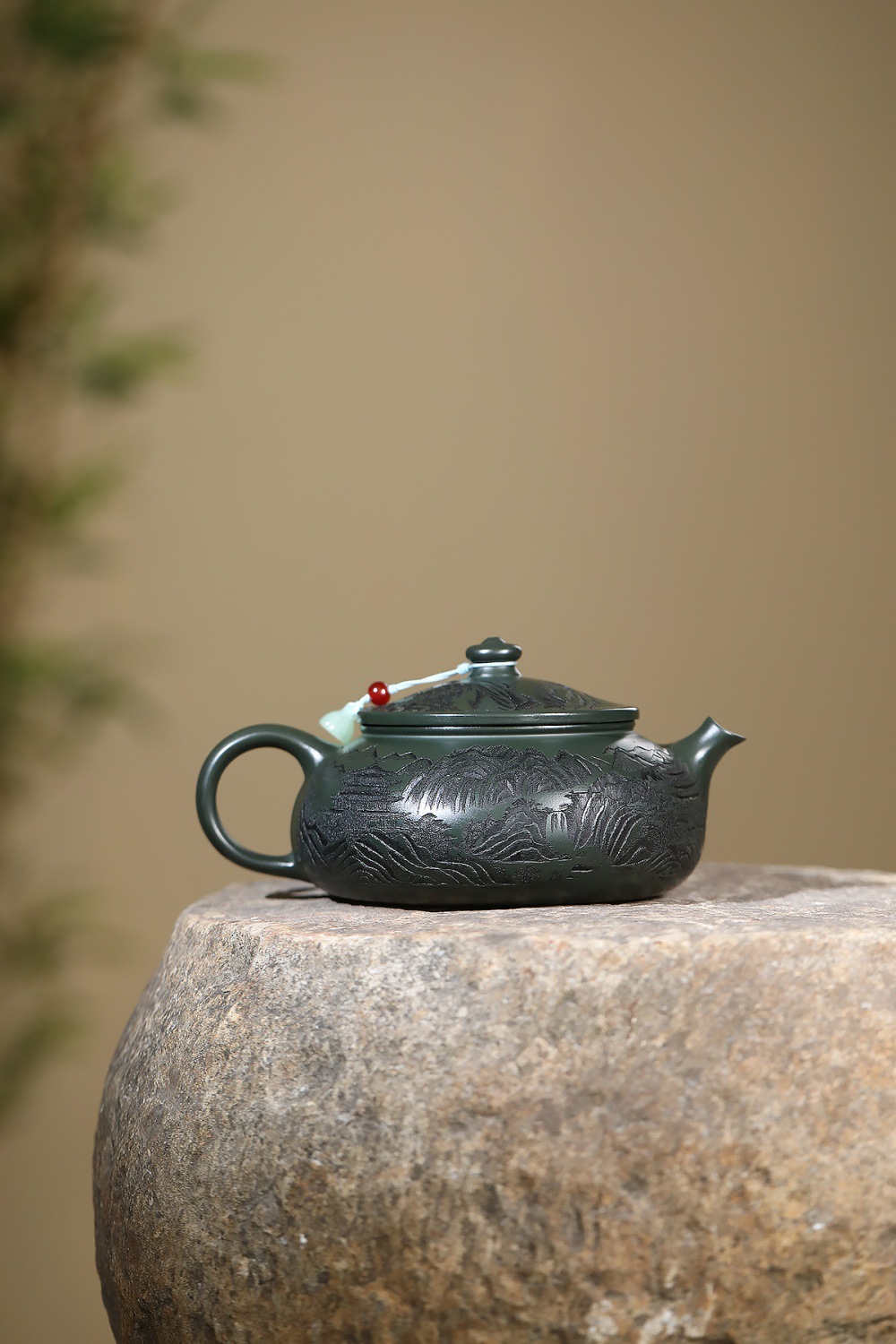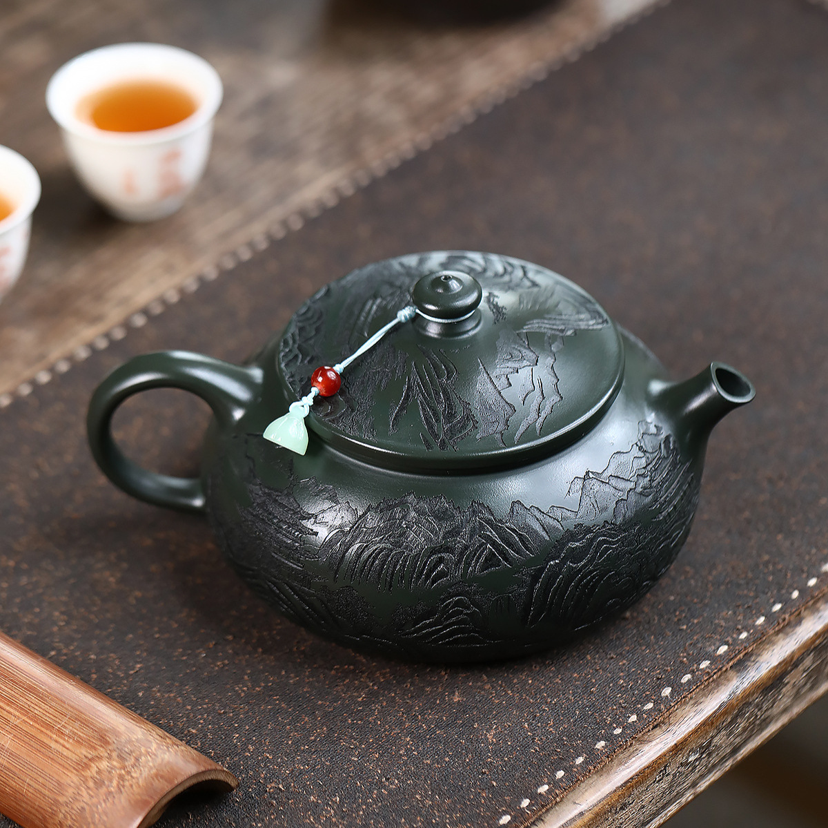 爆款分销代发大容量580C宜兴紫砂壶手工制作原矿翡翠绿泥满刻寒江