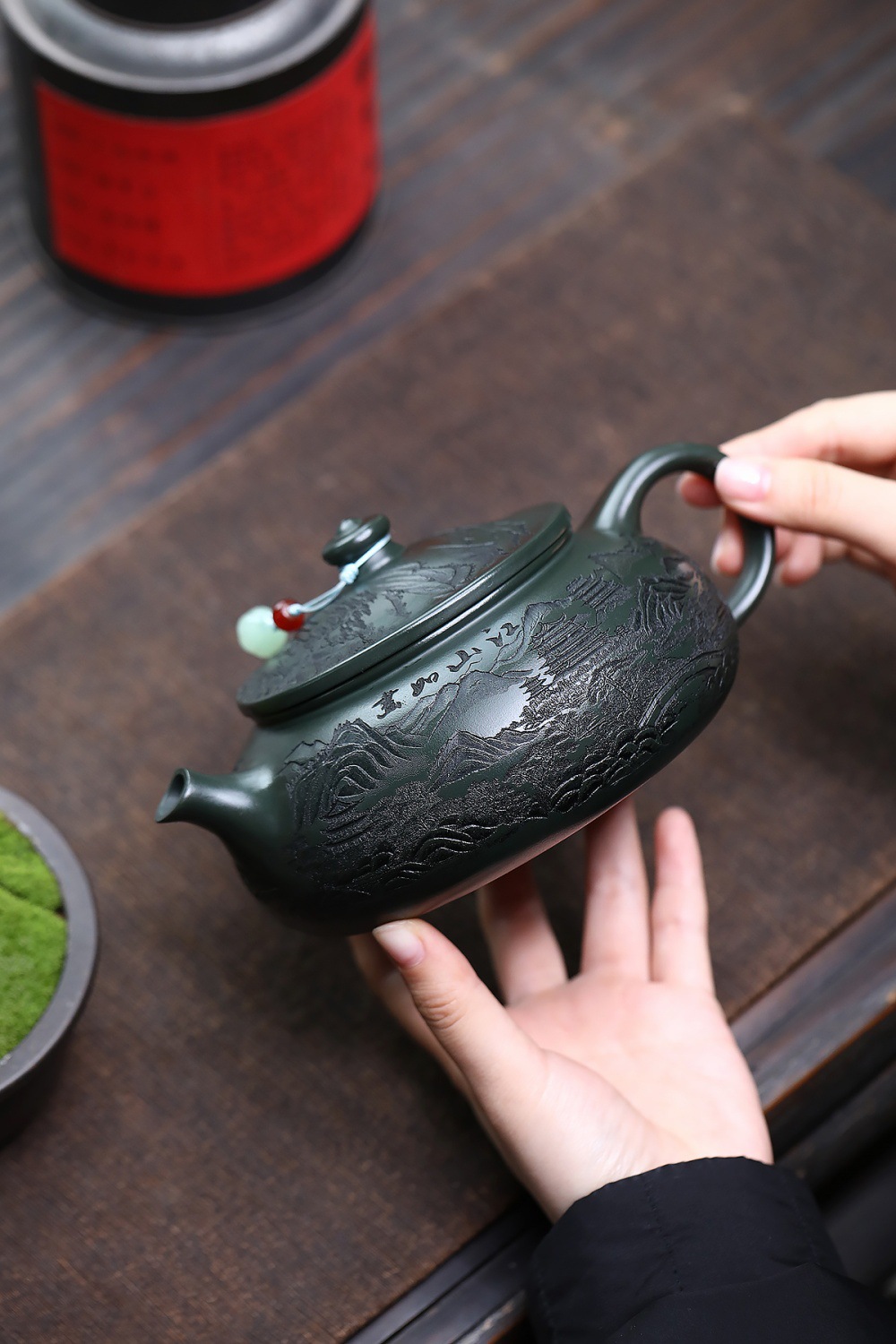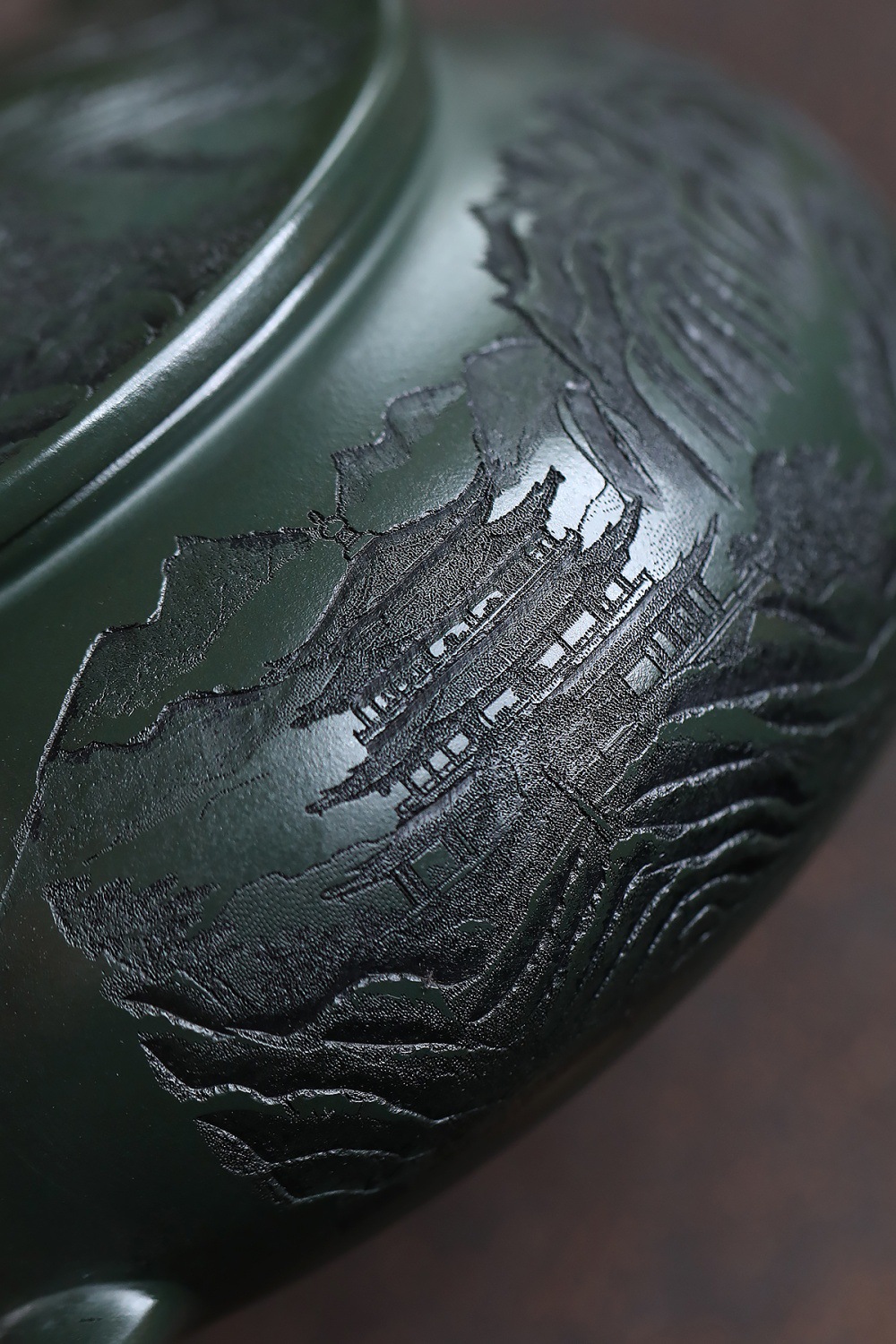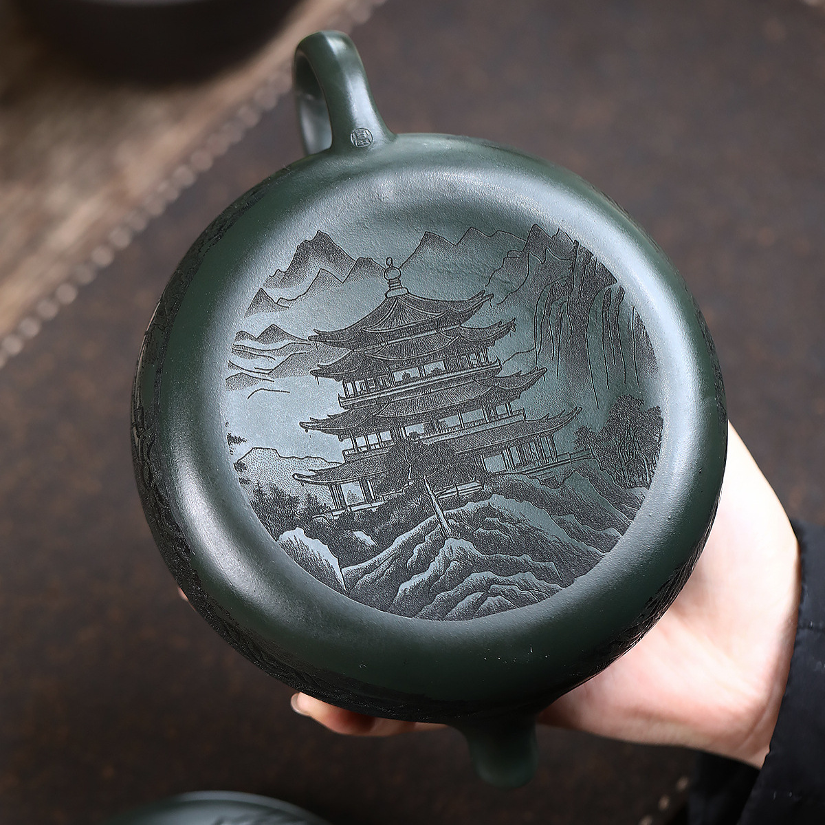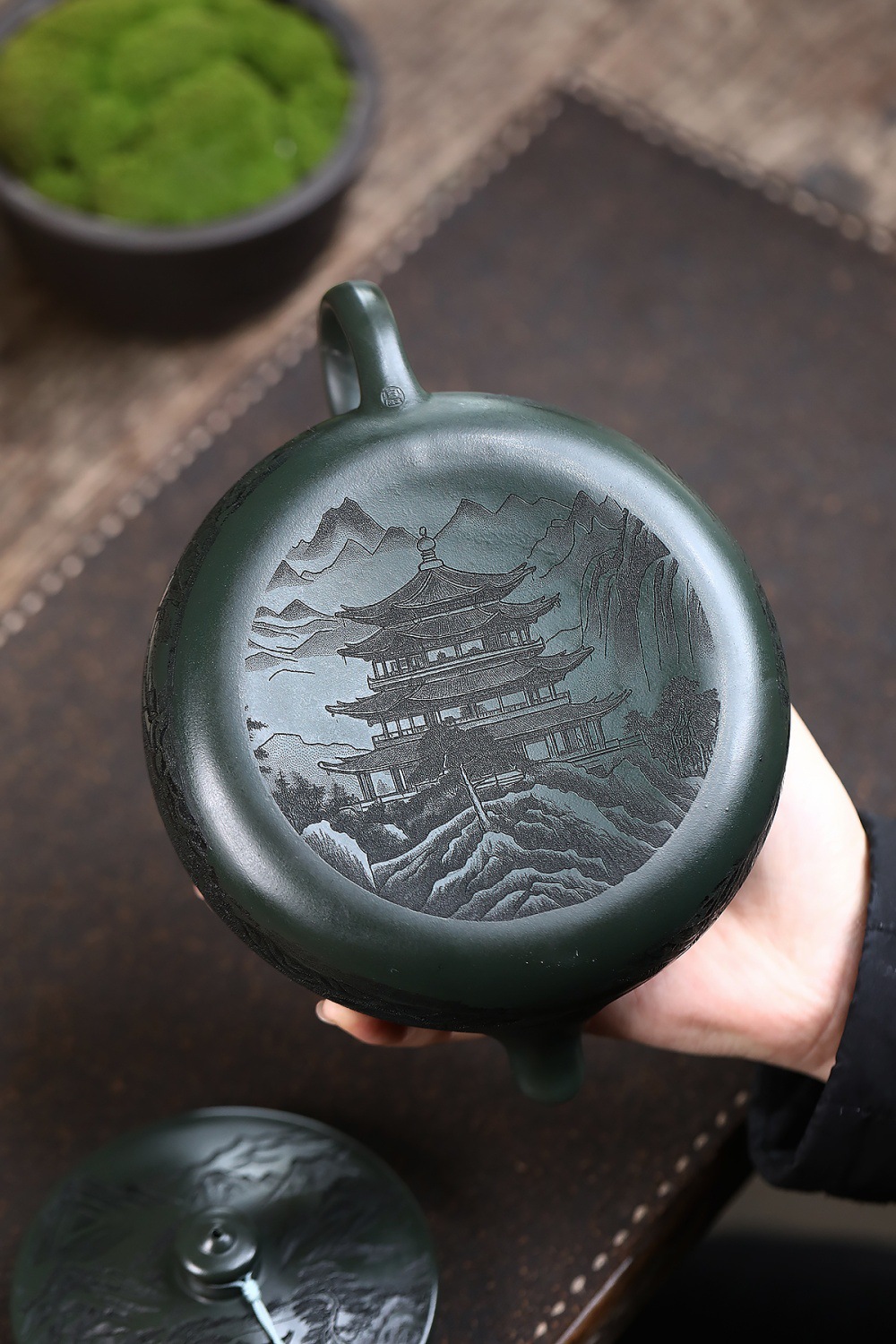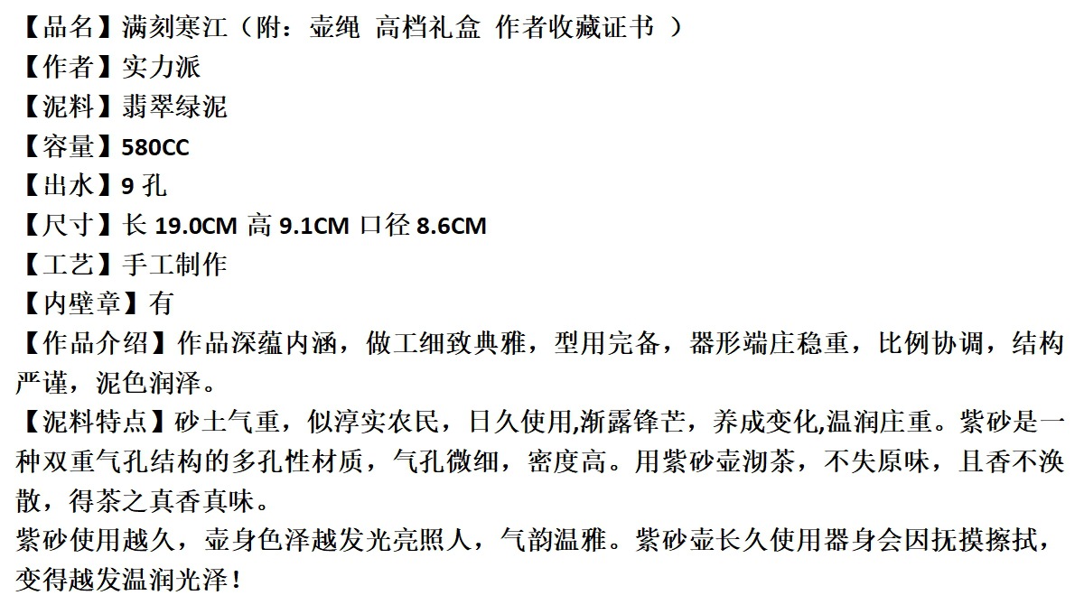 爆款分销代发大容量580C宜兴紫砂壶手工制作原矿翡翠绿泥满刻寒江 投诉
