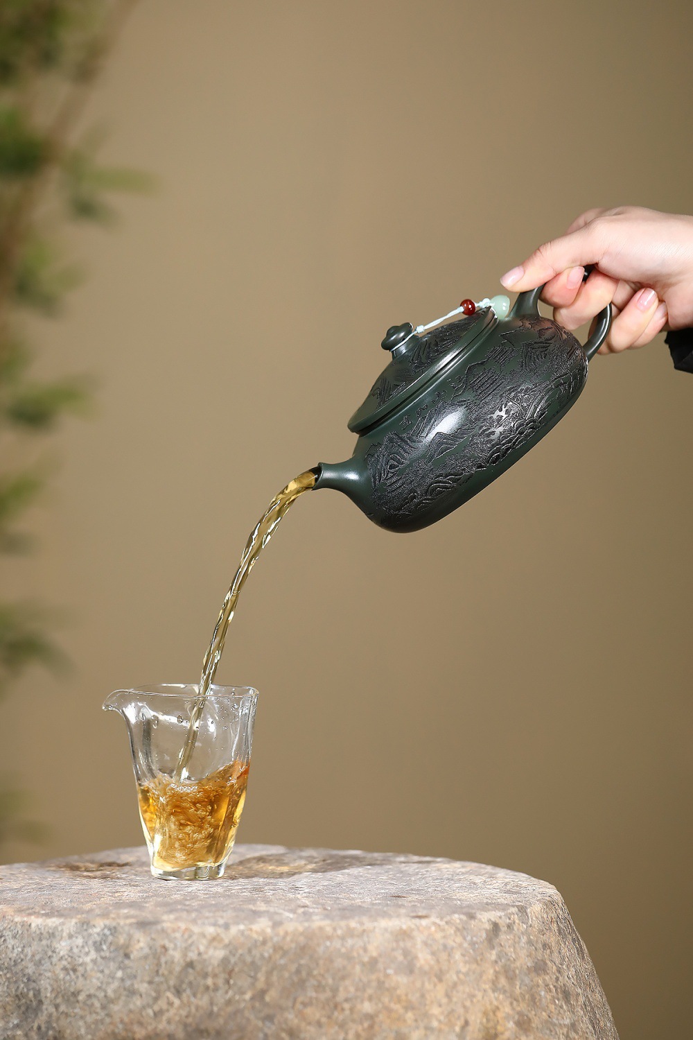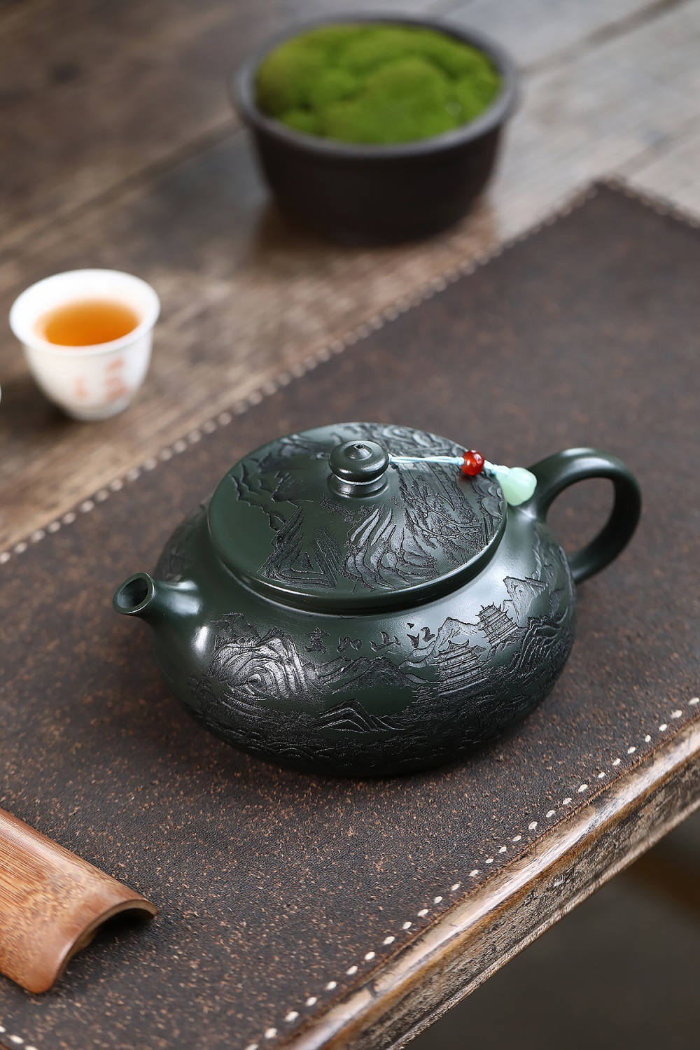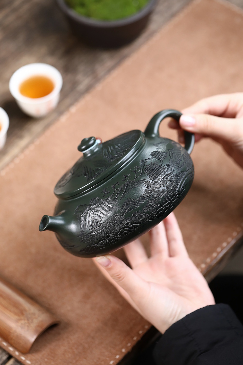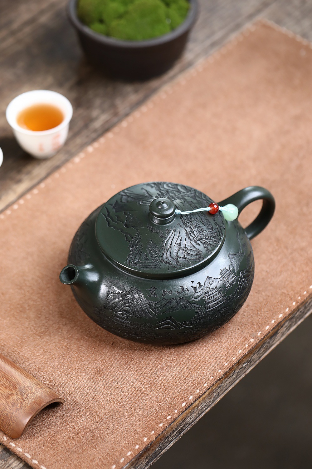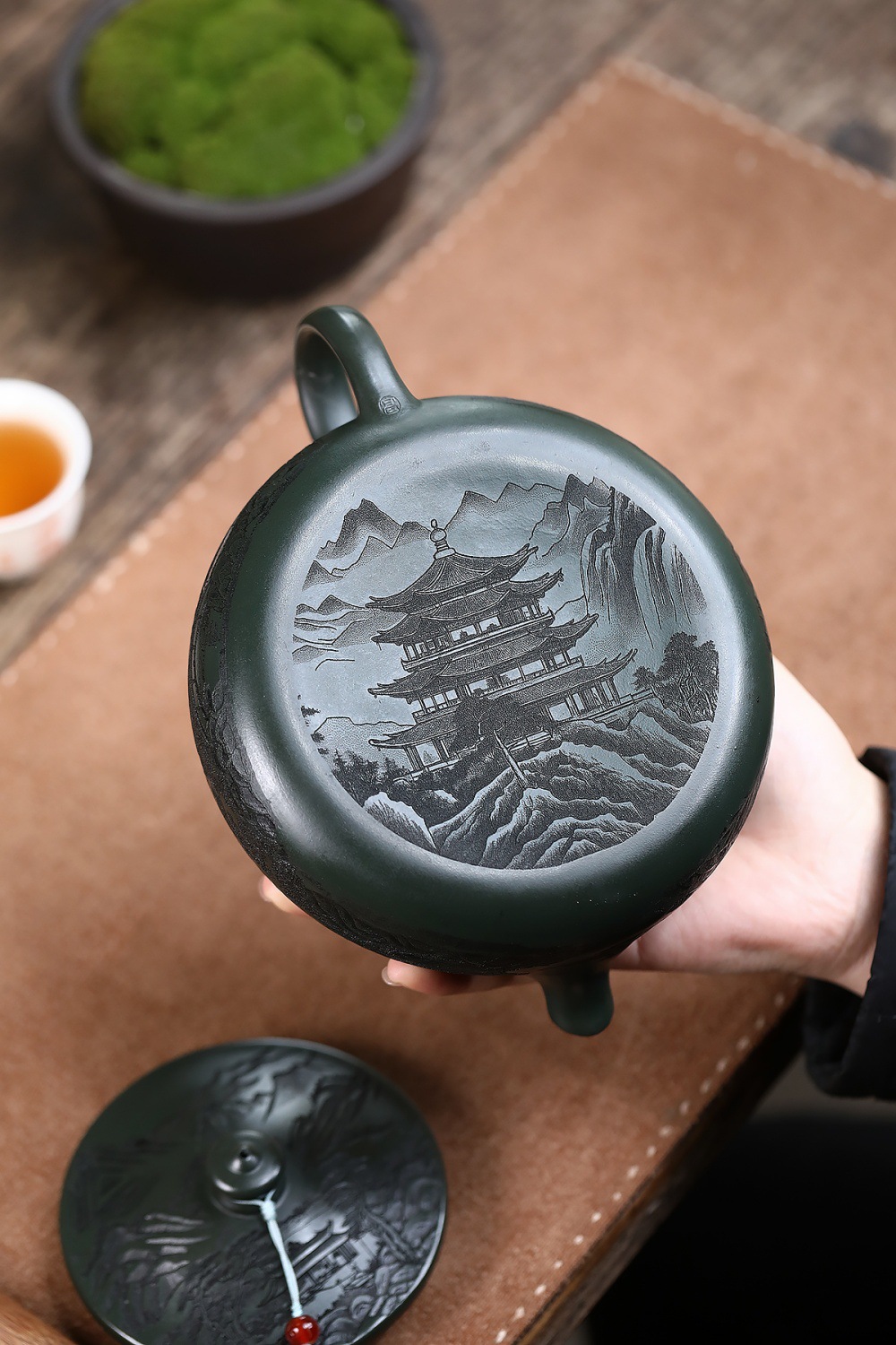 爆款分销代发大容量580C宜兴紫砂壶手工制作原矿翡翠绿泥满刻寒江 投诉