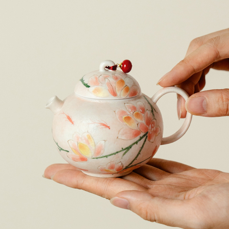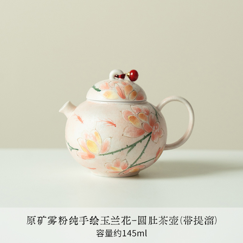 高颜值原矿雾粉纯手绘玉兰花圆肚茶壶带提溜防烫家用泡茶壶陶瓷