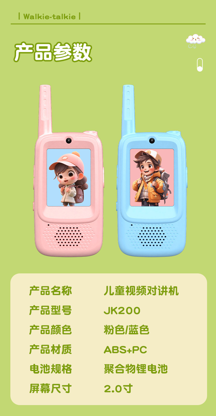 品牌: 无 玩具材质: 塑料/塑胶 电子玩具类别: 对讲机 适用人群: 不限 适用年龄: 儿童(4-6岁) 包装: 彩盒 原产地: 深圳 能力培养: 情感 是否有动漫形象: 否 货号: JK200 是否有导购视频: 否 是否专供外贸: 否 3C配置类别: 14岁以下其它玩具 颜色: 单个,不建议拍(需一对使用),套装蓝粉各 主要下游平台: 其他 主要销售地区: 欧洲,南美,北美,中东 有可授权的自有品牌: 否 是否跨境出口专供货源: 是 规格: 视频基础版 音质清晰: 支持
