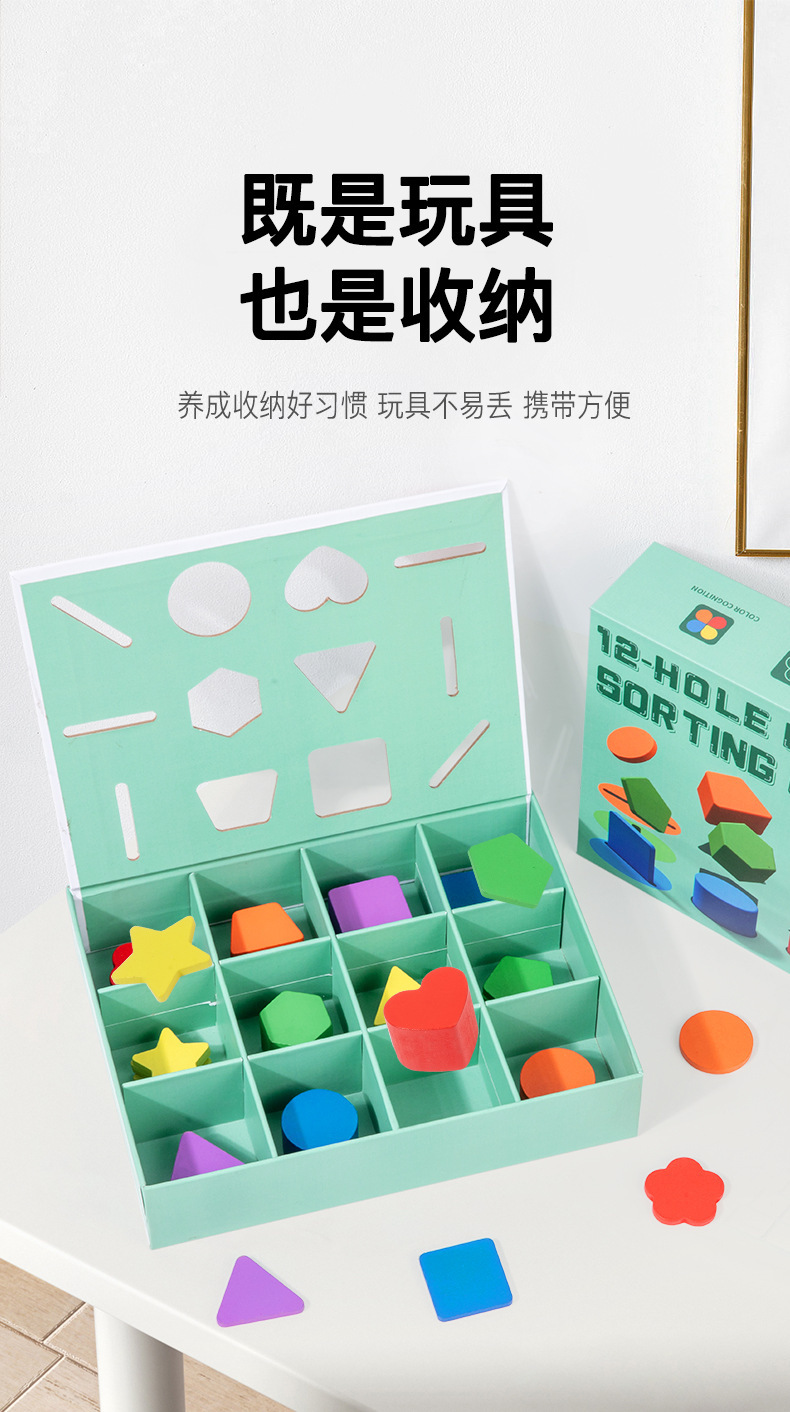 12孔颜色形状分类盒 产品尺寸22.5*17.5*5cm 重量0.7kg 装箱数36套 外箱尺寸49.5*36*45.5cm