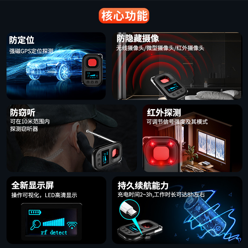 酒店防偷拍摄像头探测器防跟踪防偷拍防窃听红外探测报警器