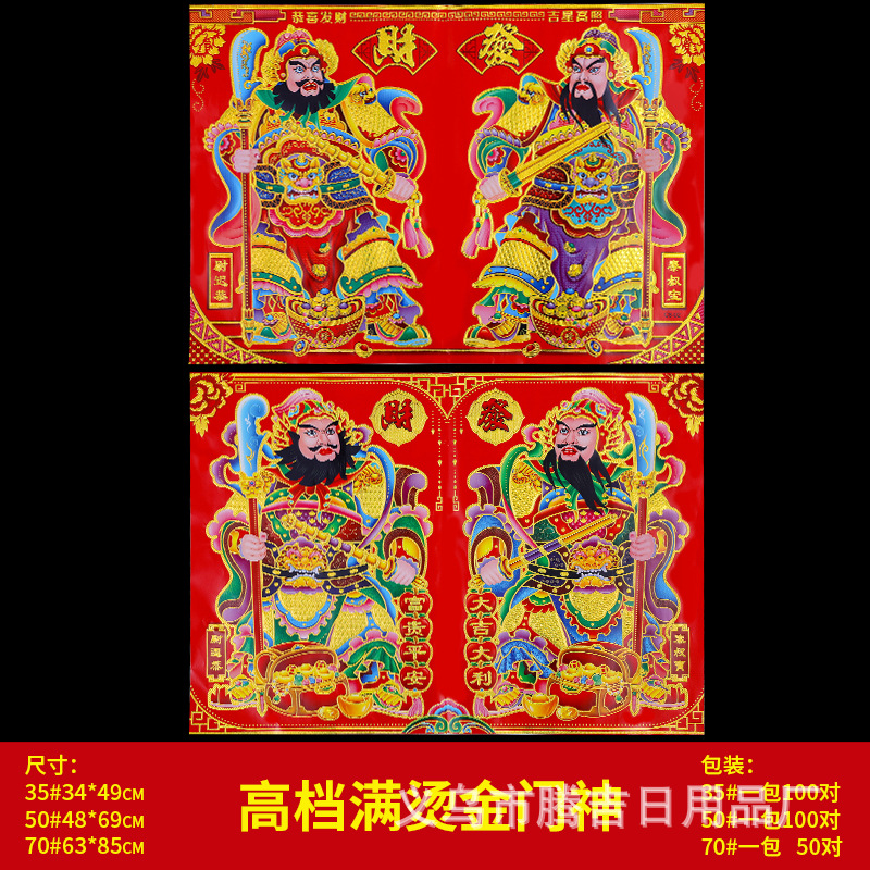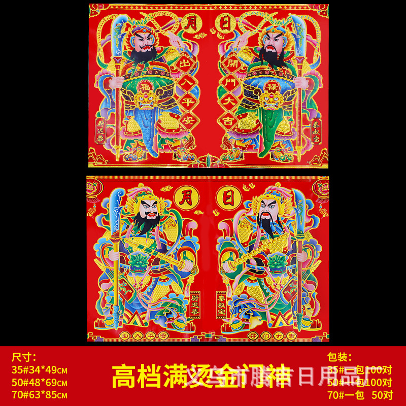 2025蛇年新款满烫金门神已经上架,门神50#一包100张,款式随机发,70#门神一包里面是50对,中间裁开,建议大家按照整包下单,这样不容易损坏。。。 满烫金门神