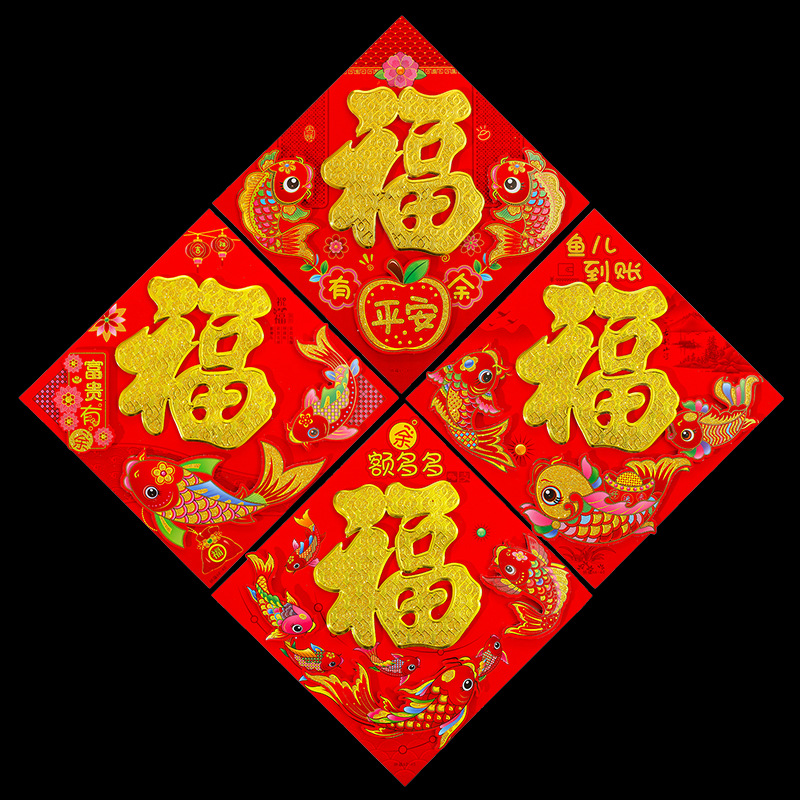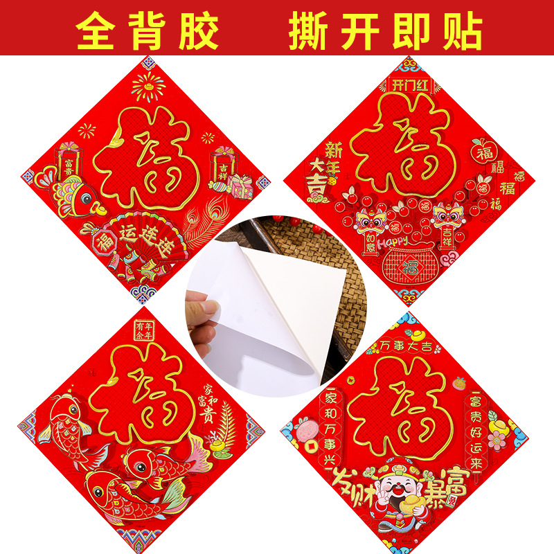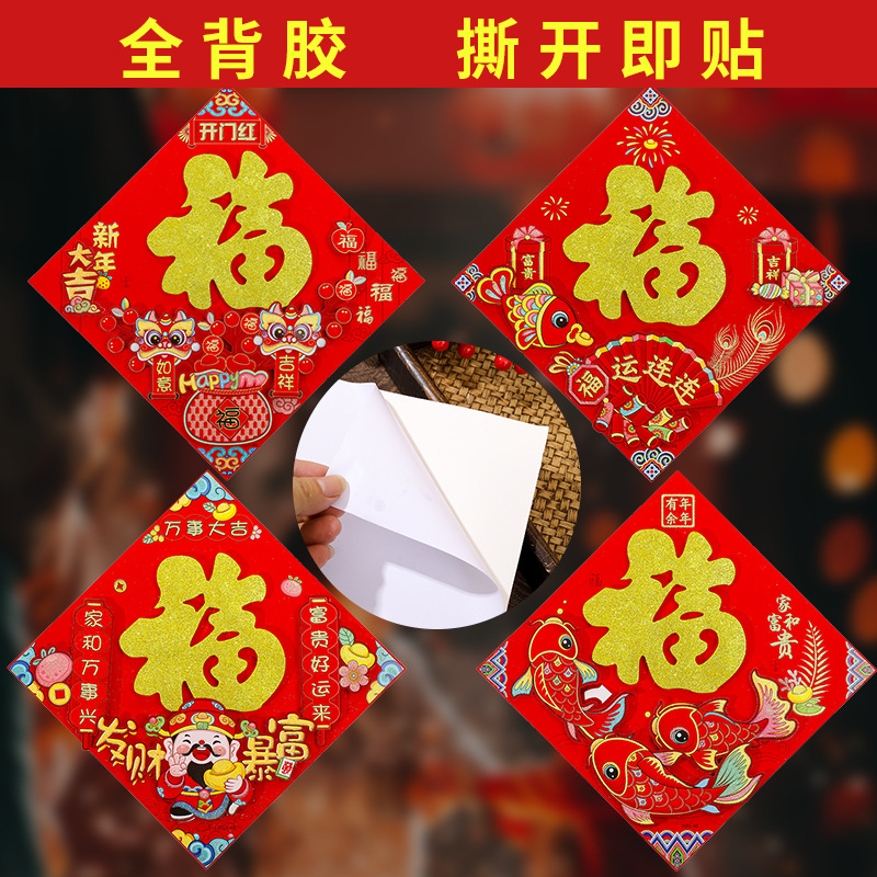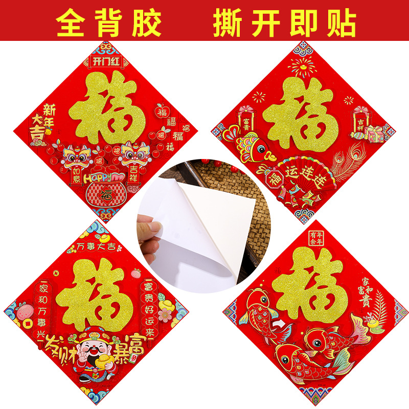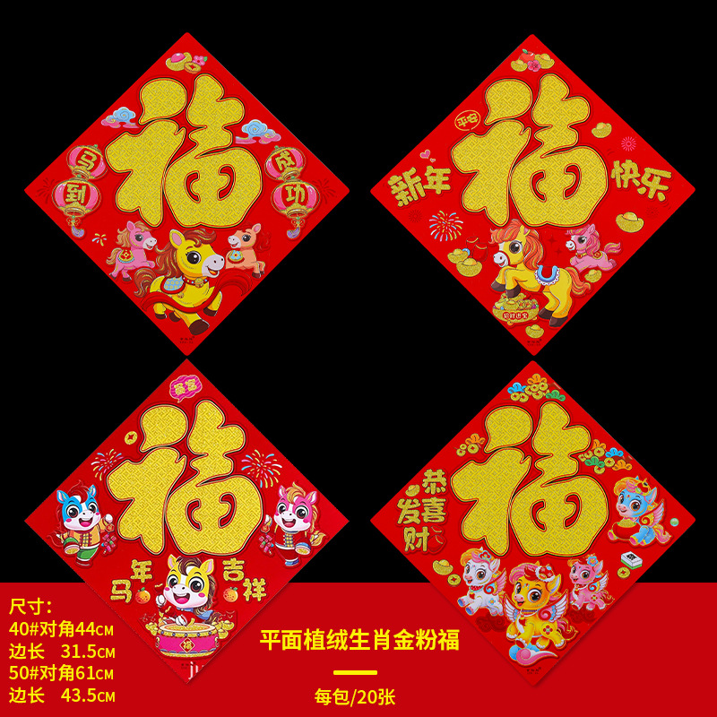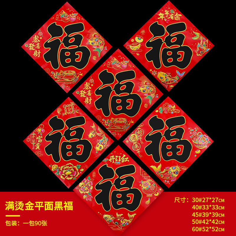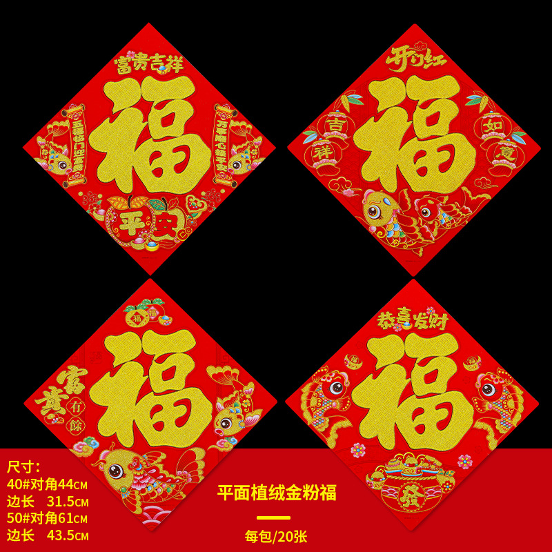 腾吉春节喜庆用品厂家专业生产福字门贴年画 主营产品有:福字 门贴 年画等一系列春节用品 实力厂家一手货源物美价廉,放心选购。 烫金福字100张左右一个包装,平面植绒金粉福字20张一个包装一个款式,无指定福字款式随机发货,。