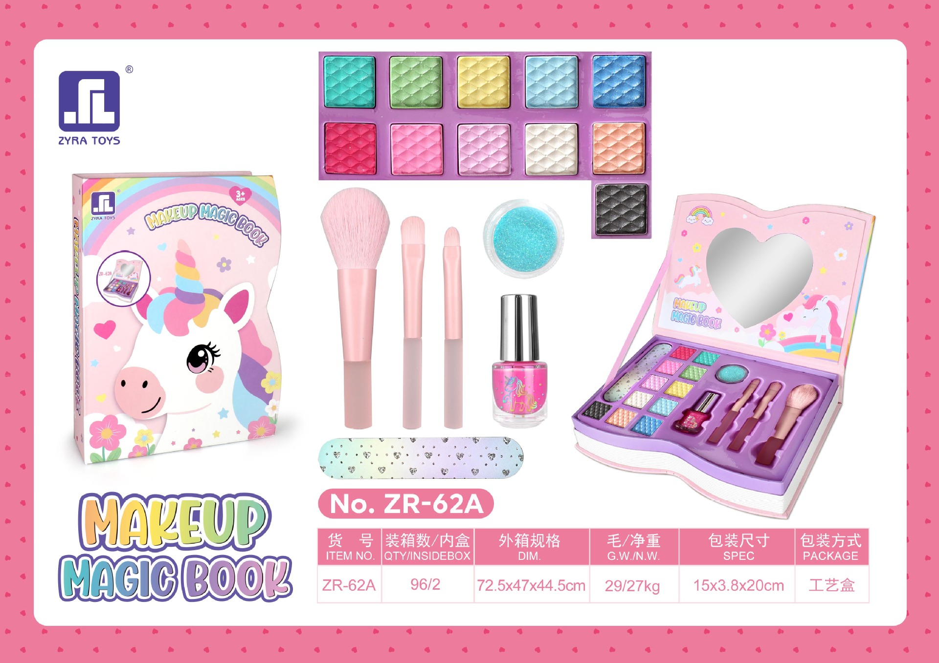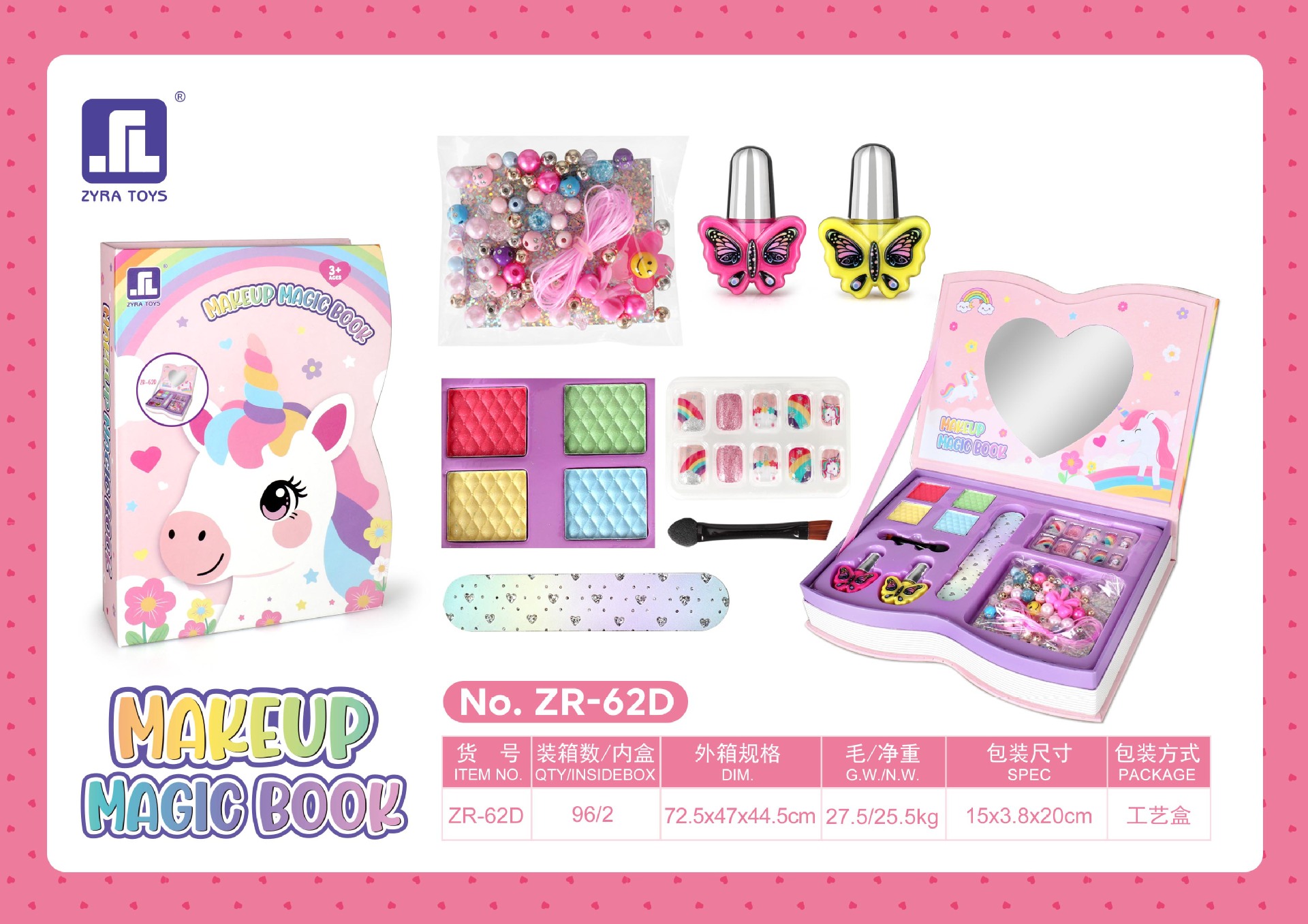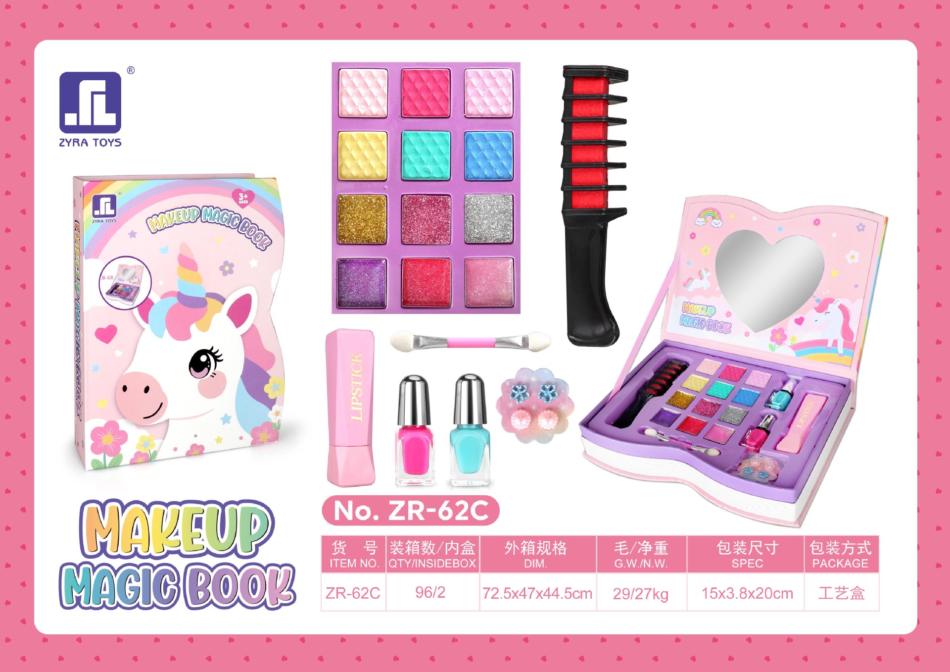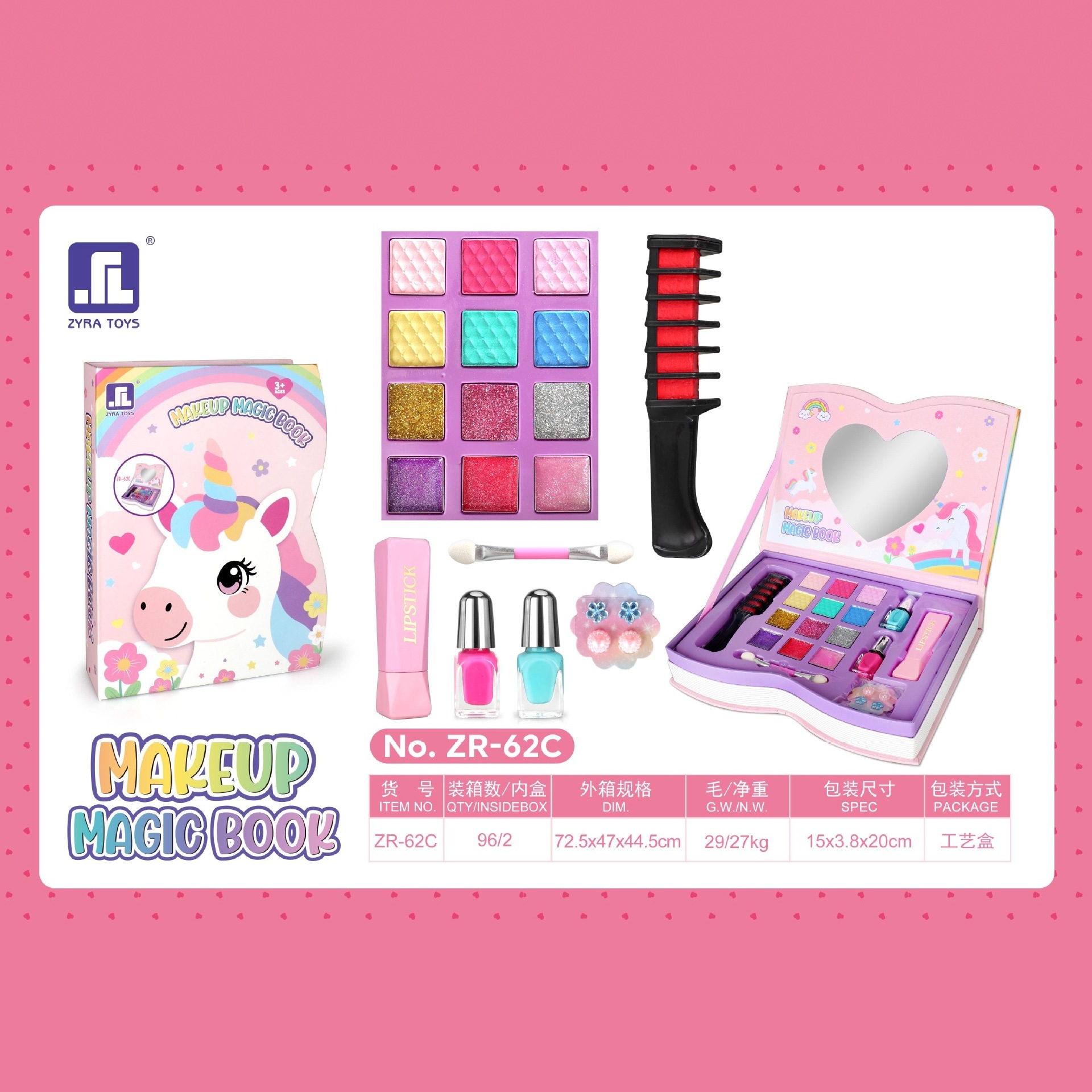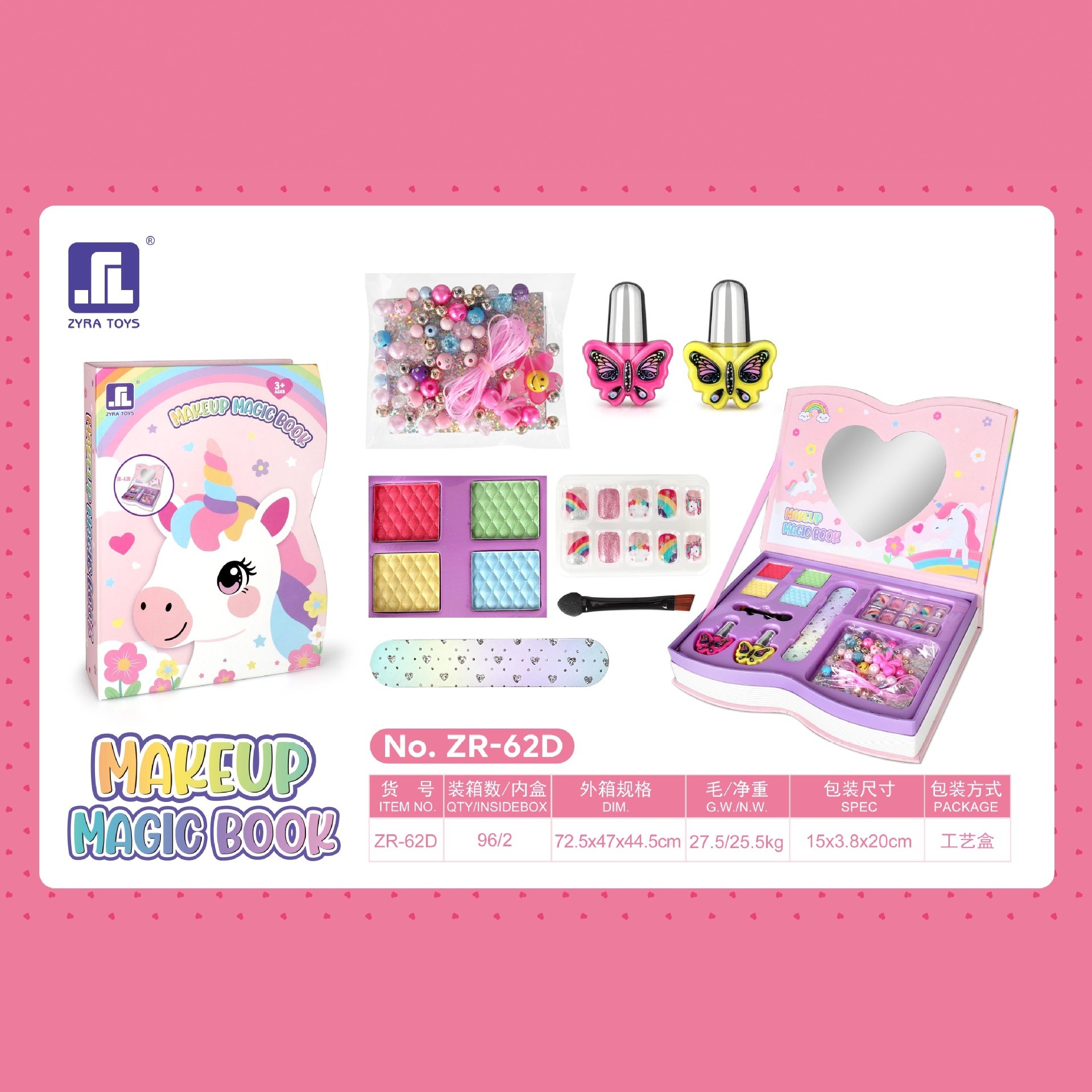 适用年龄: 儿童(4-6岁) 能力培养: 兴趣培养 货号: ZR-62A 特色功能: 配件丰富、款式新颖、携带方便 是否进口: 否 包装: 彩盒 玩具材质: 塑料/塑胶 类型: 仿真化妆台 是否专供外贸: 是(本商品仅供外贸用途,可能不符合境内产 主要下游平台: ebay,亚马逊,wish,速卖通,独立 主要销售地区: 非洲,欧洲,南美,东南亚,北美,东北亚, 是否跨境出口专供货源: 是 规格: ZR-62A,ZR-62B,ZR-62C 非特化妆品备案证号: 粤G妆网备字2019305396 特殊用途化妆品: null 重量: 1.0 kg/盒