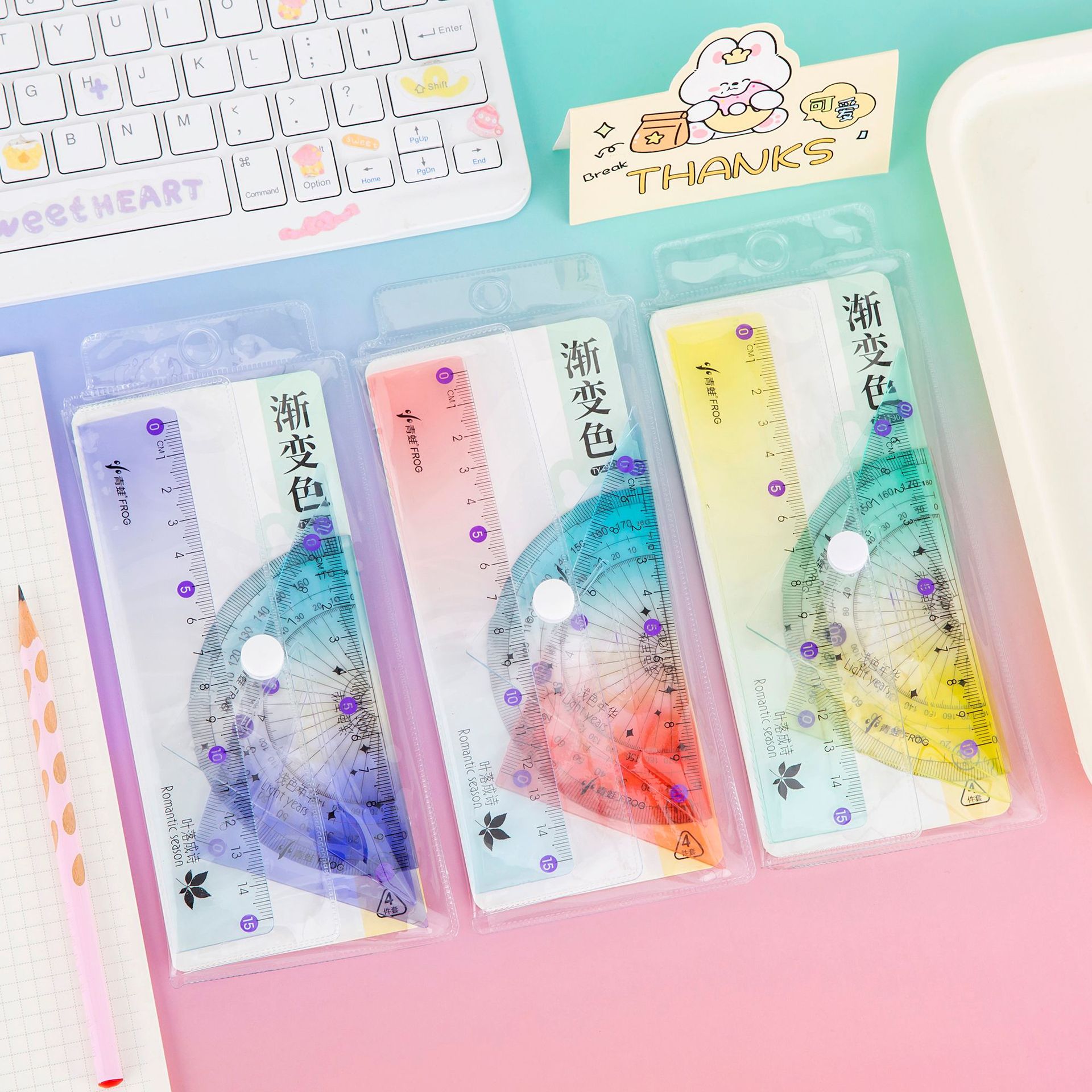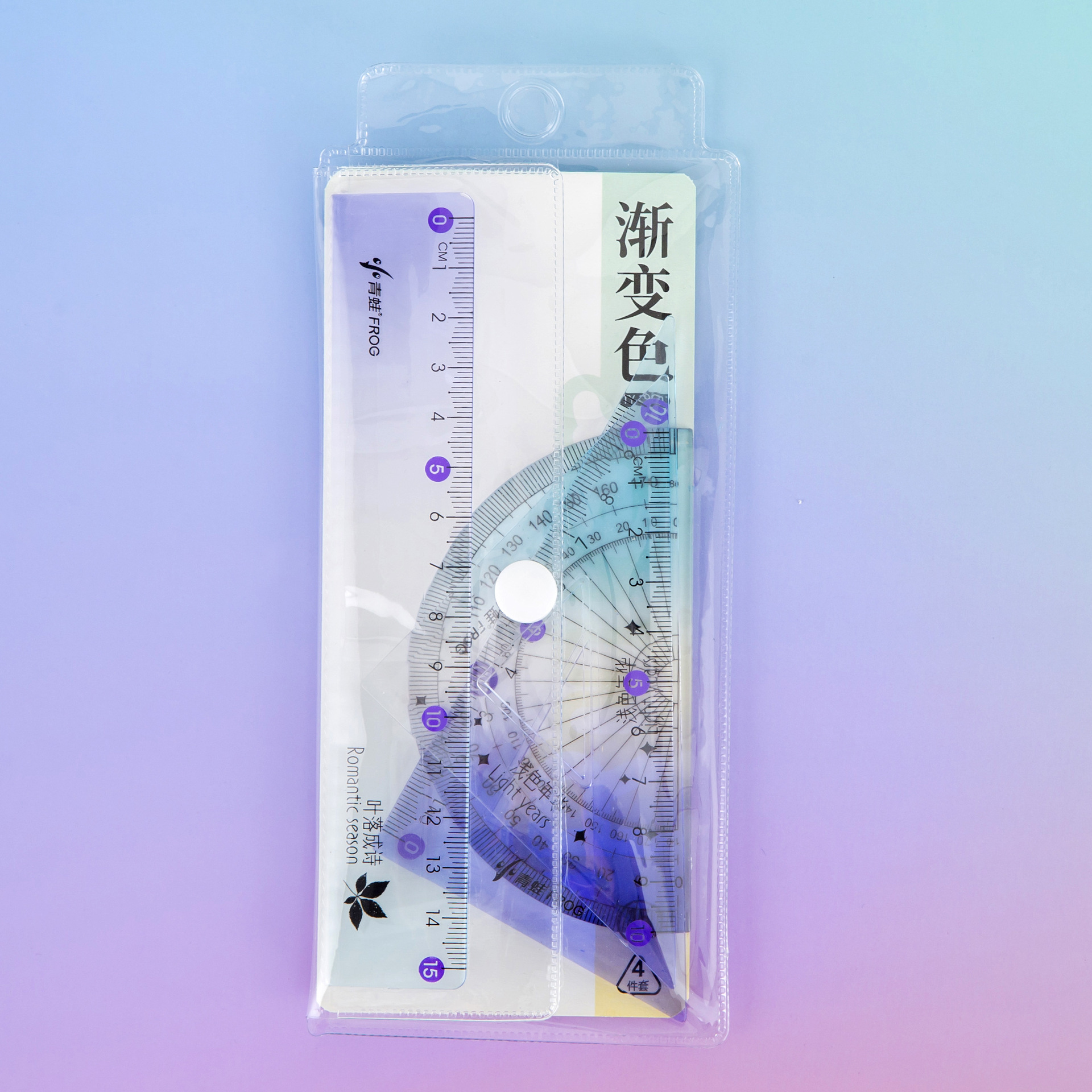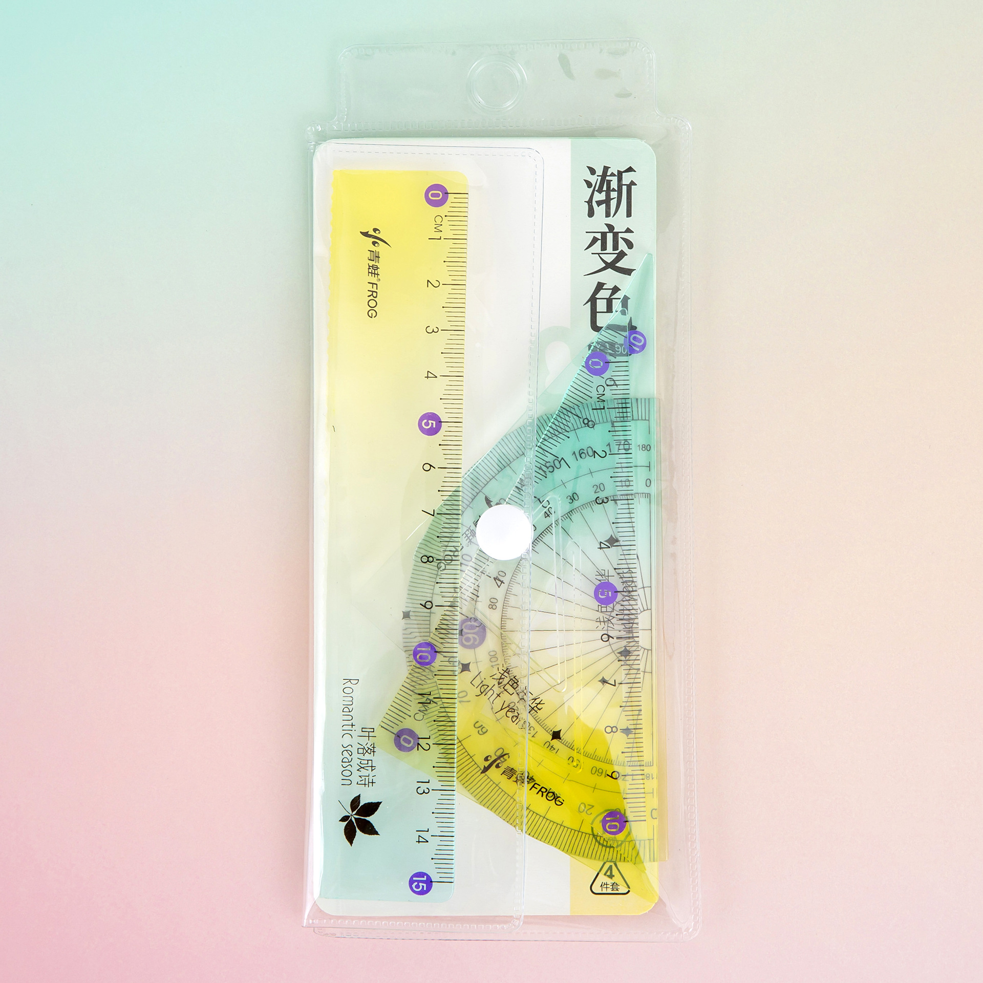 渐变色套尺学生学习文具直尺四件套时尚简约三角双色渐变透明尺子