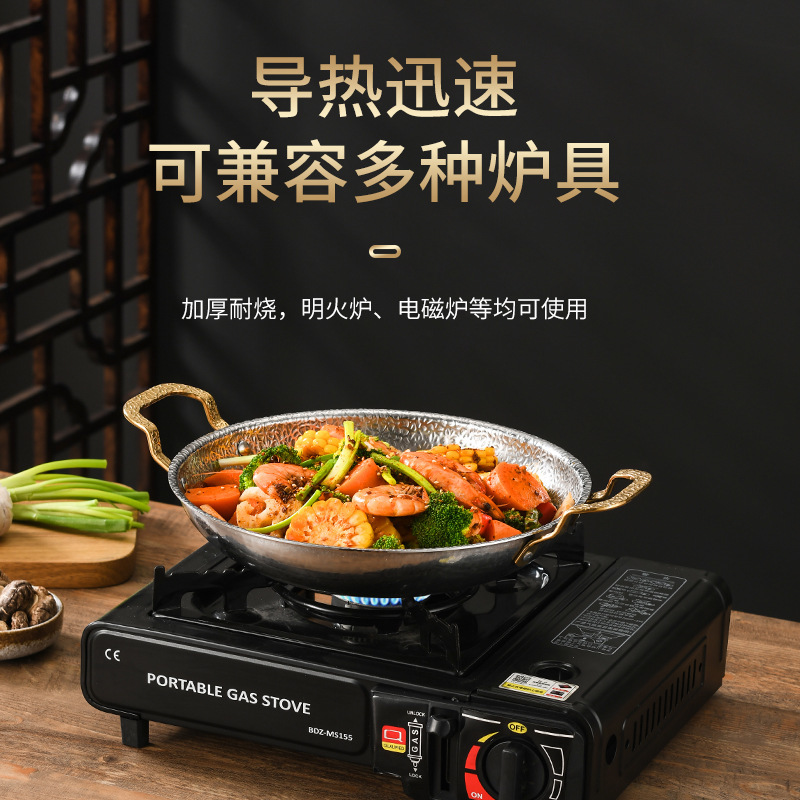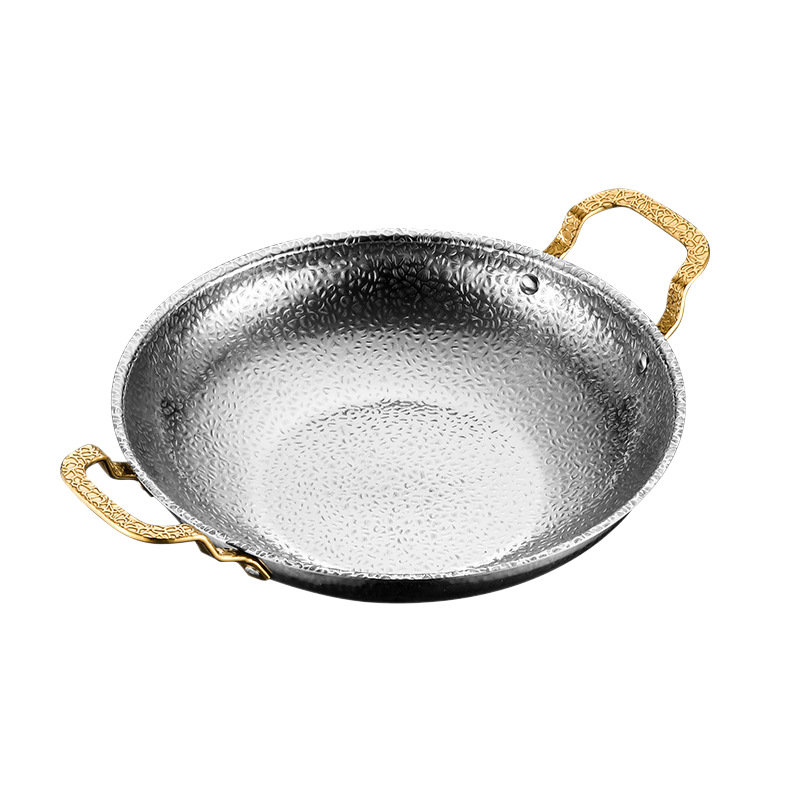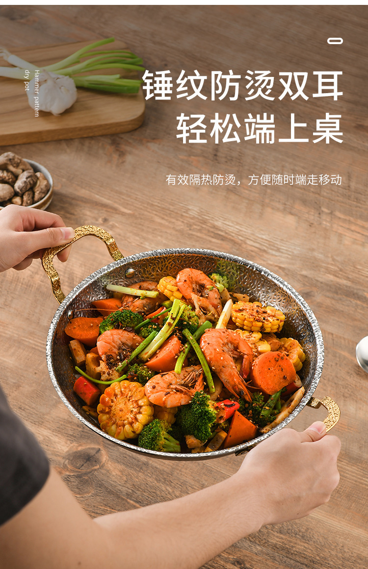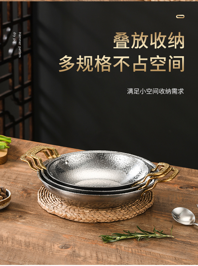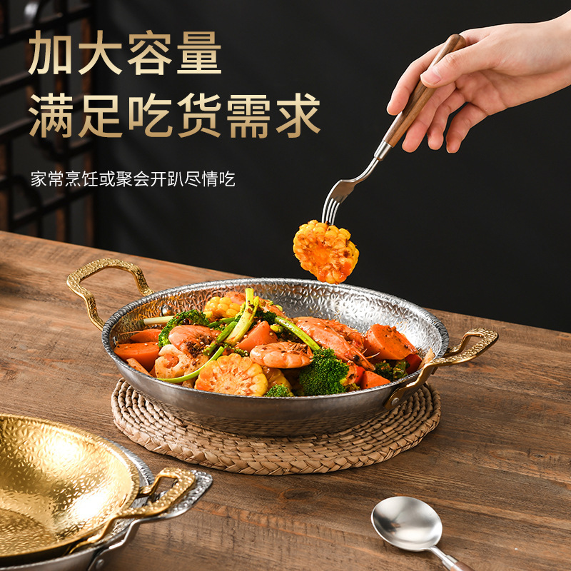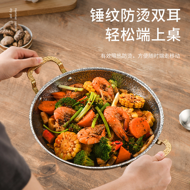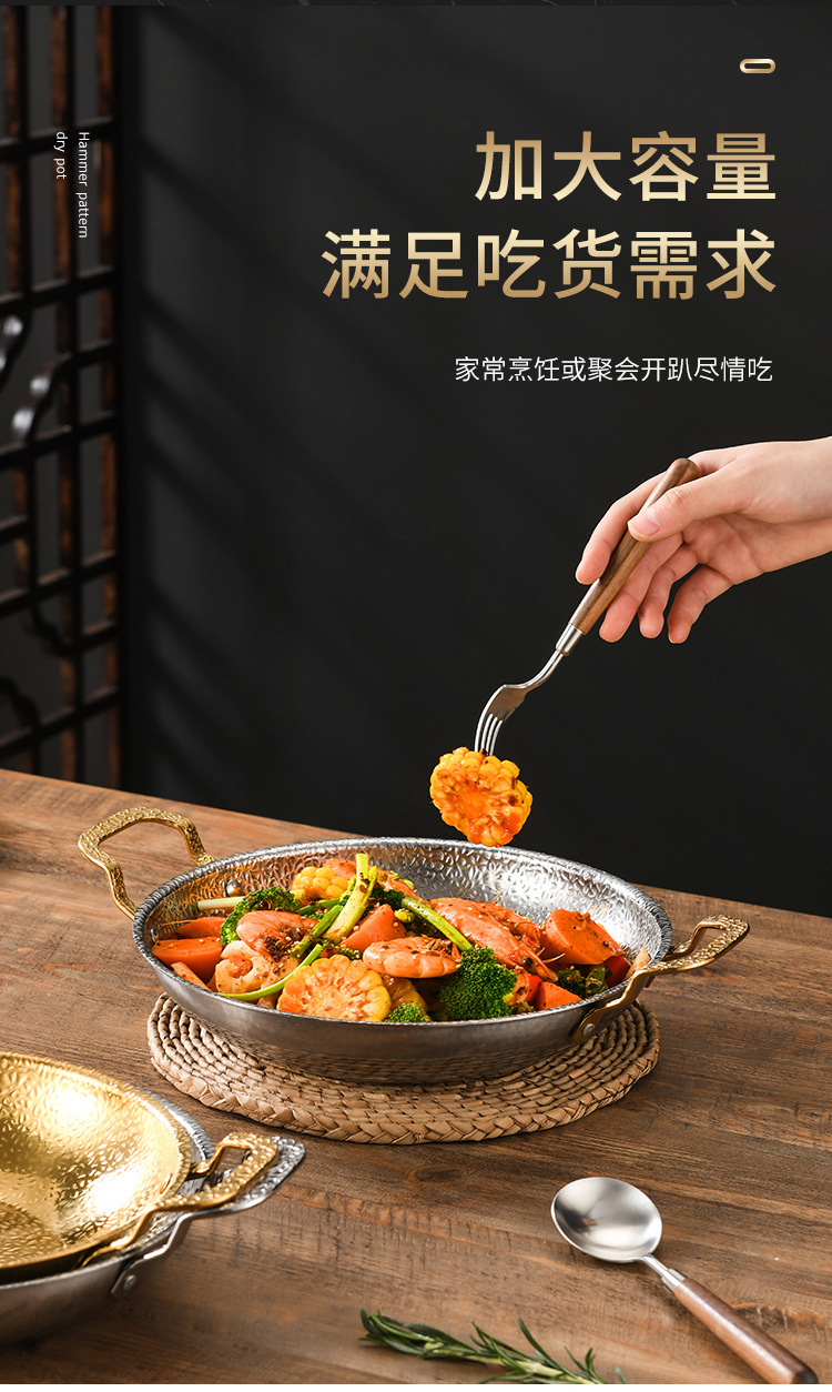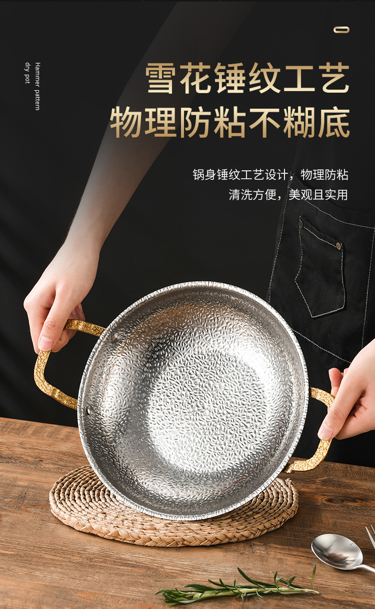 加厚不锈钢锅仔干锅酒吧鼎商用酒精炉专用锅饭店金色双耳小火锅盆 English | 投诉