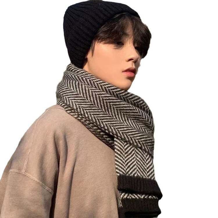 冬季男款围巾人字纹情侣百搭针织毛线保暖加厚菱格纹围脖时尚百搭